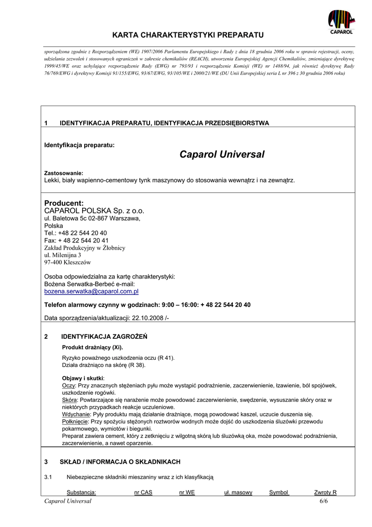 KARTA CHARAKTERYSTYKI PREPARATU sporządzona zgodnie z Rozporządzeniem (WE) 1907/2006 Parlamentu Europejskiego i Rady z dnia 18 grudnia 2006 roku w sprawie rejestracji, oceny, udzielania zezwoleń i stosowanych ograniczeń w zakresie chemikaliów (REACH), utworzenia Europejskiej Agencji Chemikaliów, zmieniające dyrektywę 1999/45/WE oraz uchylające rozporządzenie Rady (EWG) nr 793/93 i rozporządzenie Komisji (WE) nr 1488/94, jak również dyrektywę Rady 76/769/EWG i dyrektywy Komisji 91/155/EWG, 93/67/EWG, 93/105/WE i 2000/21/WE (DU Unii Europejskiej seria L nr 396 z 30 grudnia 2006 roku) 1 IDENTYFIKACJA PREPARATU, IDENTYFIKACJA PRZEDSIĘBIORSTWA Identyfikacja preparatu: Caparol Universal Zastosowanie: Lekki, biały wapienno-cementowy tynk maszynowy do stosowania wewnątrz i na zewnątrz. Producent: CAPAROL POLSKA Sp. z o.o. ul. Baletowa 5c 02-867 Warszawa, Polska Tel.: +48 22 544 20 40 Fax: + 48 22 544 20 41 Zakład Produkcyjny w Żłobnicy ul. Milenijna 3 97-400 Kleszczów Osoba odpowiedzialna za kartę charakterystyki: Bożena Serwatka-Berbeć e-mail: [email protected] Telefon alarmowy czynny w godzinach: 9:00 – 16:00: + 48 22 544 20 40 Data sporządzenia/aktualizacji: 22.10.2008 /2 IDENTYFIKACJA ZAGROŻEŃ Produkt drażniący (Xi). Ryzyko poważnego uszkodzenia oczu (R 41). Działa drażniąco na skórę (R 38). Objawy i skutki: Oczy: Przy znacznych stężeniach pyłu może wystąpić podrażnienie, zaczerwienienie, łzawienie, ból spojówek, uszkodzenie rogówki. Skóra: Powtarzające się narażenie może powodować zaczerwienienie, swędzenie, wysuszanie skóry oraz w niektórych przypadkach reakcje uczuleniowe. Wdychanie: Pyły produktu mają działanie drażniące, mogą powodować kaszel, uczucie duszenia się. Połknięcie: Przy spożyciu stężonych roztworów wodnych może dojść do uszkodzenia śluzówki przewodu pokarmowego, wymiotów i biegunki. Preparat zawiera cement, który z zetknięciu z wilgotną skórą lub śluzówką oka, może powodować podrażnienia, zaczerwienienie, a nawet oparzenie. 3 3.1 SKŁAD / INFORMACJA O SKŁADNIKACH Niebezpieczne składniki mieszaniny wraz z ich klasyfikacją Substancja: Caparol Universal nr CAS nr WE uł. masowy Symbol Zwroty R 6/6 KARTA CHARAKTERYSTYKI PREPARATU sporządzona zgodnie z Rozporządzeniem (WE) 1907/2006 Parlamentu Europejskiego i Rady z dnia 18 grudnia 2006 roku w sprawie rejestracji, oceny, udzielania zezwoleń i stosowanych ograniczeń w zakresie chemikaliów (REACH), utworzenia Europejskiej Agencji Chemikaliów, zmieniające dyrektywę 1999/45/WE oraz uchylające rozporządzenie Rady (EWG) nr 793/93 i rozporządzenie Komisji (WE) nr 1488/94, jak również dyrektywę Rady 76/769/EWG i dyrektywy Komisji 91/155/EWG, 93/67/EWG, 93/105/WE i 2000/21/WE (DU Unii Europejskiej seria L nr 396 z 30 grudnia 2006 roku) Cement portlandzki Wodorotlenek wapnia 65997-15-1 1305-62-0 266-043-4 215-137-3 > 10 - 25 >2,5 – 10 Xi Xi 38-41-43* 38-41 * patrz uwagi w punkcie 16 Pełne brzmienia zwrotów R podano w punkcie 15. karty charakterystyki. 4 4.1 PIERWSZA POMOC Instrukcje postępowania w zależności od drogi narażenia Wdychanie: Kontakt z oczami: Kontakt ze skórą: Połknięcie: Ogólne zalecenia: Wskazówki dla lekarza: 5 5.1 5.2 5.3 5.4 6 6.1 6.2 6.3 7 7.1 Wynieść poszkodowanego z miejsca narażenia, ułożyć w wygodnej pozycji półleżącej lub siedzącej, zapewnić spokój, chronić przed utratą ciepła. Jeżeli wystąpią zaburzenia oddychania, zastosować sztuczne oddychanie. Jeżeli objawy nie ustępują, wezwać lekarza. Natychmiast płukać dużą ilością letniej wody, najlepiej bieżącej, przez co najmniej 15 min. Usunąć szkła kontaktowe. Unikać silnego strumienia wody ze względu na ryzyko mechanicznego uszkodzenia rogówki. Jeżeli podrażnienie nie ustępuje, należy skonsultować się z lekarzem-okulistą. Obficie zmywać letnią, bieżącą wodą. Zdjąć zanieczyszczoną odzież. Jeśli podrażnienie nie ustępuje, zasięgnąć porady lekarza. Jeżeli nastąpi połknięcie, nie powodować wymiotów. Jeżeli poszkodowany jest przytomny, przepłukać usta wodą i podać do wypicia dużą ilość wody (2 – 3 szklanki) małymi porcjami. Powinny być przestrzegane zwykłe środki ostrożności jak przy pracy z chemikaliami. Jeżeli wystąpią jakiekolwiek niepokojące objawy, wezwać lekarza. Stosować leczenie objawowe POSTĘPOWANIE W PRZYPADKU POŻARU Zalecane środki gaśnicze Produkt nie palny. Pożar w otoczeniu należy gasić środkami odpowiednimi do palących się mediów. Pojemniki nie objęte pożarem, narażone na działanie ognia, chłodzić rozproszonym strumieniem wody. Zabronione środki gaśnicze Wszystkie środki gaśnicze są dozwolone. Niebezpieczne produkty rozkładu Nie są znane. Specjalistyczny sprzęt przeciwpożarowy Zakładać gazoszczelną odzież ochronną i aparaty oddechowe niezależne od powietrza z otoczenia. Wodę gaśniczą zbierać osobno, nie wylewać do kanalizacji. POSTĘPOWANIE W PRZYPADKU NIEZAMIERZONEGO UWOLNIENIA DO ŚRODOWISKA Zagrożenia dla zdrowia i środki ochrony ludzi Środki ostrożności: Uszkodzone opakowanie umieścić w opakowaniu zastępczym. Zebrać rozsypany produkt. Unikać kontaktu ze skórą i oczami, unikać wdychania pyłu. Stosować odzież ochronną i rękawice oraz okulary ochronne. Zagrożenia dla środowiska i środki ochrony środowiska Zabezpieczyć przed wprowadzeniem do miejskiego systemu wodno-kanalizacyjnego i cieków wodnych. Metody unieszkodliwiania, zbierania i oczyszczania środowiska Rozsypany produkt zebrać unikając wzbijania pyłu. Jeżeli to możliwe przeznaczyć do wykorzystania. Stwardniałe odpady traktować jak gruz budowlany. POSTĘPOWANIE Z PREPARATEM I JEGO MAGAZYNOWANIE Postępowanie z preparatem - środki ostrożności Wskazane jest podejmowanie środków ostrożności, aby podczas pracy z produktem unikać kontaktu ze skórą i Caparol Universal 6/6 KARTA CHARAKTERYSTYKI PREPARATU sporządzona zgodnie 