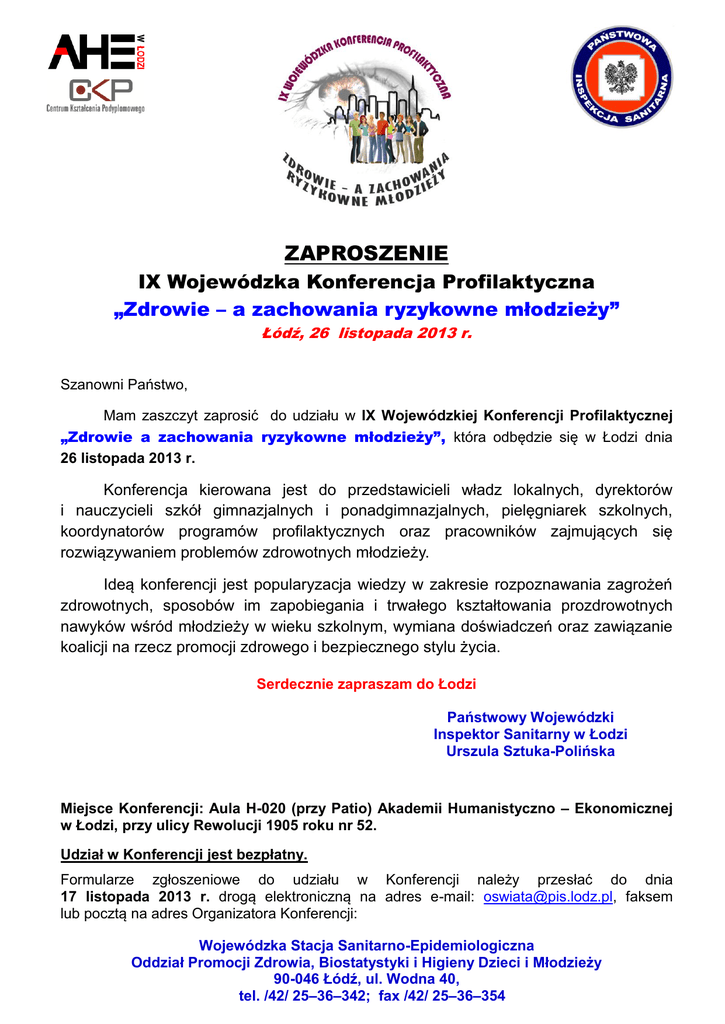 ZAPROSZENIE IX Wojewódzka Konferencja Profilaktyczna „Zdrowie – a zachowania ryzykowne młodzieży” Łódź, 26 listopada 2013 r. Szanowni Państwo, Mam zaszczyt zaprosić do udziału w IX Wojewódzkiej Konferencji Profilaktycznej „Zdrowie a zachowania ryzykowne młodzieży”, która odbędzie się w Łodzi dnia 26 listopada 2013 r. Konferencja kierowana jest do przedstawicieli władz lokalnych, dyrektorów i nauczycieli szkół gimnazjalnych i ponadgimnazjalnych, pielęgniarek szkolnych, koordynatorów programów profilaktycznych oraz pracowników zajmujących się rozwiązywaniem problemów zdrowotnych młodzieży. Ideą konferencji jest popularyzacja wiedzy w zakresie rozpoznawania zagrożeń zdrowotnych, sposobów im zapobiegania i trwałego kształtowania prozdrowotnych nawyków wśród młodzieży w wieku szkolnym, wymiana doświadczeń oraz zawiązanie koalicji na rzecz promocji zdrowego i bezpiecznego stylu życia. Serdecznie zapraszam do Łodzi Państwowy Wojewódzki Inspektor Sanitarny w Łodzi Urszula Sztuka-Polińska Miejsce Konferencji: Aula H-020 (przy Patio) Akademii Humanistyczno – Ekonomicznej w Łodzi, przy ulicy Rewolucji 1905 roku nr 52. Udział w Konferencji jest bezpłatny. Formularze zgłoszeniowe do udziału w Konferencji należy przesłać do dnia 17 listopada 2013 r. drogą elektroniczną na adres e-mail: [email protected], faksem lub pocztą na adres Organizatora Konferencji: Wojewódzka Stacja Sanitarno-Epidemiologiczna Oddział Promocji Zdrowia, Biostatystyki i Higieny Dzieci i Młodzieży 90-046 Łódź, ul. Wodna 40, tel. /42/ 25–36–342; fax /42/ 25–36–354