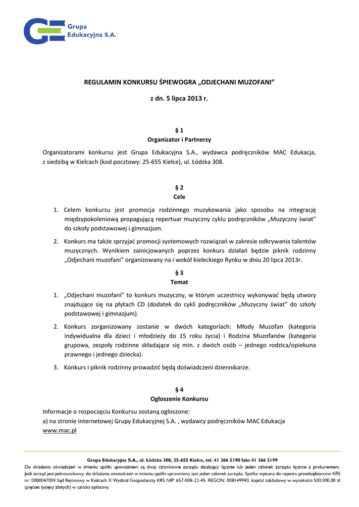 REGULAMIN KONKURSU ŚPIEWOGRA „ODJECHANI MUZOFANI” z dn. 5 lipca 2013 r. §1 Organizator i Partnerzy Organizatorami konkursu jest Grupa Edukacyjna S.A., wydawca podręczników MAC Edukacja, z siedzibą w Kielcach (kod pocztowy: 25-655 Kielce), ul. Łódzka 308. §2 Cele 1. Celem konkursu jest promocja rodzinnego muzykowania jako sposobu na integrację międzypokoleniową propagującą repertuar muzyczny cyklu podręczników „Muzyczny świat” do szkoły podstawowej i gimnazjum. 2. Konkurs ma także sprzyjać promocji systemowych rozwiązań w zakresie odkrywania talentów muzycznych. Wynikiem zainicjowanych poprzez konkurs działań będzie piknik rodzinny „Odjechani muzofani” organizowany na i wokół kieleckiego Rynku w dniu 20 lipca 2013r. §3 Temat 1. „Odjechani muzofani” to konkurs muzyczny, w którym uczestnicy wykonywać będą utwory znajdujące się na płytach CD (dodatek do cykli podręczników „Muzyczny świat” do szkoły podstawowej i gimnazjum). 2. Konkurs zorganizowany zostanie w dwóch kategoriach: Młody Muzofan (kategoria indywidualna dla dzieci i młodzieży do 15 roku życia) i Rodzina Muzofanów (kategoria grupowa, zespoły rodzinne składające się min. z dwóch osób – jednego rodzica/opiekuna prawnego i jednego dziecka). 3. Konkurs i piknik rodzinny prowadzić będą doświadczeni dziennikarze. §4 Ogłoszenie Konkursu Informacje o rozpoczęciu Konkursu zostaną ogłoszone: a) na stronie internetowej Grupy Edukacyjnej S.A. , wydawcy podręczników MAC Edukacja www.mac.pl b) na stronie internetowej Festiwalu Harcerskiego www.festiwal-kielce.zhp.pl c) poprzez media, do których będzie rozesłana stosowna informacja prasowa. §5 Uczestnicy 1. Uczestnikami warsztatów i konkursu mogą być wyłącznie wokalni amatorzy, tj. osoby, które do dnia 15 lipca 2013 roku nie szkoliły swoich umiejętności muzycznych w szkołach muzycznych, w ogniskach muzycznych, w domach kultury lub w innych tego typu instytucjach – na dowód czego rodzic/opiekun prawny składa do dnia 18.07.2013 r. oświadczenie, iż zgłoszony uczestnik nie uczęszczał(a) na zajęcia wokalne w szkole muzycznej, w ognisku muzycznym, w domu kultury lub w innej tego typu instytucji. 2. Konkurs odbędzie się w dwóch kategoriach: - Młody Muzofan - kategoria indywidualna dla dzieci i młodzieży do 15 roku życia włącznie (uczestniczyć w niej mogą dzieci i młodzież urodzone po 20 lipca 1997 r.) - Rodzina Muzofanów - kategoria grupowa – zespoły rodzinne składające się z minimum dwóch osób, jednego rodzica/opiekuna prawnego i jednego dziecka do 18-go roku życia (tj. urodzonego po 20 lipca 1995 r.) 3. W kategorii indywidualnej istnieją dwa sposoby zgłoszenia swojego udziału w konkursie: poprzez preselekcję i warsztaty dla uczestników w Domu Kultury Zameczek albo poprzez zgłoszenie bezpośrednie do Grupy Edukacyjnej. 4. Preselekcja uczestników, w kategorii indywidualnej, odbędzie się w dniu 15 lipca 2013 r. od godz. 10.00 w Domu Kultury Zameczek (sala Kameralna), ul. J. Słowackiego 23 w Kielcach. Zgłoszenia na preselekcję zawierające dane osobowe: imię, nazwisko adres, telefon i e-mail oraz zgodę na przetwarzanie tych danych osobowych przez Grupę Edukacyjną S.A. przyjmowane będą do 12.07.213 r. (włącznie) na adres mailowy: [email protected] lub pod nr telefonu: 41/ 361 39 31. Wszyscy uczestnicy powinni przekazać podczas preselekcji kompletne zgłoszenie uregulowane w par. 6 pkt.1 a. i b. Podczas preselekcji zostaną wyłonieni uczestnicy letnich warsztatów wokalnych prowadzonych pod kierunkiem p. Artura Telusa (instruktora muzycznego DK Zameczek) w terminach 16.07.13, 17.07.13 i 22.07.13 od godz. 10.00 w Sali Kameralnej DK Zameczek. W dniu 20 lipca 2013 r. (sobota) na kieleckim Rynku w konkursie-śpiewogrze „Odjechani muzofani” wezmą udział uczestnicy letnich warsztatów wokalnych. 5. Zgłoszenia bezpośrednie do Grupy Edukacyjnej S.A. uregulowane są w par. 6. §6 Zasady zgłaszania do konkursu Uczestnicy konkursu dokonują bezpośredniego zgłoszenia do konkursu wypełniając: 1. kartę zgłoszenia do konkursu zawierającą dane osobowe uczestnika/uczestników: imię, nazwisko adres, telefon i e-mail oraz zgodę na przetwarzanie tych danych osobowych przez Grupę Edukacyjną S.A. oraz tytuł wybranego utworu – WZÓR W ZAŁĄCZNIKU NR 1 DO REGULAMINU (w kategorii grupowej uczestnicy wypełniają jedną kartę zgłoszenia podając dane wszystkich wykonawców) Do karty zgłoszenia do konkursu należy dołączyć: a. zgodę uczestników lub rodziców/opiekunów prawnych niepełnoletnich uczestników konkursu na przetwarzanie przez organizatora ich danych osobowych na potrzeby konkursu oraz wykorzystanie wizerunku na potrzeby konkursu oraz działań marketingowych Grupy Edukacyjnej SA- WZÓR W ZAŁĄCZNIKU NR 2 DO REGULAMINU; b. oświadczenie o amatorstwie wokalnym – WZÓR W ZAŁACZNIKU NR 3 DO REGULAMINU Powyżej określoną dokumentację zgłoszeniową należy przesłać pocztą lub doręczyć osobiście do Biura Konkursu (adres: Grupa Edukacyjna S.A., ul. Łódzka 308, 25-655 Kielce, II budynek, pokój nr 9) czynnego w dni robocze w godz. 7.30-15.30 w terminie do 18 lipca 2013 r. Organizator zastrzega, iż w przypadku dużej ilości zgłoszeń zorganizuje preselekcję w dniu 19 lipca 2013 r. od godz. 10.00 w swoim budynku mieszczącym się na ul. Jagiellońskiej 74 w Kielcach, sala konferencyjna nr 13, poziom -1. O terminie przesłuchań uczestnicy powiadomieni zostaną drogą mailową i/lub telefoniczną. Jednocześnie w przypadku mniejszej niż spodziewana ilości dokonanych zgłoszeń bezpośrednich Organizator może przedłużyć termin ich dokonywania, maksymalnie do 20 lipca 2013r. do godz. 14.00. §7 Zasady przyznawania nagród 1. Wyboru laureatów w konkursie dokona Jury Konkursu w dniu 20 lipca 2013 roku Jury Konkursu będzie obradować w składzie co najmniej czterech specjalistów wskazanych przez Organizatora. 2. Jury wyłania