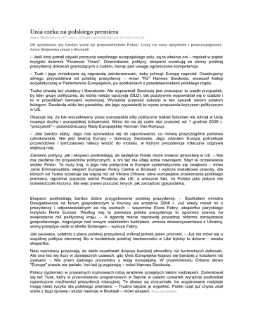 Unia czeka na polskiego premiera Anna Słojewska 01-07-2011, ostatnia aktualizacja 02-07-2011 01:30 UE spodziewa się bardzo wiele po przewodnictwie Polski. Liczy na nasz optymizm i proeuropejskość. Anna Słojewska pisze z Brukseli – Jeśli ktoś potrafi ożywić poczucie wspólnego europejskiego celu, są to właśnie oni – napisał w piątek brytyjski dziennik "Financial Times". Dziennikarze, politycy, eksperci oczekują ze strony polskiej prezydencji dokonań graniczących z cudem, biorąc pod uwagę ograniczone kompetencje. – Tusk i jego ministrowie są naprawdę zainteresowani, żeby pchnąć Europę naprzód. Oczekujemy silnego przywództwa od polskiej prezydencji – mówi "Rz" Hannes Swoboda, wiceszef frakcji socjalistycznej w Parlamencie Europejskim, po spotkaniach z przedstawicielami polskiego rządu. Tuska chwalą też chadecy i liberałowie. Ale wypowiedź Swobody jest znacząca: to rzadki przypadek, by lider grupy politycznej, do której należy opozycja (SLD), tak pozytywnie wypowiadał się o rządzie i to w przeddzień kampanii wyborczej. Wyraźnie przecież szkodzi w ten sposób swoim polskim kolegom. Swoboda widzi ten paradoks, ale jego wypowiedź to wyraz zmęczenia kryzysem politycznym w UE. Okazuje się, że tak wyczekiwany przez europejskie elity polityczne traktat lizboński nie tchnął w Unię nowego ducha i europejskiej tożsamości. Mimo że na jej czele stoi przecież od 1 grudnia 2009 r. "prezydent" – przewodniczący Rady Europejskiej Herman Van Rompuy. – Jest bardzo słaby. Jego rola sprowadza się do raportowania, co mówią poszczególne państwa członkowskie. Nie jest twarzą Europy – tłumaczy Swoboda. Jego zdaniem Europa potrzebuje przywództwa i tymczasowo należy wrócić do modelu, w którym prezydencja rotacyjna odgrywa większą rolę. Zarówno politycy, jak i eksperci podkreślają, że nadejście Polski może zmienić atmosferę w UE. – Nie ma zaufania do przywódców politycznych, a oni też nie ufają sobie nawzajem. Stąd te oczekiwania wobec Polski. To duży kraj, a jego rola polityczna w Europie systematycznie się zwiększa – mówi Janis Emmanouilidis, ekspert European Policy Centre w Brukseli. I wylicza dodatkowe powody, dla których od Tuska oczekuje się więcej niż od Viktora Orbana: silne europejskie przekonania polskiego premiera, ogromne poparcie wśród Polaków dla UE, a wreszcie fakt, że Polska jako jedyna nie doświadczyła kryzysu. Ma więc prawo pouczać innych, jak zarządzać gospodarką. Eksperci podkreślają bardzo dobre przygotowanie polskiej prezydencji. – Spotkałam ministra Dowgielewicza na forum gospodarczym w Krynicy we wrześniu 2008 r. Już wtedy mówił mi o prezydencji i odpowiedzialnych za nią osobach – wspomina Elvire Fabry, ekspertka paryskiego instytutu Notre Europe. Według niej ta pierwsza polska prezydencja to ogromna szansa na zwiększenie roli politycznej kraju. – A agendę macie naprawdę poważną: reforma zarządzania gospodarczego, negocjacje nad nowym wieloletnim budżetem, umowa stowarzyszeniowa z Ukrainą, wolny przepływ osób w strefie Schengen – wylicza Fabry. Jak zauważa, ostatnio z planu polskiej prezydencji zniknął jednak jeden priorytet. – Już nie mówi się o wspólnej polityce obronnej. Bo w kontekście polskiej nieobecności w Libii byłoby to dziwne – uważa ekspertka. Nasi rozmówcy przyznają, że wiele oczekiwań dotyczy bardziej atmosfery niż konkretnych dokonań. Ale ona też się liczy w dzisiejszych czasach, gdy Unia Europejska kojarzy się bardziej z kosztami niż zyskami. – Nie znam żadnego przywódcy z wizją europejską. W przemówieniu Orbana słowo "Europa" prawie nie padało, inni też ją wypierają – mówi Hannes Swoboda. Polscy dyplomaci w prywatnych rozmowach robią wrażenie przejętych takimi nadziejami. Zorientował się też Tusk, który w przemówieniu programowym w Sejmie w ostatni czwartek wyraźnie podkreślał ograniczone możliwości prezydencji rotacyjnej. Te obawy są zrozumiałe, bo wygórowane nadzieje mogą nieść ryzyko dla polskiego premiera. – Trudno będzie je wypełnić. Polski rząd już chyba zdał sobie z tego sprawę i studzi nastroje w Brukseli – mówi ekspert. Rzeczpospolita
