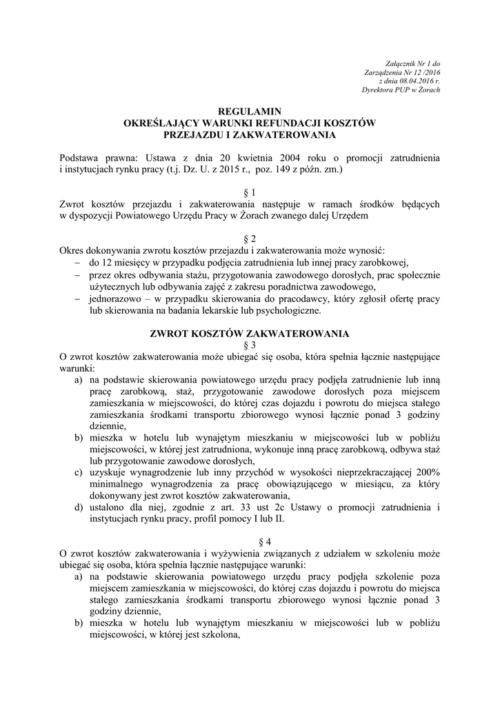 Załącznik Nr 1 do Zarządzenia Nr 12 /2016 z dnia 08.04.2016 r. Dyrektora PUP w Żorach REGULAMIN OKREŚLAJĄCY WARUNKI REFUNDACJI KOSZTÓW PRZEJAZDU I ZAKWATEROWANIA Podstawa prawna: Ustawa z dnia 20 kwietnia 2004 roku o promocji zatrudnienia i instytucjach rynku pracy (t.j. Dz. U. z 2015 r., poz. 149 z późn. zm.) §1 Zwrot kosztów przejazdu i zakwaterowania następuje w ramach środków będących w dyspozycji Powiatowego Urzędu Pracy w Żorach zwanego dalej Urzędem §2 Okres dokonywania zwrotu kosztów przejazdu i zakwaterowania może wynosić: do 12 miesięcy w przypadku podjęcia zatrudnienia lub innej pracy zarobkowej, przez okres odbywania stażu, przygotowania zawodowego dorosłych, prac społecznie użytecznych lub odbywania zajęć z zakresu poradnictwa zawodowego, jednorazowo – w przypadku skierowania do pracodawcy, który zgłosił ofertę pracy lub skierowania na badania lekarskie lub psychologiczne. ZWROT KOSZTÓW ZAKWATEROWANIA §3 O zwrot kosztów zakwaterowania może ubiegać się osoba, która spełnia łącznie następujące warunki: a) na podstawie skierowania powiatowego urzędu pracy podjęła zatrudnienie lub inną pracę zarobkową, staż, przygotowanie zawodowe dorosłych poza miejscem zamieszkania w miejscowości, do której czas dojazdu i powrotu do miejsca stałego zamieszkania środkami transportu zbiorowego wynosi łącznie ponad 3 godziny dziennie, b) mieszka w hotelu lub wynajętym mieszkaniu w miejscowości lub w pobliżu miejscowości, w której jest zatrudniona, wykonuje inną pracę zarobkową, odbywa staż lub przygotowanie zawodowe dorosłych, c) uzyskuje wynagrodzenie lub inny przychód w wysokości nieprzekraczającej 200% minimalnego wynagrodzenia za pracę obowiązującego w miesiącu, za który dokonywany jest zwrot kosztów zakwaterowania, d) ustalono dla niej, zgodnie z art. 33 ust 2c Ustawy o promocji zatrudnienia i instytucjach rynku pracy, profil pomocy I lub II. §4 O zwrot kosztów zakwaterowania i wyżywienia związanych z udziałem w szkoleniu może ubiegać się osoba, która spełnia łącznie następujące warunki: a) na podstawie skierowania powiatowego urzędu pracy podjęła szkolenie poza miejscem zamieszkania w miejscowości, do której czas dojazdu i powrotu do miejsca stałego zamieszkania środkami transportu zbiorowego wynosi łącznie ponad 3 godziny dziennie, b) mieszka w hotelu lub wynajętym mieszkaniu w miejscowości lub w pobliżu miejscowości, w której jest szkolona, c) ustalono dla niej, zgodnie z art. 33 ust 2c ustawy o promocji zatrudnienia i instytucjach rynku pracy profil pomocy I lub II. ZWROT KOSZTÓW PRZEJAZDU §5 O zwrot kosztów przejazdu do miejsca zatrudnienia, innej pracy zarobkowej, odbywania stażu, przygotowania zawodowego dorosłych, zajęć z zakresu poradnictwa zawodowego, do pracodawcy zgłaszającego ofertę pracy, na badania lekarskie lub psychologiczne, do miejsca wykonywania prac społecznie użytecznych może ubiegać się osoba, której ustalono zgodnie z art. 33 ust. c Ustawy z dnia 20 kwietnia 2004 r. o promocji zatrudnienia i instytucjach rynku pracy: II profil pomocy, w uzasadnionych przypadkach I profil pomocy, w ramach programu specjalnego lub PAI – III profil pomocy. §6 O zwrot kosztów przejazdu do miejsca zatrudnienia, innej pracy zarobkowej, odbywania stażu, przygotowania zawodowego dorosłych, zajęć z zakresu poradnictwa zawodowego może ubiegać się osoba, która spełnia łącznie następujące warunki: a) na podstawie skierowania powiatowego urzędu pracy podjęła zatrudnienie lub inną pracę zarobkową, staż, przygotowanie zawodowe dorosłych, zajęcia z zakresu poradnictwa zawodowego i dojeżdża do tych miejsc, b) uzyskuje wynagrodzenie lub inny przychód w wysokości nieprzekraczającej 200% minimalnego wynagrodzenia za pracę. 1. 2. 3. 1. 2. §7 W przypadku skierowania bezrobotnego do pracodawcy, który zgłosił ofertę pracy, a siedziba tego pracodawcy znajduje się poza miejscem zamieszkania bezrobotnego, powiatowy urząd pracy może zwrócić bezrobotnemu koszt przejazdu do pracodawcy i powrotu do miejsca zamieszkania. Zwrot kosztów z tytułu przejazdu do pracodawcy będzie przyznawany po złożeniu wniosku wraz z oryginałami jednostkowych biletów najtańszym środkiem komunikacji zbiorowej na danej trasie, w okresie obejmującym ważnością dzień zgłoszenia się do pracodawcy i wynosić będzie 100% poniesionego kosztu. Zwrot kosztów może nastąpić tylko w przypadku złożenia w urzędzie rozliczonego skierowania, potwierdzonego przez pracodawcę. §8 Urząd może dokonać zwrotu kosztów przejazdu na badania lekarskie lub psychologiczne i powrotu do miejsca zamieszkania, jeżeli na badania te bezrobotny został skierowany przez powiatowy urząd pracy i dojeżdża do tych miejsc. Zwrot nie przysługuje w przypadku, gdy miejsce wykonania badań znajduje się na terenie Miasta Żory. Urząd może dokonać na zasadach określonych w pkt 1 zwrotu kosztów przejazdu na badania lekarskie lub psychologiczne: a) osobie poszukującej pracy, która: jest w okresie wypowiedzenia stosunku pracy lub stosunku służbowego z przyczyn dotyczących zakładu pracy, jest zatrudniony u pracodawcy, wobec którego ogłoszono upadłość lub który jest w stanie likwidacji, z wyłączeniem likwidacji w celu prywatyzacji, otrzymuje świadczenie socjalne przysługujące na urlopie górniczym lub górniczy zasiłek socjalny, określone w odrębnych przepisach, uczestniczy w zajęciach w Centrum Integracji Społecznej lub indywidualnym programie integracji, o którym mowa w przepisach o pomocy społecznej, jest żołnierzem rezerwy, pobiera rentę szkoleniową, pobiera świadczenie szkoleniowe, o którym mowa w art. 70 ust. 6 ustawy o promocji zatrudnienia i instytucjach rynku pracy, podlega ubezpieczeniu społecznemu rolników w pełnym zakresie na podstawie przepisów o ubezpieczeniu społecznym rolników jako domownik lub małżonek rolnika, jeżeli zamierza podj