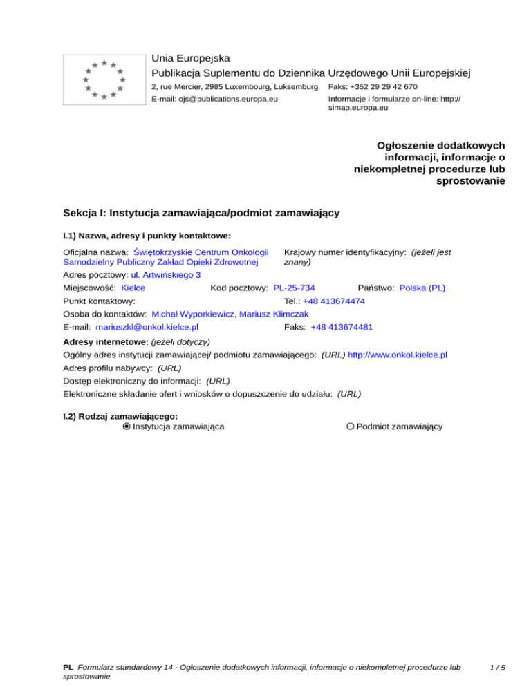 Unia Europejska Publikacja Suplementu do Dziennika Urzędowego Unii Europejskiej 2, rue Mercier, 2985 Luxembourg, Luksemburg Faks: +352 29 29 42 670 E-mail: [email protected] Informacje i formularze on-line: http:// simap.europa.eu Ogłoszenie dodatkowych informacji, informacje o niekompletnej procedurze lub sprostowanie Sekcja I: Instytucja zamawiająca/podmiot zamawiający I.1) Nazwa, adresy i punkty kontaktowe: Oficjalna nazwa: Świętokrzyskie Centrum Onkologii Samodzielny Publiczny Zakład Opieki Zdrowotnej Krajowy numer identyfikacyjny: (jeżeli jest znany) _____ Adres pocztowy: ul. Artwińskiego 3 Miejscowość: Kielce Kod pocztowy: PL-25-734 Punkt kontaktowy: _____ Państwo: Polska (PL) Tel.: +48 413674474 Osoba do kontaktów: Michał Wyporkiewicz, Mariusz Klimczak E-mail: [email protected] Faks: +48 413674481 Adresy internetowe: (jeżeli dotyczy) Ogólny adres instytucji zamawiającej/ podmiotu zamawiającego: (URL) http://www.onkol.kielce.pl Adres profilu nabywcy: (URL) _____ Dostęp elektroniczny do informacji: (URL) _____ Elektroniczne składanie ofert i wniosków o dopuszczenie do udziału: (URL) _____ I.2) Rodzaj zamawiającego: Instytucja zamawiająca Podmiot zamawiający PL Formularz standardowy 14 - Ogłoszenie dodatkowych informacji, informacje o niekompletnej procedurze lub sprostowanie 1/5 Sekcja II: Przedmiot zamówienia II.1.1) Nazwa nadana zamówieniu: Zakup rezonansu magnetycznego 3T wraz z uruchomieniem Pracowni Rezonansu Magnetycznego w Świętokrzyskim Centrum Onkologii w Kielcach II.1.2) Krótki opis zamówienia lub zakupu: (podano w pierwotnym ogłoszeniu) Przedmiotem zamówienia jest Zakup rezonansu magnetycznego 3T wraz z uruchomieniem Pracowni Rezonansu Magnetycznego w Świętokrzyskim Centrum Onkologii w Kielcach. Sprzęt fabrycznie nowy, rok produkcji nie wcześniej niż 2015 II.1.3) Wspólny Słownik Zamówień (CPV) Główny przedmiot Słownik główny 33100000 Słownik uzupełniający (jeżeli dotyczy) PL Formularz standardowy 14 - Ogłoszenie dodatkowych informacji, informacje o niekompletnej procedurze lub sprostowanie 2/5 Sekcja IV: Procedura IV.1)Rodzaj procedury (podano w pierwotnym ogłoszeniu) Otwarta Ograniczona Ograniczona przyspieszona Negocjacyjna Negocjacyjna przyspieszona Dialog konkurencyjny Negocjacyjna z uprzednim ogłoszeniem Negocjacyjna bez uprzedniego ogłoszenia Negocjacyjna z publikacją ogłoszenia o zamówieniu Negocjacyjna bez publikacji ogłoszenia o zamówieniu Udzielenie zamówienia bez uprzedniej publikacji ogłoszenia o zamówieniu w Dzienniku Urzędowym Unii Europejskiej IV.2)Informacje administracyjne IV.2.1)Numer referencyjny: (podano w pierwotnym ogłoszeniu) AZP 241-115/15 IV.2.2)Dane referencyjne ogłoszenia w przypadku ogłoszeń przesłanych drogą elektroniczną: Pierwotne ogłoszenie przesłane przez eNotices TED eSender Login: ENOTICES_SPZOZ-SCO Dane referencyjne ogłoszenia: 2015-110853 rok i numer dokumentu IV.2.3)Ogłoszenie, którego dotyczy niniejsza publikacja: Numer ogłoszenia w Dz.U.: 2015/S 161-294735 z dnia: 21/08/2015 (dd/mm/rrrr) IV.2.4)Data wysłania pierwotnego ogłoszenia: 19/08/2015 (dd/mm/rrrr) PL Formularz standardowy 14 - Ogłoszenie dodatkowych informacji, informacje o niekompletnej procedurze lub sprostowanie 3/5 Sekcja VI: Informacje uzupełniające VI.1) Ogłoszenie dotyczy: Procedury niepełnej Sprostowania Informacji dodatkowych VI.2) Informacje na temat niepełnej procedury udzielenia zamówienia: Postępowanie o udzielenie zamówienia zostało przerwane Postępowanie o udzielenie zamówienia uznano za nieskuteczne Zamówienia nie udzielono Zamówienie może być przedmiotem ponownej publikacji VI.3) Informacje do poprawienia lub dodania : VI.3.1) Zmiana oryginalnej informacji podanej przez instytucję zamawiającą Publikacja w witrynie TED niezgodna z oryginalną informacją, przekazaną przez instytucję zamawiającą Oba przypadki VI.3.2) W ogłoszeniu pierwotnym W odpowiedniej dokumentacji przetargowej (więcej informacji w odpowiedniej dokumentacji przetargowej) W obu przypadkach (więcej informacji w odpowiedniej dokumentacji przetargowej) VI.3.3) Tekst, który należy poprawić w pierwotnym ogłoszeniu Miejsce, w którym znajduje się Zamiast: Powinno być: zmieniany tekst: 1) Opłacona polisa wraz z kopią 1) Opłacona polisa wraz z III..2.2) Zdolność ekonomiczna i potwierdzenia przelewu bankowego, dokumentem potwierdzającym a w przypadku jej braku innego opłacenie polisy, a w przypadku finansowa dokumentu potwierdzającego, że jej braku innego dokumentu wykonawca jest ubezpieczony potwierdzającego, że od odpowiedzialności cywilnej wykonawca jest ubezpieczony wraz z kopią potwierdzenia od odpowiedzialności cywilnej przelewu bankowego w zakresie wraz z kopią potwierdzenia prowadzonej działalności związanej opłacenia polisy w zakresie z przedmiotem zamówienia na kwotę prowadzonej działalności związanej nie mniejszą niż 5.000.000,00 zł. z przedmiotem zamówienia na kwotę 2) Informacja z banku lub nie mniejszą niż 5.000.000,00 zł. spółdzielczej kasy oszczędnościowo 2) Informacja z banku lub - kredytowej, w których wykonawca spółdzielczej kasy oszczędnościowo posiada rachunek, potwierdzająca - kredytowej, w których wykonawca wysokość posiadanych środków posiada rachunek, potwierdzająca finansowych lub zdolność kredytową wysokość posiadanych środków wykonawcy, wystawiona nie finansowych lub zdolność kredytową wcześniej niż 3 miesiące przed wykonawcy, wystawiona nie upływem terminu składania ofert na wcześniej niż 3 miesiące przed kwotę nie mniejszą niż 5.000.000,00 upływem terminu składania ofert na zł. kwotę nie mniejszą niż 5.000.000,00 zł. VI.3.4) Daty, które należy poprawić w pierwotnym ogłoszeniu PL Formularz standardowy 14 - Ogłoszenie dodatkowych informacji, informacje o niekompletnej procedurze lub sprostowanie 4/5 Miejsce, w którym znajdują się zmieniane daty: Zamiast: Powinno być: VI.3.5) Adre