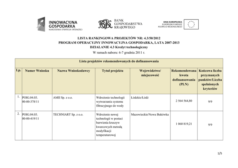 LISTA RANKINGOWA PROJEKTÓW NR: 4.3/50/2012 PROGRAM OPERACYJNY INNOWACYJNA GOSPODARKA, LATA 2007-2013 DZIAŁANIE 4.3 Kredyt technologiczny W ramach naboru: 6-7 grudnia 2011 r. Lista projektów rekomendowanych do dofinansowania Lp. Numer Wniosku Nazwa Wnioskodawcy 1. POIG.04.03. 00-00-378/11 AMII Sp. z o.o. 2. POIG.04.03. 00-00-419/11 TECHNIART Sp. z o.o. Tytuł projektu Województwo/ miejscowość Wdrożenie technologii wytwarzania systemu filtracyjnego do wody Łódzkie/Łódź Wdrożenie nowej technologii w postaci barwienia kruszyw kwarcowych metodą modyfikacji temperaturowej Mazowieckie/Nowa Bukówka Rekomendowana Końcowa liczba kwota przyznanych dofinansowania punktów/Liczba (PLN) spełnionych kryteriów 2 564 564,80 9/9 1 060 819,21 9/9 1/5 3. POIG.04.03. 00-00-471/11 P.H.U. „MIMAR” Stanisław Szczerba Wdrożenie nowoczesnej technologii produkcji mebli modułowych na bazie płyty komórkowej Mazowieckie/Warszawa 4. POIG.04.03. 00-00-472/11 Przedsiębiorstwo Produkcyjne Heiztechnik Sp. z o.o. Wdrożenie nowej technologii produkcji kotłów grzewczych Pomorskie/Skarszewy 5. POIG.04.03. 00-00-503/11 KORNIK Firma Stolarska. Produkcja i usługi Tadeusz Wizła Wdrożenie nowej technologii produkcji stolarki drzwiowej z drewna klejonego warstwowo Wielkopolskie/Tarnowo Podgórne Przedsiębiorstwo Produkcyjne MARGOMED Stanisław Margol Wdrożenie nowej technologii wytwarzania strzykawek dwuczęściowych jednorazowego użytku Lubelskie/Lublin Towarzystwo Handlowe „ALPLAST” Spółka Jawna A. Bąk i Spółka Wdrożenie technologii separacji wybranych urządzeń wewnętrznych komputerów stacjonarnych i mobilnych Zachodniopomorskie/ Kołobrzeg 6. POIG.04.03. 00-00-509/11 7. POIG.04.03. 00-00-510/11 8. POIG.04.03. 00-00-536/11 WALCZAK Spółka Jawna Wdrożenie innowacyjnej Wielkopolskie/Książ technologii sortowania i Wielkopolski obróbki półfabrykatów na deski podłogowe 682 900,00 9/9 3 600 00,00 9/9 2 620 783,67 9/9 4 000 000,00 9/9 380 400,00 9/9 465 000,00 9/9 2/5 9. POIG.04.03. 00-00-586/11 Zakład Produkcji Folii Efekt Plus Sp. z o.o. Wdrożenie nowej Podkarpackie/Rzeszów technologii produkcji folii mikrostretch w firmie Efekt Plus 4 000 000,00 9/9 10. POIG.04.03. 00-00-616/11 B&M Optik Sp. z o.o. Technologia wytwarzania Podkarpackie/Zaczernie elementów optyki instrumentalnej z trudnych do obrabiania rodzajów szkła 794 250,00 9/9 1 562 400,00 9/9 2 867 326,00 9/9 11. POIG.04.03. 00-00-617/11 Silvan Sp. z o.o. 12. POIG.04.03. 00-00-621/11 „WOBI-STAL” Sp. z o.o. 13. POIG.04.03. 00-00-633/11 „KRY-WO" P.P.H.U. Spółka Jawna Wojciech Kędzierski, Krystyna Paszkiewicz, Magdalena Kędzierska, Andrzej Paszkiewicz Wzrost konkurencyjności Łódzkie/Łódź firmy KRY-WO dzięki wdrożeniu nowej technologii barwienia wyrobów pończoszniczych 1 326 160,00 9/9 Leo Minor Wojciech Bąk Wdrożenie przez firmę Podkarpackie/Rzeszów LEO MINOR technologii otrzymywania systemów wentylacyjnych i kanalizacyjnych 1 196 020,00 9/9 14. POIG.04.03. 00-00-634/11 Wdrożenie nowej technologii strugania, profilowania i strukturyzacji drewna Warmińsko-mazurskie/Jaśki Wdrożenie innowacyjnej technologii produkcji konstrukcji stalowych w Spółce WOBI-STAL Podkarpackie/Stalowa Wola 3/5 15. POIG.04.03. 00-00-638/11 Q4GLASS, ABJ Investors Spółka z ograniczoną odpowiedzialnością Spółka Komandytowa Wdrożenie w firmie Q4GLASS innowacyjnej technologii produkcji szkła ognioodpornego Zachodniopomorskie/ Koszalin 16. POIG.04.03. 00-00-646/11 Przedsiębiorstwo Wielobranżowe "NORD-OST" Sp. z o.o. Wdrożenie nowej technologii produkcji elementów wypełniających ze strukturalnej płyty kartonowej Warmińsko-mazurskie/ Gołdap Wdrożenie innowacyjnej technologii produkcji metalowej stolarki budowlanej z profili ocynkowanych ogniowo Mazowieckie/Płochocin Laserowa technologia przygotowania progów rezonansowych w procesie produkcji fortepianów Wielkopolskie/Kalisz Maszynowa technologia wykończenia lakierniczego drewnianej powierzchni meblowej "na półotwarte pory" Wielkopolskie/Kalisz 17. POIG.04.03. 00-00-653/11 18. POIG.04.03. 00-00-708/11 19. POIG.04.03. 00-00-710/11 JAKRA Sp. z o.o. Firma „PIANO-FIKS” Krzysztof Fiks Firma „PIANO-FIKS” Krzysztof Fiks 786 600,00 9/9 2 950 143,59 9/9 1 692 500,00 9/9 3 769 104,00 9/9 2 404 068,00 9/9 4/5 20. POIG.04.03. 00-00-743/11 FP Wenglon Sp. z o.o. Spółka komandytowa RAZEM Technologia produkcji ortopedycznych narzędzi kompozytowych, z zastosowaniem wyżarzania zapewniająca stabilność wymiarowokształtową Zachodniopomorskie/Szczecin 4 000 000,00 9/9 42 723 039,27 5/5