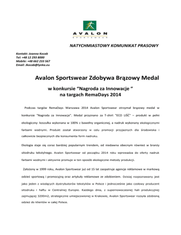 NATYCHMIASTOWY KOMUNIKAT PRASOWY Kontakt: Joanna Kocab Tel: +48 12 293 8000 Mobile: +48 662 233 567 Email: [email protected] Avalon Sportswear Zdobywa Brązowy Medal w konkursie “Nagroda za Innowacje ” na targach RemaDays 2014 Podczas targów RemaDays Warszawa 2014 Avalon Sportswear otrzymał brązowy medal w konkursie "Nagroda za Innowacje". Medal przyznano za T-shirt "ECO LIŚĆ" – produkt w pełni ekologiczny: koszulka wykonana w 100% z bawełny organicznej, a nadruk wykonany ekologicznymi farbami wodnymi. Produkt został stworzony w celu promocji przyjaznych dla środowiska i całkowicie bezpiecznych dla konsumenta form nadruku. Ekologia staje się coraz bardziej popularnym trendem, od niedawna obecnym również w branży sitodruku tekstylnego. Avalon Sportswear od początku 2014 roku wprowadza do oferty nadruk farbami wodnymi i aktywnie promuje w ten sposób ekologiczne metody produkcji. Założony w 1999 roku, Avalon Sportswear już od 15 lat zaopatruje agencje reklamowe w markową odzież sportową i promocyjną oraz artykuły reklamowe ze zdobieniem. Dzisiaj rozpoznawany jest jako jeden z wiodących dystrybutorów tekstyliów w Polsce i jednocześnie jako czołowy producent sitodruku i haftu w Centralnej Europie. Każdego dnia, z supernowoczesnej hali produkcyjnej zajmującej 3200m2, strategicznie umiejscowionej w Krakowie, Avalon Sportswear rozsyła zdobioną odzież do klientów w całej Polsce. Avalon Sportswear na Targach RemaDays 2014