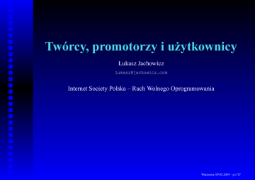 Twórcy, promotorzy i użytkownicy Łukasz Jachowicz [email protected] Internet Society Polska – Ruch Wolnego Oprogramowania Warszawa, 09.03.2004 – p.1/?? Cztery wolnośći • • • • Wolność uruchamiania Wolność badania działania Wolność dystrybucji Wolność poprawiania i rozpowszechniania poprawek Warszawa, 09.03.2004 – p.2/?? Co za tym idzie? • • • • • Wolność wymiany pomysłów i wiedzy Neutralność technologiczna, koniec wymuszania stosowania określonych produktów określonych producentów Brak dyskryminacji, równe szanse w dost˛epie do rynku i do informacji Rozwój lokalnej informatyki Pieniadze ˛ sa˛ wydawane lokalnie Warszawa, 09.03.2004 – p.3/?? Przykłady oprogramowania W sieci można znaleźć dziesiatki ˛ (setki?) tysi˛ecy programów. Wśród najważniejszych sa: ˛ Linux, BSD – systemy operacyjne OpenOffice.org – pakiet biurowy, zgodny z MS Office GIMP – program graficzny Mozilla – przegladarka ˛ WWW, klient poczty LATEX – profesjonalny system składu tekstu wiele, wiele innych – W chwili tworzenia prezentacji mialem pod r˛eka˛ 19’611 pakietów przygotowanych do instalacji jednym ruchem myszki. W sieci jest ich kilkukrotnie wi˛ecej. Warszawa, 09.03.2004 – p.4/?? Polskie projekty i osiagni˛ ˛ ecia Dystrybucje Linuksa to pot˛eżne projekty majace ˛ na celu przygotowanie gotowych do instalacji środowisk zawierajacych ˛ całe potrzebne oprogramowanie. W Polsce powstało kilkanaście dystrybucji, trzy najwi˛eksze to: PLD – Polska dystrybucja Linuksa, robiona siłami ochotników, znana na całym świecie. Aurox – Komercyjna dystrybucja, zdobywajaca ˛ coraz wi˛eksza˛ popularność w Europie. OpenBIZ – Dystrybucja Linuksa przeznaczona dla użytkowników biznesowych. Projekt komercyjny. Warszawa, 09.03.2004 – p.5/?? Polski wkład w rozwój WO Wolne oprogramowanie nie zna granic. Dzi˛eki niemu mamy wkład nie tylko w polskie projekty. ´ bezpieczenstwo – wyszukiwanie i naprawianie bł˛edów tłumaczenia – wi˛ekszość “wolnych” programów jest spolonizowana ułatwienia dla użytkownik´ ow – dziesiatki ˛ narz˛edzi – zarówno dla administratorów, jak i zwykłych użytkowników Warszawa, 09.03.2004 – p.6/?? Wkład w legislacj˛e Dopiero stosunkowo niedawno zacz˛eliśmy działać w kierunku zmiany ustawodawstwa na przyjaźniejsze programistom i końcowym użytkownikom. Strategia informatyzacji Polski 2002-2006 – zapisy o wykorzystaniu WO Ustawa o informacji o´ swiatowej – zapisy o otwartości boje z ZUSem – trwaja˛ boje sadowe ˛ o udost˛epnienie specyfikacji Płatnika, postaje majacy ˛ go zastapić ˛ Janosik Co jeszcze – nasze działania si˛e nie zatrzymały. Opowie o tym Władek w kolejnej prezentacji. Warszawa, 09.03.2004 – p.7/?? Polskie organizacje W kraju działa (i zgodnie współpracuje) kilka dużych organizacji. • • • • Ruch Wolnego Oprogramowania (sekcja ISOC Poland) Polska Grupa Użytkowników Linuksa Rada Wolnego Oprogramowania (organ doradczy ministra informatyzacji) Grupa Użytkowników Systemu TEX Warszawa, 09.03.2004 – p.8/?? Główne wdrożenia • • • • • organizacje pozarzadowe ˛ Sejm i Senat Straż Graniczna banki tysiace ˛ innych. . . Warszawa, 09.03.2004 – p.9/?? Wi˛ecej informacji • • • • • • • http://www.gnu.org/ http://www.opensource.org/ http://www.isoc.org.pl/ http://www.rwo.pl/ http://www.janosik.net/ http://www.pld-linux.org/ http://7thGuard.net/ Warszawa, 09.03.2004 – p.10/?? Warto zapisać • • http://honey.7thGuard.net/ngo.html – Wolne Oprogramowanie w organizacjach pozarzadowych ˛ http://honey.7thGuard.net/buw2004.pdf – niniejsza prezentacja Niniejsza prezentacja została przygotowana przy użyciu wyłacznie ˛ wolnego oprogramowania, ˛ pod a w szczególności pakietu LATEXdziałajacego kontrola˛ systemu GNU/Linux. Warszawa, 09.03.2004 – p.11/??