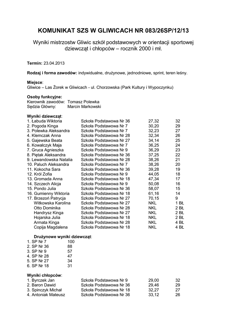 KOMUNIKAT SZS W GLIWICACH NR 083/26SP/12/13