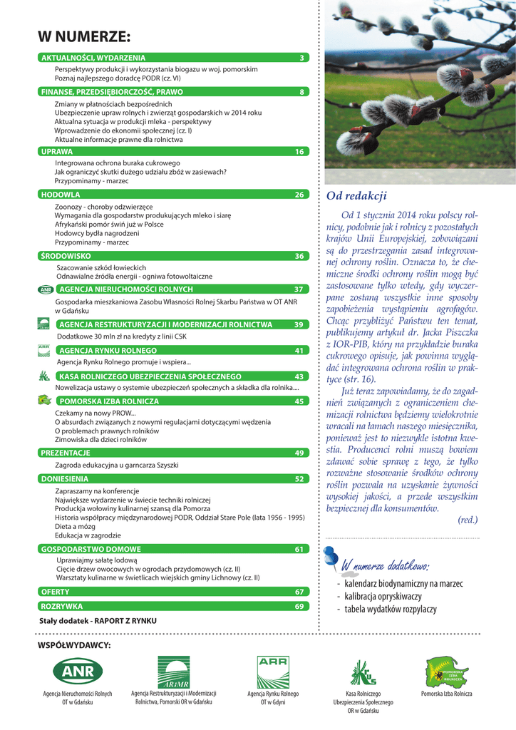 W NUMERZE: AKTUALNOŚCI, WYDARZENIA 3 Perspektywy produkcji i wykorzystania biogazu w woj. pomorskim Poznaj najlepszego doradcę PODR (cz. VI) FINANSE, PRZEDSIĘBIORCZOŚĆ, PRAWO 8 Zmiany w płatnościach bezpośrednich Ubezpieczenie upraw rolnych i zwierząt gospodarskich w 2014 roku Aktualna sytuacja w produkcji mleka - perspektywy Wprowadzenie do ekonomii społecznej (cz. I) Aktualne informacje prawne dla rolnictwa UPRAWA 16 Integrowana ochrona buraka cukrowego Jak ograniczyć skutki dużego udziału zbóż w zasiewach? Przypominamy - marzec HODOWLA 26 Zoonozy - choroby odzwierzęce Wymagania dla gospodarstw produkujących mleko i siarę Afrykański pomór świń już w Polsce Hodowcy bydła nagrodzeni Przypominamy - marzec ŚRODOWISKO 36 Szacowanie szkód łowieckich Odnawialne źródła energii - ogniwa fotowoltaiczne AGENCJA NIERUCHOMOŚCI ROLNYCH 37 Gospodarka mieszkaniowa Zasobu Własności Rolnej Skarbu Państwa w OT ANR w Gdańsku AGENCJA RESTRUKTURYZACJI I MODERNIZACJI ROLNICTWA 39 Dodatkowe 30 mln zł na kredyty z linii CSK AGENCJA RYNKU ROLNEGO 41 Agencja Rynku Rolnego promuje i wspiera... KASA ROLNICZEGO UBEZPIECZENIA SPOŁECZNEGO 43 Nowelizacja ustawy o systemie ubezpieczeń społecznych a składka dla rolnika.... POMORSKA IZBA ROLNICZA 45 Czekamy na nowy PROW... O absurdach związanych z nowymi regulacjami dotyczącymi wędzenia O problemach prawnych rolników Zimowiska dla dzieci rolników PREZENTACJE 49 Zagroda edukacyjna u garncarza Szyszki DONIESIENIA 52 Zapraszamy na konferencje Największe wydarzenie w świecie techniki rolniczej Produckja wołowiny kulinarnej szansą dla Pomorza Historia współpracy międzynarodowej PODR, Oddział Stare Pole (lata 1956 - 1995) Dieta a mózg Edukacja w zagrodzie Od redakcji Od 1 stycznia 2014 roku polscy rolnicy, podobnie jak i rolnicy z pozostałych krajów Unii Europejskiej, zobowiązani są do przestrzegania zasad integrowanej ochrony roślin. Oznacza to, że chemiczne środki ochrony roślin mogą być zastosowane tylko wtedy, gdy wyczerpane zostaną wszystkie inne sposoby zapobieżenia wystąpieniu agrofagów. Chcąc przybliżyć Państwu ten temat, publikujemy artykuł dr. Jacka Piszczka z IOR-PIB, który na przykładzie buraka cukrowego opisuje, jak powinna wyglądać integrowana ochrona roślin w praktyce (str. 16). Już teraz zapowiadamy, że do zagadnień związanych z ograniczeniem chemizacji rolnictwa będziemy wielokrotnie wracali na łamach naszego miesięcznika, ponieważ jest to niezwykle istotna kwestia. Producenci rolni muszą bowiem zdawać sobie sprawę z tego, że tylko rozważne stosowanie środków ochrony roślin pozwala na uzyskanie żywności wysokiej jakości, a przede wszystkim bezpiecznej dla konsumentów. (red.) GOSPODARSTWO DOMOWE 61 Uprawiajmy sałatę lodową Cięcie drzew owocowych w ogrodach przydomowych (cz. II) Warsztaty kulinarne w świetlicach wiejskich gminy Lichnowy (cz. II) OFERTY 67 ROZRYWKA 69 W numerze dodatkowo: - kalendarz biodynamiczny na marzec - kalibracja opryskiwaczy - tabela wydatków rozpylaczy Stały dodatek - RAPORT Z RYNKU WSPÓŁWYDAWCY: Agencja Nieruchomości Rolnych OT w Gdańsku Agencja Restrukturyzacji i Modernizacji Rolnictwa, Pomorski OR w Gdańsku Agencja Rynku Rolnego OT w Gdyni Kasa Rolniczego Ubezpieczenia Społecznego OR w Gdańsku Pomorska Izba Rolnicza 3