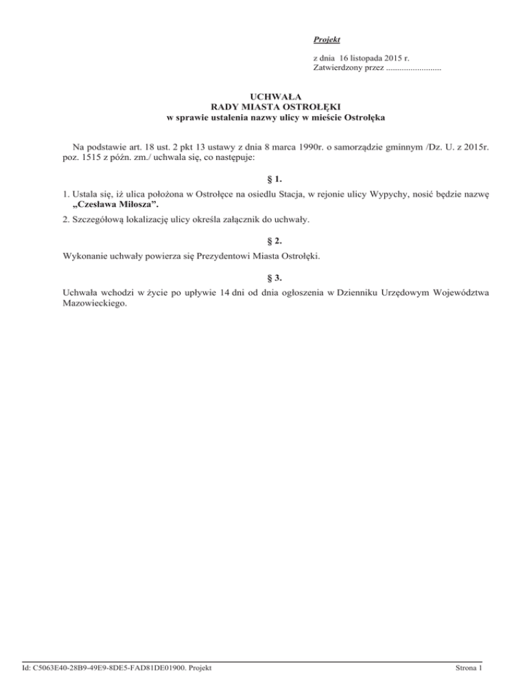 Projekt z dnia 16 listopada 2015 r. Zatwierdzony przez ......................... UCHWAŁA RADY MIASTA OSTROŁĘKI w sprawie ustalenia nazwy ulicy w mieście Ostrołęka Na podstawie art. 18 ust. 2 pkt 13 ustawy z dnia 8 marca 1990r. o samorządzie gminnym /Dz. U. z 2015r. poz. 1515 z późn. zm./ uchwala się, co następuje: § 1. 1. Ustala się, iż ulica położona w Ostrołęce na osiedlu Stacja, w rejonie ulicy Wypychy, nosić będzie nazwę „Czesława Miłosza”. 2. Szczegółową lokalizację ulicy określa załącznik do uchwały. § 2. Wykonanie uchwały powierza się Prezydentowi Miasta Ostrołęki. § 3. Uchwała wchodzi w życie po upływie 14 dni od dnia ogłoszenia w Dzienniku Urzędowym Województwa Mazowieckiego. Id: C5063E40-28B9-49E9-8DE5-FAD81DE01900. Projekt Strona 1 Załącznik do Uchwały Rady Miasta Ostrołęki Id: C5063E40-28B9-49E9-8DE5-FAD81DE01900. Projekt Strona 1 8=$6$'1,(1,( GR SURMHNWX ] GQLD U XFKZDá\ 5DG\ 0LDVWD 2VWURáĊNL Z VSUDZLH XVWDOHQLD QD]Z\ XOLF\ Z PLHĞFLH 2VWURáĊND = ZQLRVNLHP R QDGDQLH QD]Z\ QLHQD]ZDQHM XOLF\ SRáRĪRQHM QD RVLHGOX 6WDFMD Z 2VWURáĊFH VWDQRZLąFHM ZáDVQRĞü 0LDVWD 2VWURáĊNL Z\VWąSLáD ZáDĞFLFLHOND QLHUXFKRPRĞFL SU]\OHJDMąFHM SURSRQXMąF DE\ XOLF\ QDGDü QD]ZĊ XO &]HVáDZD 0LáRV]D &]HVáDZ 0LáRV] XU U Z 6]HWHMQLDFK QD /LWZLH ]P U Z .UDNRZLH ± SRHWD SUR]DLN HVHLVWD : U UR]SRF]ąá VWXGLD QD :\G]LDOH +XPDQLVW\F]Q\P 8QLZHUV\WHWX 6WHIDQD %DWRUHJR Z :LOQLH VNąG SR NLONX W\JRGQLDFK SU]HQLyVá VLĊ QD SUDZR NWyUH XNRĔF]\á Z U -DNR SRHWD ]DGHELXWRZDá Z U QD áDPDFK SLVPD Ä$OPD 0DWHU 9LOQHQVLV´ ZLHUV]DPL .RPSR]\FMD L 3RGUyĪ : U ]RVWDá ZVSyá]DáRĪ\FLHOHP JUXS\ SRHW\FNLHM ÄĩDJDU\´ L ZVSyáUHGDNWRUHP Z\GDZDQHJR SU]H] QLą SLVPD Z NWyU\P SXEOLNRZDá VZRMH NROHMQH ZLHUV]H : U XND]Dá VLĊ NVLąĪNRZ\ GHELXW &]HVáDZD 0LáRV]D ± ]ELyU 3RHPDW R F]DVLH ]DVW\Já\P =D GHELXW OLWHUDFNL RWU]\PDá 1DJURGĊ LP )LORPDWyZ : ODWDFK VW\SHQG\VWD )XQGXV]X .XOWXU\ 1DURGRZHM Z 3DU\ĪX 3R SRZURFLH Z U SRGMąá VZRMą SLHUZV]ą SUDFĊ ]DZRGRZą Z UR]JáRĞQL ZLOHĔVNLHM 3ROVNLHJR 5DGLD : U SU]HQLHVLRQ\ GR UR]JáRĞQL ZDUV]DZVNLHM 2G U SUDFRZDá MDNR ZRĨQ\ Z %LEOLRWHFH 8QLZHUV\WHWX :DUV]DZVNLHJR 3RG SVHXGRQLPHP -DQ 6WUXü DNW\ZQLH XF]HVWQLF]\á Z SRG]LHPQ\P Ī\FLX OLWHUDFNLP VWROLF\ 8ND]Dá\ VLĊ ZyZF]DV :LHUV]H RUD] 3LHĞĔ QLHSRGOHJáD 3R XSDGNX 3RZVWDQLD :DUV]DZVNLHJR VFKURQLá VLĊ Z RNROLFDFK .UDNRZD 3R ZRMQLH RVLHGOLá VLĊ Z .UDNRZLH 7DP RGGDá VLĊ SUDF\ WZyUF]HM : U Z\GDá MHGHQ ] QDMEDUG]LHM ]QDF]ąF\FK WRPLNyZ SRH]ML SROVNLHM ;; ZLHNX 2FDOHQLH 1DVWĊSQLH Z\MHFKDá QD SODFyZNĊ G\SORPDW\F]Qą GR 86$ 'R 3ROVNL ZUyFLá QD NUyWNR Z U .LOND PLHVLĊF\ SyĨQLHM ]RVWDá PLDQRZDQ\ VHNUHWDU]HP DPEDVDG\ 35/ Z 3DU\ĪX 7DP Z U QDZLą]Dá ZVSyáSUDFĊ ] ,QVW\WXWHP /LWHUDFNLP -HU]HJR *LHGUR\FLD L Z\VWąSLá GR ZáDG] 5HSXEOLNL )UDQFXVNLHM ] SURĞEą R D]\O SROLW\F]Q\ 2G WHJR PRPHQWX 0LáRV] ]DF]\QD SXEOLNRZDü Z SDU\VNLHM Ä.XOWXU]H´ 0RW\Z\ ]HUZDQLD ] 35/ L HPLJUDFML SU]HGVWDZLá Z HVHMX =QLHZRORQ\ XP\Vá RUD] SRZLHĞFL =GRE\FLH ZáDG]\ ,QVW\WXW /LWHUDFNL ZNUyWFH Z\GDá WDNĪH 'ROLQĊ ,VV\ RUD] 7UDNWDW SRHW\FNL : U SU]HQLyVá VLĊ GR 86$ JG]LH RWU]\PDá VWDQRZLVNR Z\NáDGRZF\ D QDVWĊSQLH SURIHVRUD QD :\G]LDOH /LWHUDWXU L -Ċ]\NyZ 6áRZLDĔVNLFK 8QLZHUV\WHWX .DOLIRUQLMVNLHJR Z %HUNOH\ 3U]H] NROHMQ\FK ODW áąF]\á SUDFĊ XQLZHUV\WHFNą ] WZyUF]RĞFLą OLWHUDFNą :yZF]DV SRZVWDMą WRPLNL SRH]ML .UyO 3RSLHO L LQQH ZLHUV]H *XFLR ]DF]DURZDQ\ RUD] 0LDVWR EH] LPLHQLD D WDNĪH ]ELRU\ V]NLFyZ 3U\ZDWQH RERZLą]NL L *G]LH ZVFKRG]L VáRĔFH L NĊG\ ]DSDGD : U ]RVWDá XKRQRURZDQ\ 0LĊG]\QDURGRZą 1DJURGą /LWHUDFNą LP 1HXVWDGWD QD]\ZDQą ÄPDá\P QREOHP´ : NROHMQ\FK ODWDFK UR]SRF]ąá F\NO WáXPDF]HĔ ELEOLMQ\FK ] KHEUDMVNLHJR L JUHFNLHJR : U RWU]\PDá OLWHUDFNą 1DJURGĊ 1REOD 7R Z\UyĪQLHQLH ZSá\QĊáR QD ]PLDQĊ VWRVXQNX ZáDG] 35/ L SR]ZROLáR PX Z U QD SLHUZV]ą RG ODW ZL]\WĊ Z RMF]\ĨQLH 3RGF]DV MHM WUZDQLD RGHEUDá W\WXá GRNWRUD KRQRURZHJR .8/ .ROHMQH ODWD SU]\QLRVá\ SRHFLH V]HUHJ Z\GDĔ MHJR G]LHá Z MĊ]\NDFK REF\FK RUD] GHV]F] PLĊG]\QDURGRZ\FK L NUDMRZ\FK QDJUyG PLQ 2UGHU 2UáD %LDáHJR KRQRURZH RE\ZDWHOVWZR /LWZ\ 7HQ RNUHV WR WDNĪH F]DV DNW\ZQHM SUDF\ WZyUF]HM : ODWDFK G]LHZLĊüG]LHVLąW\FK L QD SU]HáRPLH ZLHNyZ ]DFKZ\W NU\W\NyZ ]GRE\á\ WRP\ 3LHVHN SU]\GURĪQ\ RUD] 7R D WDNĪH V]NLF 6]XNDQLH RMF]\]Q\ : U &]HVáDZ 0LáRV] QD VWDáH ZUyFLá GR 3ROVNL =PDUá VLHUSQLD U Id: C5063E40-28B9-49E9-8DE5-FAD81DE01900. Projekt Strona 1