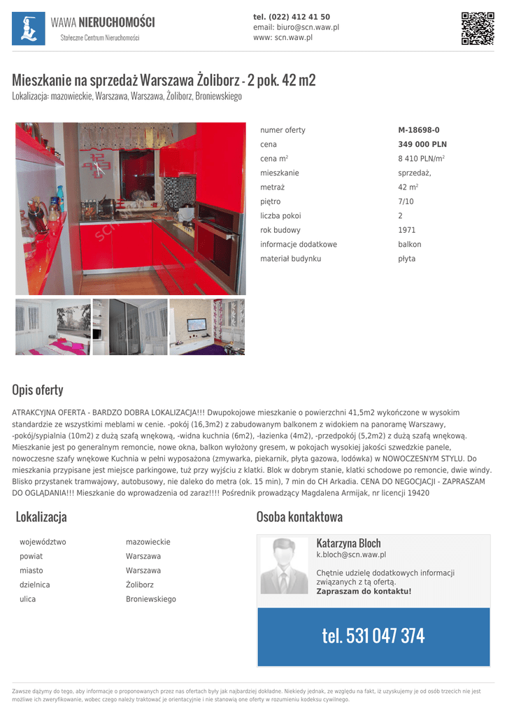 tel. (022) 412 41 50 email: [email protected] www: scn.waw.pl Mieszkanie na sprzedaż Warszawa Żoliborz - 2 pok. 42 m2 Lokalizacja: mazowieckie, Warszawa, Warszawa, Żoliborz, Broniewskiego numer oferty M-18698-0 cena 349 000 PLN cena m 8 410 PLN/m2 mieszkanie sprzedaż, metraż 42 m2 piętro 7/10 liczba pokoi 2 rok budowy 1971 informacje dodatkowe balkon materiał budynku płyta 2 Opis oferty ATRAKCYJNA OFERTA - BARDZO DOBRA LOKALIZACJA!!! Dwupokojowe mieszkanie o powierzchni 41,5m2 wykończone w wysokim standardzie ze wszystkimi meblami w cenie. -pokój (16,3m2) z zabudowanym balkonem z widokiem na panoramę Warszawy, -pokój/sypialnia (10m2) z dużą szafą wnękową, -widna kuchnia (6m2), -łazienka (4m2), -przedpokój (5,2m2) z dużą szafą wnękową. Mieszkanie jest po generalnym remoncie, nowe okna, balkon wyłożony gresem, w pokojach wysokiej jakości szwedzkie panele, nowoczesne szafy wnękowe Kuchnia w pełni wyposażona (zmywarka, piekarnik, płyta gazowa, lodówka) w NOWOCZESNYM STYLU. Do mieszkania przypisane jest miejsce parkingowe, tuż przy wyjściu z klatki. Blok w dobrym stanie, klatki schodowe po remoncie, dwie windy. Blisko przystanek tramwajowy, autobusowy, nie daleko do metra (ok. 15 min), 7 min do CH Arkadia. CENA DO NEGOCJACJI - ZAPRASZAM DO OGLĄDANIA!!! Mieszkanie do wprowadzenia od zaraz!!!! Pośrednik prowadzący Magdalena Armijak, nr licencji 19420 Lokalizacja Osoba kontaktowa Katarzyna Bloch województwo mazowieckie powiat Warszawa [email protected] miasto Warszawa dzielnica Żoliborz ulica Broniewskiego Chętnie udzielę dodatkowych informacji związanych z tą ofertą. Zapraszam do kontaktu! tel. 531 047 374 Zawsze dążymy do tego, aby informacje o proponowanych przez nas ofertach były jak najbardziej dokładne. Niekiedy jednak, ze względu na fakt, iż uzyskujemy je od osób trzecich nie jest możliwe ich zweryfikowanie, wobec czego należy traktować je orientacyjnie i nie stanowią one oferty w rozumieniu kodeksu cywilnego.