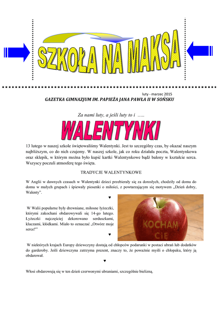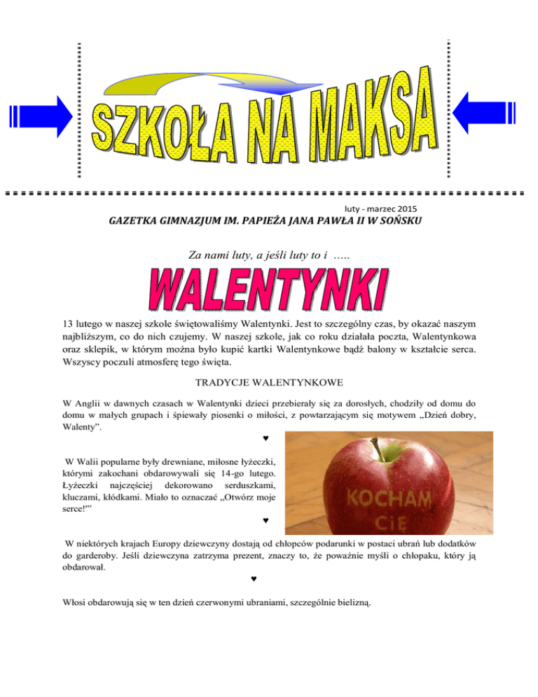 luty - marzec 2015 GAZETKA GIMNAZJUM IM. PAPIEŻA JANA PAWŁA II W SOŃSKU Za nami luty, a jeśli luty to i ….. 13 lutego w naszej szkole świętowaliśmy Walentynki. Jest to szczególny czas, by okazać naszym najbliższym, co do nich czujemy. W naszej szkole, jak co roku działała poczta, Walentynkowa oraz sklepik, w którym można było kupić kartki Walentynkowe bądź balony w kształcie serca. Wszyscy poczuli atmosferę tego święta. TRADYCJE WALENTYNKOWE W Anglii w dawnych czasach w Walentynki dzieci przebierały się za dorosłych, chodziły od domu do domu w małych grupach i śpiewały piosenki o miłości, z powtarzającym się motywem „Dzień dobry, Walenty”. ♥ W Walii popularne były drewniane, miłosne łyżeczki, którymi zakochani obdarowywali się 14-go lutego. Łyżeczki najczęściej dekorowano serduszkami, kluczami, kłódkami. Miało to oznaczać „Otwórz moje serce!'” ♥ W niektórych krajach Europy dziewczyny dostają od chłopców podarunki w postaci ubrań lub dodatków do garderoby. Jeśli dziewczyna zatrzyma prezent, znaczy to, że poważnie myśli o chłopaku, który ją obdarował. ♥ Włosi obdarowują się w ten dzień czerwonymi ubraniami, szczególnie bielizną. ♥ W niektórych miastach Polski (Warszawa, Kraków) w Walentynki wyjeżdżają na miasto specjalne Walentynkowe tramwaje. Są to zabytkowe wagony tramwajowe, które turystyczną trasą obwożą zakochanych po mieście. ♥ Polscy handlowcy 14 lutego dają zniżki parom, które przychodzą na zakupy, szczególnie w sklepach z bielizną i słodyczami. WALENTYNKOWE WIERSZYKI ♥ Każdy gwiazdkę ma na niebie. Dla każdego gwiazdka lśni. Ja wybrałam właśnie Ciebie, moją gwiazdką jesteś ty! ♥ Życzę Ci, abyś Dzień Miłości spędził w radości i pomyślności, a te marzenia, co chowasz w ukryciu, niech Ci wyznaczą drogę szczęścia w życiu! ♥ W dniu świętego Walentego Nic nie może dziać się złego, Nikt nie może się dziś złościć, Bo dziś nadszedł dzień miłości. ♥ Jeśli zdziwiona jest Twoja minka, z jakiej okazji ta walentynka, to przecież dzisiaj jest czternastego, święto każdego zakochanego! ♥ Czuję się dobrze w Twoim towarzystwie, przyjmij, więc życzenia z walentynkowym uściskiem. ♥ Walentynkowy liścik Niechaj przypomina, O tym, jak Ci bliska Jest pewna dziewczyna! ♥ W kosmicznym tempie , lecz w ziemskim stanie serdeczną walentynkę przesyłam Ci kochanie . ♥ Dzień świętego Walentego To dzień dobry dla każdego! W tym dniu wszyscy to wyznają, że chcą kochać i kochają! ♥ W dniu walentynek - mocno całuję i słowem KOCHAM się podpisuję . ♥ Walentynki są raz w roku, pełne szczęścia i uroku a Ty stale bądź radosny, i promienny jak dzień wiosny! ♥ W kosmicznym tempie, lecz w ziemskim stanie serdeczną walentynkę przesyłam Ci kochanie. ♥ W głowie szumi w sercu grzeje, Nie wiadomo, co się dzieje, Ale Ty już pewnie wiesz, że to moja miłość jest! ♥ Moje serce jest malutkie, ale wierne i cieplutkie, tylko Tobie jest oddane, tylko w Tobie ZAKOCHANE. ♥ Jeśli zgadniesz, kto to taki to dostaniesz dwa buziaki. Jeśli zgadniesz, że to ja to dostaniesz jeszcze dwa! przed nami marzec, a w marcu . . . 1 marca – Międzynarodowy Dzień Walki przeciwko Zbrojeniom Atomowym, Światowy Dzień Obrony Cywilnej, Światowy Dzień Świadomości Autoagresji, Dzień Puszystych, Dzień Piegów, Dzień Żołnierzy Wyklętych 2 marca – Dzień Dyskordii, Światowy Dzień Autyzmu 3 marca – Międzynarodowy Dzień Pisarzy, Międzynarodowy Dzień Chorego 4 marca – Rocznica uchwalenia konstytucji USA 5 marca – Dzień Teściowej, Dzień Dentysty, imieniny Konona 6 marca – Europejski Dzień Logopedy, Dzień Czystego Stołu, Święto Niepodległości w Ghanie, dzień utworzenia Norfolku 7 marca – Dzień Nauczyciela w Albanii, Rocznica śmierci Stanleya Kubricka 8 marca – Międzynarodowy Dzień Praw Kobiet, Międzynarodowy Dzień Pokoju na Świecie, Dzień Osób Rudych 9 marca – Dzień Polskiej Statystyki, Dzień Barona Blissa w Belize 10 marca – Dzień Mężczyzny, Międzynarodowy Dzień Całowania w Czoło, Dzień 40 Męczenników, urodziny Chucka Norissa 11 marca – Dzień Sołtysa, urodziny Haralda zur Hausena 12 marca – Światowy Dzień Drzemki w Pracy, Święto Pracy w Burundi 13 marca – Kasuga Matsuri (Festiwal Małpy) – japońskie święto wchodzące w skład Kasuga Grand Shrine, urodziny Fokusa 14 marca – Dzień Liczby Pi, Biały Dzień, Święto Języka Estońskiego 15 marca – Światowy Dzień Praw Konsumenta, Europejski Dzień Konsumenta, Światowy Dzień Choroby Alzheimera, Idy Marcowe 16 marca – Dzień Przemytnika Litewskiej Książki 17 marca – Światowy Dzień Morza, Dzień Św. Patryka 18 marca – Europejski Dzień Mózgu 19 marca – Dzień Wędkarza 20 marca – Dzień Bez Mięsa, Międzynarodowy Dzień Wróbla, Międzynarodowy Dzień Astrologii 21 marca – Dzień Wagarowicza, Światowy Dzień Zespołu Downa, Międzynarodowy Dzień Poezji, Światowy Dzień Leśnika, Światowy Dzień Lasu, Światowy Dzień Walki z Dyskryminacją Rasową 22 marca – Światowy Dzień Wody, Dzień Ochrony Bałtyku 23 marca – Światowy Dzień Meteorologii, Dzień Windy, Dzień Przyjaźni Polsko-Węgierskiej 24 marca – Narodowy Dzień Życia, Światowy Dzień Gruźlicy 25 marca – Dzień Czytania Tolkiena 26 marca – Dzień Niedźwiedzia Grizzly, Światowy Dzień Króla Niedźwiedzi, wspomnienie św. Dobrego Łotra 27 marca – Międzynarodowy Dzień Teatru 28 marca –Dzień św. Guntrama 29 marca – Dzień Metalowca 30 marca – Dzień Ziemi Palestyńskiej, Dzień Baptystów w Trynidadzie i Tobago, Dzień Narodzin Wielu Osobistości 31 marca – Święto Wolności Malty, Dzień Budyniu Coroczne święto obchodzone 8 marca, jako wyraz szacunku dla ofiar walki o równouprawnienie kobiet. Ustanowione zostało w 1910 roku. Dzień Kobiet w Polsce był obchodzony na szeroką skalę do 1993 roku.