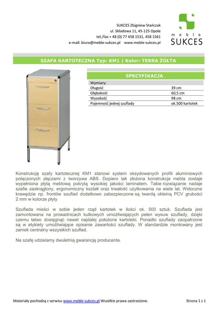 SUKCES Zbigniew Stańczak ul. Składowa 11, 45-125 125 Opole tel./fax + 48 (0) 77 458 1531, 458 1561 e-mail: mail: [email protected] www.meble-sukces.pl sukces.pl SZAFA KARTOTECZNA Typ: KM1 K | Kolor: TERRA śÓŁTA SPECYFIKACJA Wymiary: Długość Głębokość Wysokość Pojemność jednej szuflady 39 cm 60,5 cm 98 cm ok.500 kartotek Konstrukcję szafy kartotecznej KM1 stanowi system oksydowanych profili aluminiowych połączonych złączami czami z tworzywa ABS. Dopiero tak złoŜona zło ona konstrukcja mebla zostaje wypełniona płytą meblową pokrytą pokryt wysokiej jakości ci laminatem. Takie rozwiązanie nadaje szafie zaokrąglony, glony, ergonomiczny kształt oraz trwałość trwało uŜytkowania ytkowania na wiele lat. Widoczne krawędzie dzie np. frontów szuflad dodatkowo zabezpieczone są twardą ą okleiną oklein PCV grubości 2 mm w kolorze płyty Szuflada mieści ci w sobie jeden rząd rz kartotek w ilości ci ok. 500 sztuk. Szuflada jest zamontowana na prowadnicach kulkowych umoŜliwiających umo cych pełen wysuw szuflady, szuflady dzięki czemu łatwo dosięgnąć nawet najdalej połoŜone poło one kartoteki. Ponadto szuflady zaopatrzone są w etykiety umoŜliwiające ce opisanie zawartości zawarto szuflady. W standardzie montowany jest zamek centralny wszystkich szuflad. Na szafę udzielamy dwuletnią ą gwarancję gwarancj producenta. Materiały pochodzą z serwisu www.meble-sukces.pl www.meble Wszelkie prawa zastrzeżone. Strona 1 z 1