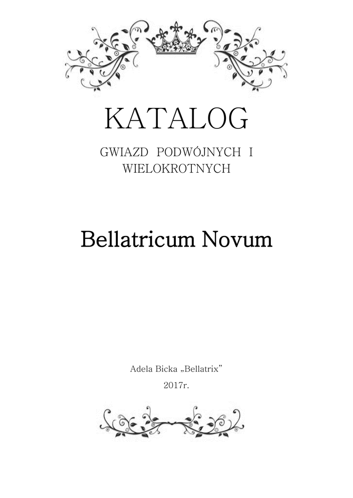 KATALOG GWIAZD PODWÓJNYCH I WIELOKROTNYCH Bellatricum Novum Adela Bicka „Bellatrix” 2017r. Niniejsze opracowanie Danielowi dedykuję. 1. Alpha Canum Venaticorum (Cor Caroli) A: 2,8m; A0Vp; (B-V)= -0,12 B: 5,5m; F2V; (B-V)= +0,34 Stopień separacji: 19,3’’ Barwy składników: A: błękitne w ciepłych tonacjach, zbliżone do turkusowego. B: oliwkowa zieleń (zieleń z dodatkiem brązu i żółtego). 2. Alpha Canis Majoris (Syriusz) A: -1,5m; A1V; (B-V)= 0,0 B: 8,5m; DA; (B-V)= -0,03 Stopień separacji: 10,5’’ Barwy składników: A: biała, mieniąca się w różnych odcieniach B: sinawa. 3. Alpha Andromedae (Sirrah, Alperatz) A: 2,2m; B8IVp; (B-V)= -0,11 B: 11,1m; GV; (B-V)= +0,45 Stopień separacji: 90,8’’ Barwy składników: A: niebieski z rozległą poświatą w zimnym, lodowatym odcieniu. B: gwiazda widoczna metodą zerkania. Barwa chłodna, jasno wrzosowa, blada. 4. Alpha Cassiopeiae (Szedar) A: 2,4m; K0III; (B-V)= +1,17 B: 9,0 m; K2IV; (B-V)= +1,17 Stopień separacji: 70’’ Barwy składników: Oba komponenty mają taką samą, jasno pomarańczową, słabo nasyconą barwę. 5. Alpha Geminorum (Kastor) A: 1,9m; A1V; (B-V)= 0,0 B: 3,0m; A4V; C: 9,8m; M0,5V; (B-V)= +0,73 D: 10,1m; G0; (B-V)= +1,07 Stopień separacji: 5,1’’; 70’’; 182’’ Barwy składników: A: biały z bardzo słabym niebiesko-sinym odcieniem B: ecru z subtelnym odcieniem bananowym C: pomarańczowa, barwa ciemna i zaledwie widoczna D: możliwości sprzętu nie pozwoliły na ocenę koloru. 6. Alpha Ursae Minoris (Polaris) A: 2,0m; F8Ib; (B-V)= +0,60 B: 9,1m; F3V; (B-V)= +0,49 Stopień separacji: 18,1’’ Barwy składników: A: koronka francuska ze słodkawym łososiowym odcieniem. B: wrzosowy. 7. Beta Cephei (Alfirk) A: 3,2m; B0,5III; (B-V)= -0,22 B: 8,6m; A1V Stopień separacji: 14’’ Barwy składników: A: białobłękitna B: bladofioletowa z betonowym zimnym odcieniem. 8. Beta Capricorni (Dabich) A: 3,2m; F8V; (B-V)= 0,79 B: 6,1m; A0; (B-V)= 0,00 Stopień separacji: 205’’ Barwy składników: A: bladożółtawa w ciepłej tonacji B: białobłękitna Widoczny wyraźny kontrast między składowymi systemu. Nie jest to „drugie Albireo” ale różnica barw jest łatwo dostrzegalna (trzecia z gwiazd, widoczna na szkicu, nie wchodzi w skład układu). 9. Beta Scorpi (Acrab) A: 2,6m; B0,5V; (B-V)= -0,06 B: 4,5m; B2V; (B-V)= -0,03 Stopień separacji: 15,4’’ Barwy składników: A: jasnobłękitna w zimnej tonacji B: jasnobłękitna z subtelnym odcieniem fioletowawym. 10. Beta Orionis (Rigel) A: 0,3m; B8Ia; (B-V)= -0,03 B: 6,8m; B9+B9 (spektr. podwójna) (B-V)= 0,00 Stopień separacji: 9,5’’ Barwy składników: A: biała z lekko błękitnawą poświatą B: bladowrzosowo-popielata 11. Beta Lyrae (Sheliak) A: 3,6m; B8,5Ib-II; (B-V)= 0,00 B: 6,7m; A7V; (B-V)= -0,08 Stopień separacji: 45,6’’ Barwy składników: A: miętowa z subtelnym dodatkiem barwy limonkowej B: niebieska, płowa. 12. Beta Cygni (Albireo) A: 3,2m; K3II; (B-V)= +1,09 B: 4,7m; B8V; (B-V)= -0,10 Stopień separacji: 34,6’’ Barwy składników: A: jasnozłota B: niebieska, niezapominajkowa. 13. Gamma Andromedae (Almaak) A: 2,3m; K3IIb; (B-V)= +1,20 B: 5,0m; B8V+A0V; (B-V)= 0,00 Stopień separacji: 9,8’’ Barwy składników: A: złota B: zielona, trawiasta. 14. Gamma Delphini A: 4,4m; K1IV; (B-V)= +0,85 B: 5,0m; F7V; (B-V)= +0,49 Stopień separacji: 9’’ Barwy składników: A: intensywnie żółta, przypomina barwę rivanolu B: subtelna oliwkowo-limonkowa zieleń (z dodatkiem brązu i żółtego) 15. Gamma Arietis (Mesarthim) A: 4,5m; A1p (Si+Sr); (B-V)= -0,03 B: 4,6m; B9,5V; (B-V)= -0,03 Stopień separacji: 7,1 Barwy składników: A: biaława, ciepła (ecru) B: biały z subtelnym, bardzo trudno dostrzegalnym kolorem jasnobłękitnym. Kontrast pomiędzy kolorami gwiazd Składowych na granicy dostrzegalności. 16. Gamma Leporis: A: 3,6m; F6V; (B-V)= +0,47 B: 6,3m; K2V; (B-V)= +0,94 Stopień separacji: 95’’ Barwy składników: A: jasnozłota, miodowa B: pomarańczowo-łososiowa z niewielką domieszką różu 17. Delta Bootis A: 3,6m; G8IV; (B-V)= +0,95 B: 7,9m; G0V; (B-V)= + 0,58 Stopień separacji: 106’’ Barwy składników: A: blado cytrynowa, płowa B: szarawo żółty, słabo nasycony. 18. Delta Cephei A: 4,2m; F5Iab; (B-V)= +0,60 B: 6,1m; B7IV; (B-V)= -0,03 Stopień separacji: 41’’ Barwy składników: A: żółta, dość intensywna. B: błękitna, niezapominajkowa. Silny kontrast pomiędzy obiema składowymi systemu. 19. Delta Corvi (Algorab) A: 3,0m; A0IVn; (B-V)= -0,05 B: 8,5m; K0V; (B-V)= +0,95 Stopień separacji: 24,6’’ Barwy składników: A: bladożółto-beżowa, ciepła B: fioletowo-brązowo-szara, przypomina barwę kwiatów wilczej jagody. 20. Delta Orionis (Mintaka) A: 2,4m; B0III + O9V; (B-V)= -0,03 B: 6,8m; B2V; (B-V)= -0,16 Stopień separacji: 53’’ Barwy składników: A: kremowo-błękitnawa, pudrowa B: granatowa 21. Epsilon Pegasi (Enif) A: 2,5m; K2Ib-II; (B-V)= +1,52 B: 8,7m; F8; (B-V)= +0,54 Stopień separacji: 145’’ Barwy składników: A: ciepła pomarańczowa, nasycona, (ale nie płomienna) B: szaro-błękitno-liliowa, płowa. 22. Epsilon Persei A: 2,8m; B1,5III; (B-V)= -0,18 B: 8,9m; A2V Stopień separacji: 9’’ Barwy składników: A: błękitna, mocno nasycona B: widoczna zerkaniemchłodnawe sino-niebieskawe tonacje. 23. Epsilon Monocerotis A: 4,4m ; A5IV; (B-V)= +0,21 B: 6,4m; F5V; (B-V)= +0,39 Stopień separacji: 12’’ Barwy składników: A: biała z subtelnie niebieskawą poświatą B: szarawo-sino-pomarańczowa, płowa. 24. Epsilon Lyrae: („Double Double”) A: 5,1m; A4V; +0,13 B: 6,1m; F1V; + 0,29 C: 5,2m; A8Vn; +0,16 D: 5,4m; F0Vn; +0,22 Stopień separacji: AB: 2,3’’; CD: 2,39’’; AB CD: 209’’ Barwy składników: Wszystkie składowe mają kolor zbliżony do biel. 25. Eta Cassiopeiae (Achird) A: 3,5m; F9V/M0V; (B-V)= +0,58 B: 7,4m; K7V; (B-V)= +1,39 Stopień separacji: 13’’ Barwy składników: A: brudno żółtawa B: fioletowo-brązowa