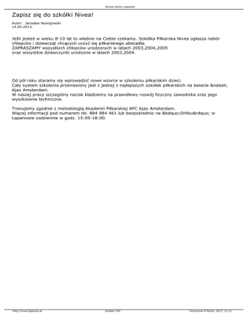 Strona Gminy Łapanów Zapisz się do szkółki Nivea! Autor: Jarosław Nowojowski 14.05.2013. Jeśli jesteś w wieku 8-10 lat to właśnie na Ciebie czekamy. Szkółka Piłkarska Nivea ogłasza nabór chłopców i dziewcząt chcących uczyć się piłkarskiego abecadła. ZAPRASZAMY wszystkich chłopców urodzonych w latach 2003,2004,2005 oraz wszystkie dziewczynki urodzone w latach 2003,2004. Od pół roku staramy się wprowadzić nowe wzorce w szkoleniu piłkarskim dzieci. Cały system szkolenia przeniesiony jest z jednej z najlepszych szkółek piłkarskich na świecie – Ajax Amsterdam. W naszej pracy szczególny nacisk kładziemy na prawidłowy rozwój fizyczny zawodnika oraz jego wyszkolenie techniczne. Trenujemy zgodnie z metodologią Akademii Piłkarskiej AFC Ajax Amsterdam. Więcej informacji pod numerem tel. 884 984 461 lub bezpośrednio na „Orliku” w Łapanowie codziennie w godz. 15:00-18:00. http://www.lapanow.pl Kreator PDF Utworzono 8 March, 2017, 11:31
