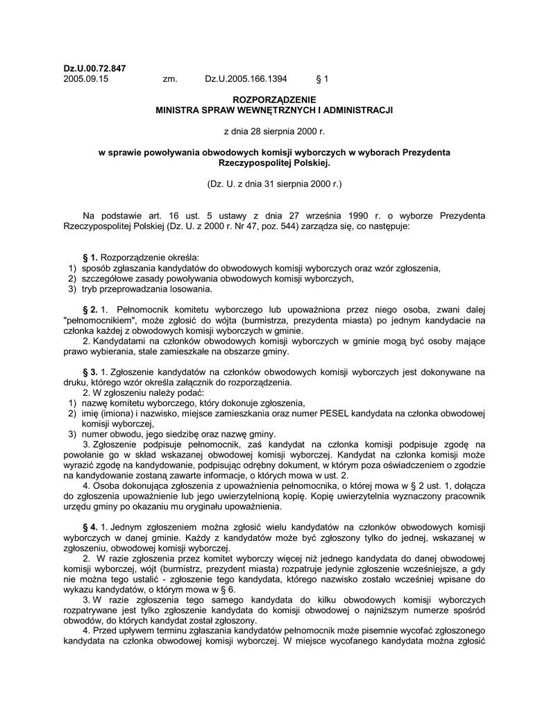 Dz.U.00.72.847 2005.09.15 zm. Dz.U.2005.166.1394 §1 ROZPORZĄDZENIE MINISTRA SPRAW WEWNĘTRZNYCH I ADMINISTRACJI z dnia 28 sierpnia 2000 r. w sprawie powoływania obwodowych komisji wyborczych w wyborach Prezydenta Rzeczypospolitej Polskiej. (Dz. U. z dnia 31 sierpnia 2000 r.) Na podstawie art. 16 ust. 5 ustawy z dnia 27 września 1990 r. o wyborze Prezydenta Rzeczypospolitej Polskiej (Dz. U. z 2000 r. Nr 47, poz. 544) zarządza się, co następuje: § 1. Rozporządzenie określa: 1) sposób zgłaszania kandydatów do obwodowych komisji wyborczych oraz wzór zgłoszenia, 2) szczegółowe zasady powoływania obwodowych komisji wyborczych, 3) tryb przeprowadzania losowania. § 2. 1. Pełnomocnik komitetu wyborczego lub upoważniona przez niego osoba, zwani dalej "pełnomocnikiem", może zgłosić do wójta (burmistrza, prezydenta miasta) po jednym kandydacie na członka każdej z obwodowych komisji wyborczych w gminie. 2. Kandydatami na członków obwodowych komisji wyborczych w gminie mogą być osoby mające prawo wybierania, stale zamieszkałe na obszarze gminy. § 3. 1. Zgłoszenie kandydatów na członków obwodowych komisji wyborczych jest dokonywane na druku, którego wzór określa załącznik do rozporządzenia. 2. W zgłoszeniu należy podać: 1) nazwę komitetu wyborczego, który dokonuje zgłoszenia, 2) imię (imiona) i nazwisko, miejsce zamieszkania oraz numer PESEL kandydata na członka obwodowej komisji wyborczej, 3) numer obwodu, jego siedzibę oraz nazwę gminy. 3. Zgłoszenie podpisuje pełnomocnik, zaś kandydat na członka komisji podpisuje zgodę na powołanie go w skład wskazanej obwodowej komisji wyborczej. Kandydat na członka komisji może wyrazić zgodę na kandydowanie, podpisując odrębny dokument, w którym poza oświadczeniem o zgodzie na kandydowanie zostaną zawarte informacje, o których mowa w ust. 2. 4. Osoba dokonująca zgłoszenia z upoważnienia pełnomocnika, o której mowa w § 2 ust. 1, dołącza do zgłoszenia upoważnienie lub jego uwierzytelnioną kopię. Kopię uwierzytelnia wyznaczony pracownik urzędu gminy po okazaniu mu oryginału upoważnienia. § 4. 1. Jednym zgłoszeniem można zgłosić wielu kandydatów na członków obwodowych komisji wyborczych w danej gminie. Każdy z kandydatów może być zgłoszony tylko do jednej, wskazanej w zgłoszeniu, obwodowej komisji wyborczej. 2. W razie zgłoszenia przez komitet wyborczy więcej niż jednego kandydata do danej obwodowej komisji wyborczej, wójt (burmistrz, prezydent miasta) rozpatruje jedynie zgłoszenie wcześniejsze, a gdy nie można tego ustalić - zgłoszenie tego kandydata, którego nazwisko zostało wcześniej wpisane do wykazu kandydatów, o którym mowa w § 6. 3. W razie zgłoszenia tego samego kandydata do kilku obwodowych komisji wyborczych rozpatrywane jest tylko zgłoszenie kandydata do komisji obwodowej o najniższym numerze spośród obwodów, do których kandydat został zgłoszony. 4. Przed upływem terminu zgłaszania kandydatów pełnomocnik może pisemnie wycofać zgłoszonego kandydata na członka obwodowej komisji wyborczej. W miejsce wycofanego kandydata można zgłosić innego kandydata. § 5. 1. Wójt (burmistrz, prezydent miasta) rozpatruje tylko te zgłoszenia kandydatów na członków obwodowych komisji wyborczych, które spełniają warunki określone w § 3 i 4 i wpłynęły do wójta (burmistrza, prezydenta miasta) nie później niż w 30 dniu przed dniem wyborów, z zastrzeżeniem § 7 ust. 1. 2. Niedopuszczalne jest przywrócenie terminu do zgłaszania kandydatów na członków obwodowych komisji wyborczych. § 6. 1. Wójt (burmistrz, prezydent miasta) w miarę napływu zgłoszeń tworzy wykaz zgłoszonych kandydatów na członków obwodowych komisji wyborczych w ten sposób, że w wykazie utworzonych obwodów, zawierającym numery obwodów i adresy siedzib obwodowych komisji wyborczych, wpisuje przy każdym z obwodów nazwiska i imiona zgłoszonych prawidłowo kandydatów na członków obwodowych komisji wyborczych oraz pozostałe dane wymienione w § 3 ust. 2. 2. Do wykazu wpisuje się również osoby wchodzące z urzędu w skład komisji wyborczych, wskazane przez wójta (burmistrza, prezydenta miasta), wraz z informacją, że wchodzą one z urzędu w skład komisji. § 7. 1. Niezwłocznie po upływie terminu zgłaszania kandydatów na członków obwodowych komisji wyborczych wójt (burmistrz, prezydent miasta) ustala, do których komisji pełnomocnicy zgłosili mniej niż czterech kandydatów na członków. 2. Wójt (burmistrz, prezydent miasta) przedłuża termin zgłaszania kandydatów do obwodowych komisji wyborczych, o których mowa w ust. 1, o 3 dni i wzywa pełnomocników, którzy nie dokonali zgłoszenia kandydatów do tych komisji, o dokonanie dodatkowych zgłoszeń. Wezwanie do dokonania dodatkowych zgłoszeń podaje się niezwłocznie do wiadomości publicznej w sposób zwyczajowo przyjęty. 3. Jeśli w przedłużonym terminie pełnomocnicy nie zgłoszą do poszczególnych obwodowych komisji wyborczych wymaganej liczby kandydatów na członków (łącznie z osobami wcześniej zgłoszonymi co najmniej 4 kandydatów), wójt (burmistrz, prezydent miasta) powołuje te komisje w składach pięcioosobowych, z uwzględnieniem wszystkich zgłoszonych kandydatów i osoby wskazanej przez wójta (burmistrza, prezydenta miasta), wchodzącej z urzędu w skład komisji, uzupełniając brakującą liczbę kandydatów osobami spełniającymi warunki, o których mowa w § 2 ust. 2. § 8. W razie zgłoszenia przez pełnomocników co najmniej czterech, a nie więcej niż ośmiu kandydatów na członków danej obwodowej komisji wyborczej, wójt (burmistrz, prezydent miasta) powołuje wszystkich zgłoszonych kandydatów w skład komisji wraz z osobą wskazaną przez wójta (burmistrza, prezydenta miasta), wchodzącą z urzędu w skład komisji. § 9. 1. W przypadku zgłoszenia przez pełnomocników do składu obwodowej komisji wyborczej więcej niż ośmiu kan