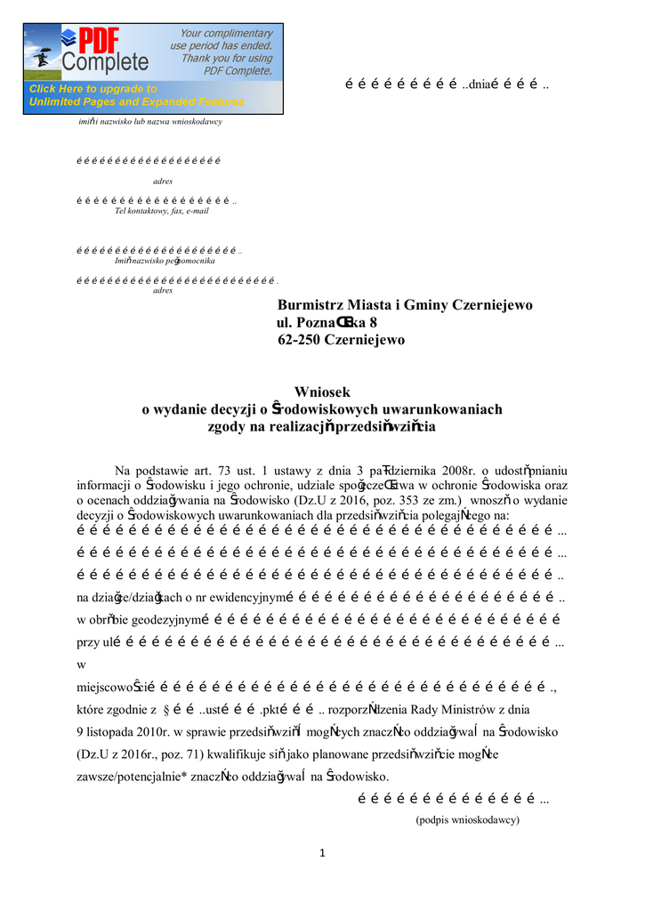 ………………………..dnia………….. ……………………………………………. imię i nazwisko lub nazwa wnioskodawcy ………………………………………………… adres ……………………………………………….. Tel kontaktowy, fax, e-mail ……………………………………………………….. Imię nazwisko pełnomocnika ……………………………………………………………………. adres Burmistrz Miasta i Gminy Czerniejewo ul. Poznańska 8 62-250 Czerniejewo Wniosek o wydanie decyzji o środowiskowych uwarunkowaniach zgody na realizację przedsięwzięcia Na podstawie art. 73 ust. 1 ustawy z dnia 3 października 2008r. o udostępnianiu informacji o środowisku i jego ochronie, udziale społeczeństwa w ochronie środowiska oraz o ocenach oddziaływania na środowisko (Dz.U z 2016, poz. 353 ze zm.) wnoszę o wydanie decyzji o środowiskowych uwarunkowaniach dla przedsięwzięcia polegającego na: …………………………………………………………………………………………………... …………………………………………………………………………………………………... ………………………………………………………………………………………………….. na działce/działkach o nr ewidencyjnym……………………………………………………….. w obrębie geodezyjnym………………………………………………………………………… przy ul…………………………………………………………………………………………... w miejscowości…………………………………………………………………………………., które zgodnie z § ……..ust……….pkt……….. rozporządzenia Rady Ministrów z dnia 9 listopada 2010r. w sprawie przedsięwzięć mogących znacząco oddziaływać na środowisko (Dz.U z 2016r., poz. 71) kwalifikuje się jako planowane przedsięwzięcie mogące zawsze/potencjalnie* znacząco oddziaływać na środowisko. ……………………………………... (podpis wnioskodawcy) 1 Załączniki obowiązkowe zgodnie z art. 74 ust. 1 ustawy z dnia 3 października 2008 r. o udostępnianiu informacji o środowisku i jego ochronie, udziale społeczeństwa w ochronie środowiska oraz o ocenach oddziaływania na środowisko oraz ustawy z dnia 16 listopada 2006r. o opłacie skarbowej. 1) W przypadku przedsięwzięć mogących znacząco oddziaływać na środowisko – raport o oddziaływaniu przedsięwzięcia na środowisko, a w przypadku gdy wnioskodawca wystąpił o ustalenie zakresu raportu w trybie art. 69 – kartę informacyjną przedsięwzięcia (w trzech (3) egzemplarzach wraz z zapisem w formie elektronicznej na informatycznym nośniku danych; 2) W przypadku przedsięwzięć mogących potencjalnie znacząco oddziaływać na środowisko – karta informacyjna przedsięwzięcia - w trzech (3) egzemplarzach wraz z jego zapisem w formie elektronicznej na informatycznym nośniku danych); 3) poświadczona przez właściwy organ kopia mapy ewidencyjnej z zaznaczonym przebiegiem granic terenu, którego dotyczy wniosek oraz obejmującej obszar, na który będzie oddziaływać przedsięwzięcie - 1 egzemplarz ( w przypadku większego formatu niż A3 – 3 egzemplarze); 4) mapę w skali zapewniającej czytelność przedstawionych danych z zaznaczonym przewidywanym terenem, na którym będzie realizowane przedsięwzięcie oraz z zaznaczonym przewidywanym obszarem, na który będzie oddziaływać przedsięwzięcie wraz z zapisem mapy w formie elektronicznej; 5) w przypadku przedsięwzięć wymagających koncesji lub decyzji, o których mowa w art. 72 ust. 1 pkt 4–5, prowadzonych w granicach przestrzeni niestanowiącej części składowej nieruchomości gruntowej oraz przedsięwzięć dotyczących urządzeń piętrzących I, II i III klasy budowli, zamiast kopii mapy, o której mowa w pkt 3 – mapę sytuacyjno-wysokościową sporządzoną w skali umożliwiającej szczegółowe przedstawienie przebiegu granic terenu, którego dotyczy wniosek, oraz obejmującą obszar, na który będzie oddziaływać przedsięwzięcie; 6) wypis z rejestru gruntów lub inny dokument, wydany przez organ prowadzący ewidencję gruntów i budynków, pozwalający na ustalenie stron postępowania, zawierający co najmniej numer działki ewidencyjnej oraz, o ile zostały ujawnione: numer jej księgi wieczystej, imię i nazwisko albo nazwę oraz adres podmiotu ewidencyjnego, obejmujący przewidywany teren, na którym będzie realizowane przedsięwzięcie, oraz obejmujący obszar, na który będzie oddziaływać przedsięwzięcie, z zastrzeżeniem jeżeli liczba stron w postępowaniu o wydanie decyzji o środowiskowych uwarunkowaniach przekracza 20: - dla przedsięwzięć mogących zawsze znacząco oddziaływać na środowisko oraz dla przedsięwzięć mogących potencjalnie znacząco oddziaływać na środowisko, dla których stwierdzono obowiązek przeprowadzenia oceny oddziaływania na środowisko, kopię mapy, kopię załącznika graficznego, przedkłada się wraz z raportem o oddziaływaniu przedsięwzięcia na środowisko; - dla przedsięwzięć mogących potencjalnie znacząco oddziaływać na środowisko, dla których nie stwierdzono obowiązku przeprowadzenia oceny oddziaływania na środowisko, kopię mapy, oraz wypis z rejestru, przedkłada się w terminie 14 dni od dnia, w którym postanowienie stało się ostateczne; - dla przedsięwzięć wymagających koncesji lub decyzji, o których mowa w art. 72 ust. 1 pkt 4–5, oraz przedsięwzięć dotyczących urządzeń piętrzących I, II i III klasy budowli, nie wymaga się wypisu z rejestru. 7) dowód uiszczenia opłaty skarbowej w wysokości: - 205 zł- za wydanie decyzji o środowiskowych uwarunkowaniach zgody na realizację przedsięwzięcia -17 zł - za dokument stwierdzający udzielenie pełnomocnictwa lub