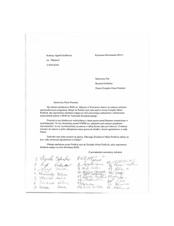Rodziny Ogród Działkowy' Kluczewo 06 kwietnia 2014 r. im. "Młynarz" w Kluczewie Szanowny Pan Ryszard Grobelny Prezes Związku Miast Polskich Szanowny Panie Prezesie. My zebrani działkowcy ROD im. Młynarz w Kluczewie obecni na walnym zebraniu sprawozdawczym pragniemy złożyć na Pańskie ręce nasz apel w stronę Związku Miast Polskich, aby zaprzestano działania mające na celu ponownego zaskarżenia i skierowania naszej dobrej ustawy o ROD do Trybunału Konstytucyjnego. Przecież to my działkowcy walczyliśmy o nasze prawa przed Sejmem uczestnicząc w manifestacjach. To my złożyliśmy ponad 970000 tys. podpisów pod naszym projektem obywatelskim i to my wywalczyliśmy tą ustawę w takiej formie jaka jest obecnie. Uważamy również, że ustawa w pełni zabezpiecza nasze prawa do działki i chroni ogrodnictwo w całej Polsce. Zachodzi nam jedno pytanie do głowy. Dlaczego Związkowi Miast Polskich zależy na tym, żeby zniszczyć ogrodnictwo w Polsce? Dlatego apelujemy przez Pańskie ręce do Związku Miast Polskich, żeby zaprzestano działania mające na celu likwidacje ROD. Z poważaniem uczestnicy zebrania. Q'3 Mí'HWfr /Mo^^^Ą ¿^ h/aj I Ü4 SM^-âÂ' i/ \J¿J X 3/1