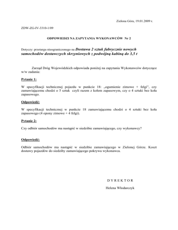 Zielona Góra, 19.01.2009 r. ZDW-ZG-IV-3310-1/09 ODPOWIEDZI NA ZAPYTANIA WYKONAWCÓW Nr 2 Dotyczy: przetargu nieograniczonego na Dostawa 2 sztuk fabrycznie nowych samochodów dostawczych skrzyniowych z podwójną kabiną do 3,5 t Zarząd Dróg Wojewódzkich odpowiada poniżej na zapytania Wykonawców dotyczące w/w zadania: Pytanie 1: W specyfikacji technicznej pojazdu w punkcie 18: „ogumienie zimowe + felgi”, czy zamawiającemu chodzi o 5 sztuk czyli razem z kołem zapasowym, czy o 4 sztuki bez koła zapasowego. Odpowiedź: W specyfikacji technicznej w punkcie 18 zamawiającemu chodzi o 4 sztuki bez koła zapasowego (4 opony zimowe + 4 felgi). Pytanie 2: Czy odbiór samochodów ma nastąpić w siedzibie zamawiającego, czy wykonawcy? Odpowiedź: Odbiór samochodów ma nastąpić w siedzibie zamawiającego w Zielonej Górze. Koszt dostawy pojazdów do siedziby zamawiającego pokrywa wykonawca. DYREKTOR Helena Włodarczyk