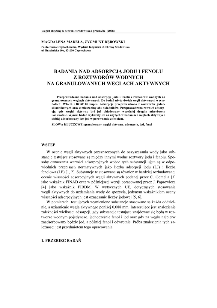 badania nad adsorpcją jodu i fenolu z roztworów wodnych na