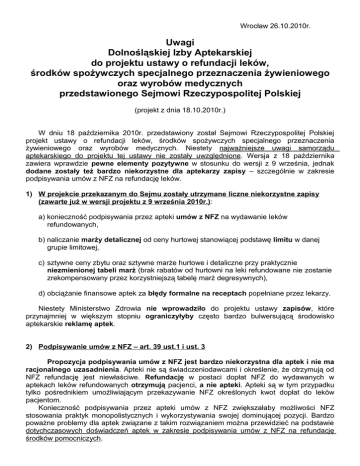 Wrocław 26.10.2010r. Uwagi Dolnośląskiej Izby Aptekarskiej do projektu ustawy o refundacji leków, środków spożywczych specjalnego przeznaczenia żywieniowego oraz wyrobów medycznych przedstawionego Sejmowi Rzeczypospolitej Polskiej (projekt z dnia 18.10.2010r.) W dniu 18 października 2010r. przedstawiony został Sejmowi Rzeczypospolitej Polskiej projekt ustawy o refundacji leków, środków spożywczych specjalnego przeznaczenia żywieniowego oraz wyrobów medycznych. Niestety najważniejsze uwagi samorządu aptekarskiego do projektu tej ustawy nie zostały uwzględnione. Wersja z 18 października zawiera wprawdzie pewne elementy pozytywne w stosunku do wersji z 9 września, jednak dodane zostały też bardzo niekorzystne dla aptekarzy zapisy – szczególnie w zakresie podpisywania umów z NFZ na refundację leków. 1) W projekcie przekazanym do Sejmu zostały utrzymane liczne niekorzystne zapisy (zawarte już w wersji projektu z 9 września 2010r.): a) konieczność podpisywania przez apteki umów z NFZ na wydawanie leków refundowanych, b) naliczanie marży detalicznej od ceny hurtowej stanowiącej podstawę limitu w danej grupie limitowej, c) sztywne ceny zbytu oraz sztywne marże hurtowe i detaliczne przy praktycznie niezmienionej tabeli marż (brak rabatów od hurtowni na leki refundowane nie zostanie zrekompensowany przez korzystniejszą tabelę marż degresywnych), d) obciążanie finansowe aptek za błędy formalne na receptach popełniane przez lekarzy. Niestety Ministerstwo Zdrowia nie wprowadziło do projektu ustawy zapisów, które przynajmniej w większym stopniu ograniczyłyby często bardzo bulwersującą środowisko aptekarskie reklamę aptek. 2) Podpisywanie umów z NFZ – art. 39 ust.1 i ust. 3 Propozycja podpisywania umów z NFZ jest bardzo niekorzystna dla aptek i nie ma racjonalnego uzasadnienia. Apteki nie są świadczeniodawcami i określenie, że otrzymują od NFZ refundację jest niewłaściwe. Refundację w postaci dopłat NFZ do wydawanych w aptekach leków refundowanych otrzymują pacjenci, a nie apteki. Apteki są w tym przypadku tylko pośrednikiem umożliwiającym przekazywanie NFZ określonych kwot dopłat do leków pacjentom. Konieczność podpisywania przez apteki umów z NFZ zwiększałaby możliwości NFZ stosowania praktyk monopolistycznych i wykorzystywania swojej dominującej pozycji. Bardzo poważne problemy dla aptek związane z takim rozwiązaniem można przewidzieć na podstawie dotychczasowych doświadczeń aptek w zakresie podpisywania umów z NFZ na refundację środków pomocniczych. Ponadto zmiany wprowadzone przez Ministerstwo Zdrowia do wersji projektu z 9 września 2010r. przekazanej do konsultacji społecznych spowodują, że proponowane rozwiązanie będzie dla aptek jeszcze bardziej restrykcyjne. W art. 39 ust.1 wprowadzona została wprawdzie zmiana, że umowę z NFZ zawiera podmiot prowadzący aptekę, jednak zgodnie z ust.3 tego artykułu umowę na realizację recept podpisuje również kierownik apteki. UWAGA: W wersji projektu z 8 września 2010r. artykuł dotyczący zawierania umów z NFZ miał numer 29 i zawierał tylko trzy ustępy. Ust. 3 zawierał ważny zapis: 3. Fundusz nie może odmówić zawarcia umowy na realizację recept. Do zawierania tej umowy nie stosuje się przepisów o zamówieniach publicznych Jednak w wersjach projektu przekazanych na Komitet Rady Ministrów (w dniu 11.10.2010r.), na Radę Ministrów (w dniu 14.10.2010r.) oraz Sejmowi Rzeczypospolitej Polskiej ust. 5 w art. 39 otrzymał brzmienie: 5. Fundusz nie może odmówić zawarcia umowy na realizację recept, z zastrzeżeniem ust. 7. Do zawierania tej umowy nie stosuje się przepisów o zamówieniach publicznych Natomiast dodano ust.6 i ust.7: 6. Fundusz rozwiązuje umowę na realizację recept ze skutkiem natychmiastowym w przypadku: 1) uniemożliwiania lub utrudniania czynności kontrolnych; 2) niewykonania w terminie zaleceń pokontrolnych 7. Fundusz nie zawiera kolejnej umowy przez okres: 1) jednego roku w przypadku pierwszego rozwiązania umowy, o którym mowa w ust.6; 2) trzech lat w przypadku drugiego rozwiązania umowy, o którym mowa w ust.6; 3) bezterminowo - w przypadku kolejnego rozwiązania umowy, o którym mowa w ust.6; Wyżej wymienione ust. 5, 6 i 7 mogą się okazać wyjątkowo niekorzystne dla aptek, jeśli uwzględni się fakt, że niektóre zalecenia pokontrolne mogą być praktycznie niewykonalne. Może się też do tego przyczynić proponowana zmiana w Art. 95 ust. 1 Prawa farmaceutycznego, który zgodnie z przedstawionym projektem ma otrzymać brzmienie: 1. Apteki ogólnodostępne są obowiązane do posiadania produktów leczniczych i wyrobów medycznych w ilości i asortymencie niezbędnym do zaspokojenia potrzeb zdrowotnych miejscowej ludności. 1a. Apteki, które są związane umową, o której mowa w art. 29 ustawy z dnia ..... o refundacji leków, środków spożywczych specjalnego przeznaczenia żywieniowego oraz wyrobów medycznych, są także obowiązane do posiadania leków i produktów spożywczych specjalnego przeznaczenia żywieniowego, na które ustalono limit finansowania. Proponowana zmiana w art. 95 ust. 1 Prawa farmaceutycznego jest całkowicie niezrozumiała, ponieważ każda apteka stara się w jak najlepszym stopniu zaopatrywać pacjentów w leki. Jednak konieczne jest też dostosowanie asortymentu magazynu leków w aptece do potrzeb pacjentów i w razie potrzeby bardzo rzadko przepisywane leki są w trybie pilnym zamawiane dla pacjentów – czas oczekiwania najczęściej nie przekracza kilku godzin. 3) Zobowiązanie do stosowania urzędowych cen oraz odpłatności i dopłat świadczeniobiorcy – art. 39 ust.2 W art. 39 ust.2 wprowadzona została korzystna zmiana zobowiązująca aptekę również do stosowania urzędowo określonych odpłatności i dopłat świadczeniobiorców: 2. Umowa na realizację recept określa w szczególności: 2) zobowiązanie do stosowania limitów, cen oraz odpłatności i