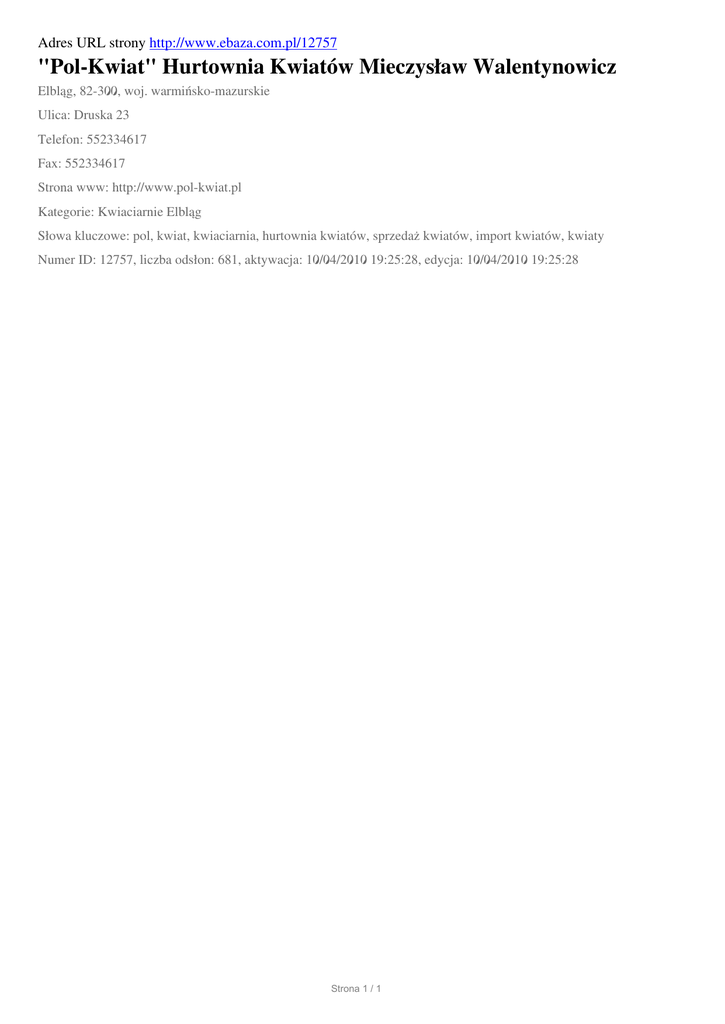 Adres URL strony http://www.ebaza.com.pl/12757 "Pol-Kwiat" Hurtownia Kwiatów Mieczysław Walentynowicz Elbląg, 82-300, woj. warmińsko-mazurskie Ulica: Druska 23 Telefon: 552334617 Fax: 552334617 Strona www: http://www.pol-kwiat.pl Kategorie: Kwiaciarnie Elbląg Słowa kluczowe: pol, kwiat, kwiaciarnia, hurtownia kwiatów, sprzedaż kwiatów, import kwiatów, kwiaty Numer ID: 12757, liczba odsłon: 681, aktywacja: 10/04/2010 19:25:28, edycja: 10/04/2010 19:25:28 Strona 1 / 1