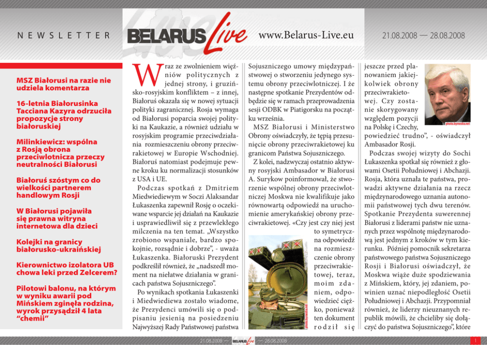 www.Belarus-Live.eu MSZ Białorusі na razie nie udziela komentarza 16-letnia Białorusinka Tacciana Kazyra odrzuciła propozycje strony białoruskiej Milinkiewicz: wspólna z Rosją obrona przeciwlotnicza przeczy neutralności Białorusі Białoruś szóstym co do wielkości partnerem handlowym Rosji W Białorusi pojawiła się prawna witryna internetowa dla dzieci Kolejki na granicy białorusko-ukraińskiej Kierownictwo izolatora UB chowa leki przed Zelcerem? Pilotowi balonu, na którym w wyniku awarii pod Mińskiem zginęła rodzina, wyrok przysądził 4 lata “chemii” W raz ze zwolnieniem więźniów politycznych z jednej strony, i gruzińsko-rosyjskim konfliktem – z innej, Białoruś okazała się w nowej sytuacji polityki zagranicznej. Rosja wymaga od Białorusі poparcia swojej polityki na Kaukazie, a również udziału w rosyjskim programie przeciwdziałania rozmieszczeniu obrony przeciwrakietowej w Europie Wschodniej. Białoruś natomiast podejmuje pewne kroku ku normalizacji stosunków z USA i UE. Podczas spotkań z Dmitriem Miedwiediewym w Soczi Alaksandar Łukaszenka zapewnił Rosję o oczekiwane wsparcie jej działań na Kaukazie i usprawiedliwił się z przewlekłego milczenia na ten temat. „Wszystko zrobiono wspaniale, bardzo spokojnie, rozsądnie i dobrze”, - uważa Łukaszenka. Białoruski Prezydent podkreślił również, że „nadszedł moment na niełatwe działania w granicach państwa Sojuszniczego”. Po wynikach spotkania Łukaszenkі і Miedwiediewа zostało wiadome, że Prezydenci umówili się o podpisaniu jesienią na posiedzeniu Najwyższej Rady Państwowej państwa 21.08.2008 — Sojuszniczego umowy międzypaństwowej o stworzeniu jedynego systemu obrony przeciwlotniczej. I że następne spotkanie Prezydentów odbędzie się w ramach przeprowadzenia sesji ODBK w Piatigorsku na początku września. MSZ Białorusі і Ministerstwo Obrony oświadczyły, że tępią przesunięcie obrony przeciwrakietowej ku granicom Państwa Sojuszniczego. Z kolei, nadzwyczaj ostatnio aktywny rosyjski Ambasador w Białorusі А. Surykow poinformował, że stworzenie wspólnej obrony przeciwlotniczej Moskwa nie kwalifikuje jako równowartą odpowiedź na uruchomienie amerykańskiej obrony przeciwrakietowej. «Czy jest czy niej jest to symetryczna odpowiedź na rozmieszczenie obrony przeciwrakietowej, teraz, moim zdaniem, odpowiedzieć ciężko, ponieważ ten dokument rodził się photo.bymedia.net N e w s l e t t e r — 28.08.2008 21.08.2008 — 28.08.2008 jeszcze przed planowaniem jakiejkolwiek obrony przeciwrakietowej. Czy zostanie skorygowany względem pozycji photo.bymedia.net na Polskę i Czechy, powiedzieć trudno”, - oświadczył Ambasador Rosji. Podczas swojej wizyty do Sochi Łukaszenka spotkał się również z głowami Osetii Południowej i Abchazji. Rosja, która uznała te państwa, prowadzi aktywne działania na rzecz międzynarodowego uznania autonomii państwowej tych dwu terenów. Spotkanie Prezydentа suwerennej Białorusi z liderami państw nie uznanych przez wspólnotę międzynarodową jest jednym z kroków w tym kierunku. Później pomocnik sekretarza państwowego państwa Sojuszniczego Rosji i Białorusі oświadczył, że Moskwa wiąże duże spodziewania z Mińskiem, który, jej zdaniem, powinien uznać niepodległość Osetii Południowej i Abchazji. Przypomniał również, że liderzy nieuznanych republik mówili, że chcieliby się dołączyć do państwa Sojuszniczego”, które 1 www.Belarus-Live.eu powinno się odbyć posiedzenie Rządu Sojuszniczego na czele z Putinem. Ponad to, strona rosyjska spodziewa się, iż Białoruś do końca roku 2008 podejmie decyzję a propos firmy, której zostanie powierzone wybudowanie elektrowni atomowej. Rosja ma dość ambitny program budowania elektrowni atomowych w kraju. Również Rosja ma poważny program budowania elektrowni w Chinach, Indiach, Bułgarii. І, rzecz jasna, nie ma zamiaru, żeby ustępować komuś budowania elektrowni w Białorusi. Warto zaznaczyć, iż Rosja nadal lansuje pomysł „jedynej waluty” w nowej modyfikacji – rubla rosyjskiego jako narodowej waluty rezerwowej. W ramach tego planu Białorusі stawia się warunek opłaty rosyjskich nośników w rublach rosyjskich. Sojusznicze wymagania Rosji – w wypadku, jeżeli strona Białoruska je wykona – ostro zawężają pole manewrowe władzom białoruskim. Nie raz podkreślano, je jednym z ważniejszych, gdyż nie najważniejszym składnikiem politycznym współpracy z Rosją dla władzy białoruskich jest kwestia uznania, zalegalizowania reżimu białorusкiego przez instytut WNP Jednak WNP w miarę zmian sytuacji politycznej na Ukrainie, w Gruzji, Mołdowie i Kirgizji (uznanie wyników wyborów w tych krajach już dawno nie orientowało się 21.08.2008 — na ten instytut), і, w szczególności, w świetle pierwszych wyników rosyjsko-gruzińskiego konfliktu wojennego, traci tę wartość. Uznanie lub połowiczne uznanie Abchazji i Osetii Południowej jako równoprawnych partnerów Wspólnoty Niepodległych Państw, a nawet same postawienie takiego pytania, niby wyrównuje legalność reżimu Łukaszenkі i reżimu w Osetii Południowej. W takich warunkach wartość zalegalizowania reżimu Łukaszenkі ze strony innych organizacji międzynarodowych mocno wzrasta. Jedynie pozytywna ocena wyników wyborów do Parlamentu ze strony UE, USA, OBWE i innych instytucji międzynarodowych pozwoli reżimowi białoruskiemu zachować względną swobodę działań zarówno na arenie międzynarodowej, jak i na rynkach międzynarodowych. W innym wypadku istnieje wielkie prawdopodobieństwo nie aneksji (jak to często jest interpretowane) Białorusі przez Rosję, lecz neokolonizacji. Wtedy Rosja i firmy rosyjskie będą kontrolowały politykę zagraniczną Białorusі, jej najbardziej zyskowne dziedziny ekonomii, przedsiębiorstwa i system finansowy, natomiast wydatki socjalne pozostaną do dyspozycji rządu białoruskiego. Uwolnienie