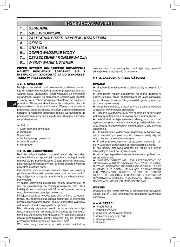 en it de es fr nl 1... 2... 3... 4... 5... 6... 7... 8... INSTRUKCJA OBSŁUGI DZIAŁANIE UMIEJSCOWIENIE ZALECENIA PRZED UŻYCIEM URZĄDZENIA CZĘŚCI OBSŁUGA ODPROWADZENIE WODY CZYSZCZENIE I KONSERWACJA WYKRYWANIE USTEREK pt PRZED UŻYCIEM NINIEJSZEGO URZĄDZENIA NALEŻY DOKŁADNIE ZAPOZNAĆ SIĘ Z da INSTRUKCJĄ I ZACHOWAĆ JĄ DO WYKORZYSTANIA W PRZYSZŁOŚCI. fi no sv pl LT LV ►►► 1. DZIAŁANIE Niniejszy produkt służy do osuszania powietrza. Kontroluje on wilgotność względną poprzez przepuszczenie powietrza przez urządzenie, doprowadzając do skraplania się nadmiaru wilgoci na elementach chłodzących. Kontakt z zimną powierzchnią powoduje skraplanie się wilgoci w powietrzu. Następnie skroplona woda zostaje bezpiecznie odprowadzona do zbiornika wody. Wysuszone powietrze przechodzi przez skraplacz, w którym zostaje nieznacznie ogrzane, a następnie ponownie zostaje wprowadzone do pomieszczenia, przy czym jego temperatura jest nieznacznie podwyższona. NL ►► FIG. 1 1. wylot suchego powietrza, 2. skraplacz, NO 3. parownik, 4. wlot wilgotnego powietrza, PL 5. zbiornik wodny, 6. kompresor RO ►►► 2. UMIEJSCOWIENIE Nadmiar wilgoci będzie rozprzestrzeniać się po całym RU domu w takim sam sposób jak zapach w czasie gotowania roznosi się po pomieszczeniu. Z tego powodu, osuszacz SE powinien być umieszczony tak, by mógł pobierać wilgotne powietrze z całego domu. SI Opcjonalnie, jeśli w jednym miejscu pojawi się poważny problem, możliwe jest umieszczenie osuszacza w pobliżu tego miejsca, a następnie przeniesienie go w bardziej cenSK tralny punkt. W czasie ustawiania osuszacza, należy upewnić się, że UA jest on umieszczony na równej powierzchni oraz, że z każdej strony urządzenia jest 10 cm (4”) przestrzeni, aby SE umożliwić wydajny przepływ powietrza. Niniejszy osuszacz wyposażony jest w kółka samonastawne, aby zapewnić jego lepszą mobilność. W momencie SI przemieszczania urządzania, należy je przedtem wyłączyć, natomiast zbiornik z wodą należy opróżnić. SK Nie zaleca się używania przedłużacza, w związku z tym należy upewnić się, że urządzenie znajduje się dostateczTR nie blisko zamocowanego gniazdka. W razie konieczności użycia przedłużacza, należy upewnić się, że średnica, przewodów kabla wynosi co najmniej 1 mm2. UA W czasie pracy osuszacza, w razie konieczności drzwi zewnętrzne i okna powinny być zamknięte, aby zapewnić jak największą wydajność urządzenia. ►►► 3. ZALECENIA PRZED UŻYCIEM UWAGA! ►► Urządzenie musi zawsze znajdować się w pozycji pionowej. ►► Urządzenie należy pozostawić na jedną godzinę w pozycji stojącej przed podłączeniem do sieci zasilającej po przetransportowaniu lub gdy zostało przechylone (np. podczas czyszczenia). ►► Wszelkie ciała obce należy trzymać z dala od otworów wlotowych i wylotowych ptowietrza. ►► Zasilanie elektryczne musi być zgodne ze specyfikacją wskazaną na tabliczce znamionowej z tyłu urządzenia. ►► Jeżeli kabel zasilający jest uszkodzony, musi on zostać wymieniony przez autoryzowanego przedstawiciela serwisu (osobę o odpowiednich kwalifikacjach), aby uniknąć zagrożenia. ►► Do załączenia i wyłączenia urządzenia, w żadnym wypadku nie należy używać wtyczki. Zawsze należy używać włącznika na panelu sterowniczym. ►► Przed przemieszczeniem urządzenia, należy je najpierw wyłączyć, a następnie opróżnić zbiornik z wodą. ►► Nie należy stosować aerozoli na robaki lub innych łatwopalnych środków czyszczących. ►► W żadnym wypadku urządzenia nie wolno polewać lub spryskiwać wodą. ►► NINIEJSZY SPRZĘT NIE JEST PRZEZNACZONY DO UŻYTKOWANIA PRZEZ OSOBY (W TYM DZIECI) O OGRANICZONEJ ZDOLNOŚCI FIZYCZNEJ, CZUCIOWEJ LUB PSYCHICZNEJ, LUB OSOBY NIE MAJĄCE DOŚWIADCZENIA LUB ZNAJOMOŚCI SPRZĘTU, CHYBA ŻE ODBYWA SIĘTO POD NADZOREM LUB ZGODNIE Z INSTRUKCJĄ UŻYTKOWANIA SPRZĘTU, PRZEKAZANEJ PRZEZ OSOBY ODPOWIADAJĄCE ZA ICH BEZPIECZEŃSTWO. WAŻNE! Urządzenia nie należy używać w temperaturze pokojowej niższej niż 5oC, aby uniemożliwić oblodzenie wężownika parownicy. ►►► 4. CZĘŚCI ►► Przód FIG. 2 1. Przycisk ON/OFF 2. Wskaźnik „Wypełnienia Wodą” 3. Wskaźnik pracy sprężarki 4. Wylot powietrza 5. Uchwyt ►► Tył FIG. 3 6. Filtr powietrza / Wlot powietrza 7. Zbiornik wody 8. Przewód zasilający ►►► 5. OBSŁUGA 1. Podłącz urządzenie do właściwego gniazda zasilającego. (Proszę sprawdzić wartości napięcia/częstotliwości na tabliczce znamionowej urządzenia). 2. Naciśnij przycisk ON/OFF aby uruchomić urządzenie. Sprężarka zacznie działać. 3. Aby wyłączyć urządzenie, należy jeszcze raz nacisnąć przycisk ON/OFF. ►►► 6. ODPROWADZENIE WODY Gdy zbiornik wody jest wypełniony, sprężarka wyłączy się samoczynnie dla bezpieczeństwa, a wskaźnik wypełnienia wodą zaświeci się na czerwono. Aby usunąć zbiornik wody, wysuń go prostopadle z urządzenia. Po opróżnieniu zbiornika wody, umieść go z powrotem na jego miejscu. Upewnij się, że jest on właściwie umieszczony, wtedy kontrolka zapełnienia wodą zgaśnie i osuszacz włączy się. Zauważ, że jeśli zbiornik nie zostanie prawidłowo włożony, wskaźnik zapełnienia wciąż będzie się świecił na czerwono. CIĄGŁE ODPROWADZENIE Jeśli osuszacz jest użytkowany w warunkach wysokiej wilgotności powietrza, zbiornik wody wymagać będzie częstszego opróżniania. W takiej sytuacji znacznie wygodniej jest ustawić ciągłe opróżnianie zbiornika, w tym celu należy wykonać następujące czynności: 1. Usuń zbiornik wody (FIG. 4). 2. Podłącz przewód na wodę do otworu wylotowego o średnicy: 11 mm (przewód nie jest dostarczony w komplecie z urządzeniem) (FIG. 5). 3. Upewnij się, że przewód jest właściwie przymocowany i woda ścieka bez przeszkód. Uwaga! W bardzo niskich temperaturach należy dodatkowo zabezpieczyć prze