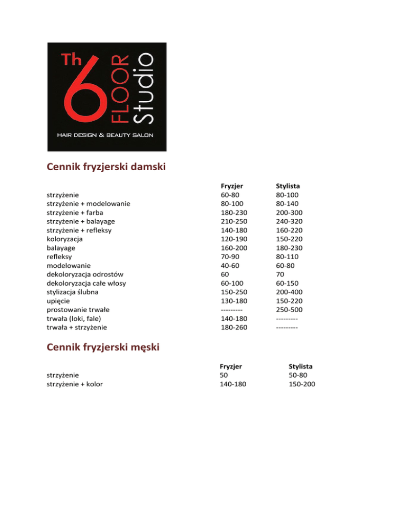 Cennik fryzjerski damski Cennik fryzjerski męski
