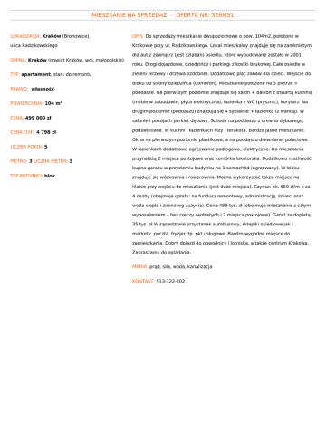 MIESZKANIE NA SPRZEDAŻ - OFERTA NR: 326MS1 LOKALIZACJA: Kraków (Bronowice), OPIS: Do sprzedaży mieszkanie dwupoziomowe o pow. 104m2, położone w ulica Radzikowskiego Krakowie przy ul. Radzikowskiego. Lokal mieszkalny znajduje się na zamkniętym GMINA: Kraków (powiat Kraków, woj. małopolskie) TYP: apartament, stan: do remontu dla aut z zewnątrz (jest szlaban) osiedlu, które wybudowane zostało w 2001 roku. Drogi dojazdowe, dziedzińce i parkingi z kostki brukowej. Całe osiedle w zieleni (krzewy i drzewa ozdobne). Dodatkowo plac zabaw dla dzieci. Wejście do bloku od strony dziedzińca (domofon). Mieszkanie położone na 3 piętrze + PRAWO: własność POWIERCHNIA: 104 m2 poddasze. Na pierwszym poziomie znajduje się salon + balkon z otwartą kuchnią (meble w zabudowie, płyta elektryczna), łazienka z WC (prysznic), korytarz. Na drugim poziomie (poddaszu) znajdują się 4 sypialnie + łazienka (z wanną). W CENA: 499 000 zł CENA /1M2: 4 798 zł salonie i pokojach parkiet dębowy. Schody na poddasze z drewna dębowego, podświetlane. W kuchni i łazienkach flizy i terakota. Bardzo jasne mieszkanie. Okna na pierwszym poziomie plastikowe, a na poddaszu drewniane, połaciowe. LICZBA POKOI: 5 PIĘTRO: 3 LICZBA PIĘTER: 3 W łazienkach dodatkowo ogrzewanie podłogowe, elektryczne. Do mieszkania przynależą 2 miejsca postojowe oraz komórka lokatorska. Dodatkowo możliwość kupna garażu w przyziemiu budynku na 1 samochód (ogrzewany). W bloku TYP BUDYNKU: blok znajduje się wózkownia i rowerownia. Można wykorzystać także miejsce na klatce przy wejściu do mieszkania (jest dużo miejsca). Czynsz: ok. 650 zł/m-c za 4 osoby (obejmuje opłaty: na fundusz remontowy, administrację, śmieci oraz woda ciepła i zimna wg zużycia). Cena 499 tys. zł (obejmuje mieszkanie z całym wyposażeniem – bez rzeczy osobistych i 2 miejsca postojowe). Garaż za dopłatą 35 tys. zł W sąsiedztwie przystanek autobusowy, sklepiki osiedlowe jak i markety, poczta, fryzjer itp. pkt usługowe. Bardzo wygodne miejsce do zamieszkania. Dobry dojazd do obwodnicy i lotniska, a także centrum Krakowa. Zapraszamy do oglądania. MEDIA: prąd, siła, woda, kanalizacja KONTAKT: 513-122-202 TREŚĆ NINIEJSZEGO OGŁOSZENIA NIE STANOWI OFERTY HANDLOWEJ W ROZUMIENIU KODEKSU CYWILNEGO, A DANE W NIEJ ZAWARTE MAJĄ CHARAKTER INFORMACYJNY I MOGĄ ULEC ZMIANIE NIERUCHOMOŚCI MILA | 30-148 Kraków, ul. Lindego 1 | www.nieruchomosci-mila.pl