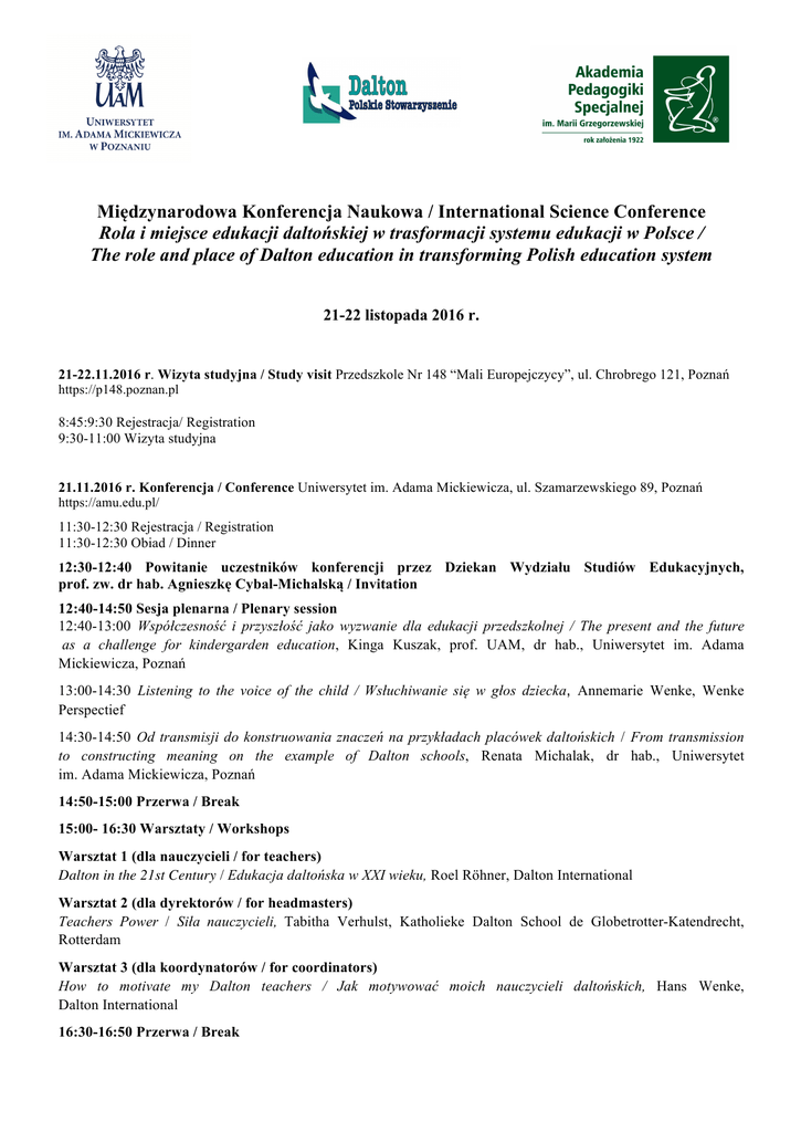 Międzynarodowa Konferencja Naukowa / International Science Conference Rola i miejsce edukacji daltońskiej w trasformacji systemu edukacji w Polsce / The role and place of Dalton education in transforming Polish education system 21-22 listopada 2016 r. 21-22.11.2016 r. Wizyta studyjna / Study visit Przedszkole Nr 148 “Mali Europejczycy”, ul. Chrobrego 121, Poznań https://p148.poznan.pl 8:45:9:30 Rejestracja/ Registration 9:30-11:00 Wizyta studyjna 21.11.2016 r. Konferencja / Conference Uniwersytet im. Adama Mickiewicza, ul. Szamarzewskiego 89, Poznań https://amu.edu.pl/ 11:30-12:30 Rejestracja / Registration 11:30-12:30 Obiad / Dinner 12:30-12:40 Powitanie uczestników konferencji przez Dziekan Wydziału Studiów Edukacyjnych, prof. zw. dr hab. Agnieszkę Cybal-Michalską / Invitation 12:40-14:50 Sesja plenarna / Plenary session 12:40-13:00 Współczesność i przyszłość jako wyzwanie dla edukacji przedszkolnej / The present and the future as a challenge for kindergarden education, Kinga Kuszak, prof. UAM, dr hab., Uniwersytet im. Adama Mickiewicza, Poznań 13:00-14:30 Listening to the voice of the child / Wsłuchiwanie się w głos dziecka, Annemarie Wenke, Wenke Perspectief 14:30-14:50 Od transmisji do konstruowania znaczeń na przykładach placówek daltońskich / From transmission to constructing meaning on the example of Dalton schools, Renata Michalak, dr hab., Uniwersytet im. Adama Mickiewicza, Poznań 14:50-15:00 Przerwa / Break 15:00- 16:30 Warsztaty / Workshops Warsztat 1 (dla nauczycieli / for teachers) Dalton in the 21st Century / Edukacja daltońska w XXI wieku, Roel Röhner, Dalton International Warsztat 2 (dla dyrektorów / for headmasters) Teachers Power / Siła nauczycieli, Tabitha Verhulst, Katholieke Dalton School de Globetrotter-Katendrecht, Rotterdam Warsztat 3 (dla koordynatorów / for coordinators) How to motivate my Dalton teachers / Jak motywować moich nauczycieli daltońskich, Hans Wenke, Dalton International 16:30-16:50 Przerwa / Break 16:50-17:35 Warsztaty / Workshops Warsztat 4 (dla nauczycieli przedszkoli / for kindergarden’s teachers) Świadomy nauczyciel - samodzielny przedszkolak. Sposoby aktywizacji potencjału poznawczego dziecka w kontekście edukacji daltońskiej i froeblowskiej / A conscious teacher equals a self-reliant kindergartener. Techniques for activating a child's cognitive potential in the context of Dalton and Froebel education, Katarzyna Małek, Przedszkole Nr 43, Lublin Warsztat 5 (dla nauczycieli przedszkoli / kindergarden’s teachers) Samodzielność i odpowiedzialność w kontekście edukacji poza salą dzieci / Responsibility and self-reliance in the context of children's education outside a classroom, Kinga Wiśniewska, Karolina Zawalska, Przedszkole Nr 148 “Mali Europejczycy”, Poznań Warsztat 6 (dla nauczycieli szkół / for school’s teachers) Ocenianie kształtujące w planie daltońskim / Formative assessment in the Dalton Plan, Anna Siemiątkowska, Szkoła Podstawowa, Dzbenin Warsztat 7 (dla nauczycieli szkół) Autonomia, jako podstawa systemu pedagogiki daltońskiej w polskiej szkole / Autonomy as the basis for the Dalton pedagogy system in Polish schools, Anna Sowińska, Alter Edukacja, Łódź 17:35-17:50 Przerwa / Break 17:50-18:10 Sesja plenarna / Plenary session Edukacja daltońska a Edukacja dla Zrównoważonego Rozwoju / Dalton Education vs Education for Sustainable Development, Ewa Lewandowska, dr, Akademia Pedagogiki Specjalnej im. Marii Grzegorzewskiej, Warszawa 18:10-19:00 Podsumowanie, wręczenie certyfikatów i zakończenie Konferencji / Closing ceremony Organizatorzy: Uniwersytet im. Adama Mickiewiczaw w Poznaniu, Wydział Studiów Edukacyjnych Akademia Pedagogiki Specjalnej im. Marii Grzegorzewskiej w Warszawie, Zakład Wczesnej Edukacji Polskie Stowarzyszenie Dalton Komitet naukowy: Józefa Bałachowicz, dr hab., prof. APS Hanna Krauze-Sikorska, dr hab., prof. UAM Kinga Kuszak, dr hab., prof. UAM - Przewodnicząca Komitetu Naukowego z UAM Ewa Lewandowska, dr, APS – Przewodnicząca Komitetu Naukowego z APS Roel Röhner - President Dalton International Komitet organizacyjny: Polskie Stowarzyszenie Dalton Wydział Studiów Edukacyjnych: mgr Karolina Domagalska-Nowak, mgr Jakub Kaźmierczak Partnerzy strategiczni: Organisation Mondiale Pour L’Éducation Préscolaire Organización Mundial Para La Educatión Preescolar World Organization for Early Childhood Education Polski Komitet Światowej Organizacji Wychowania Przedszkolnego OMEP