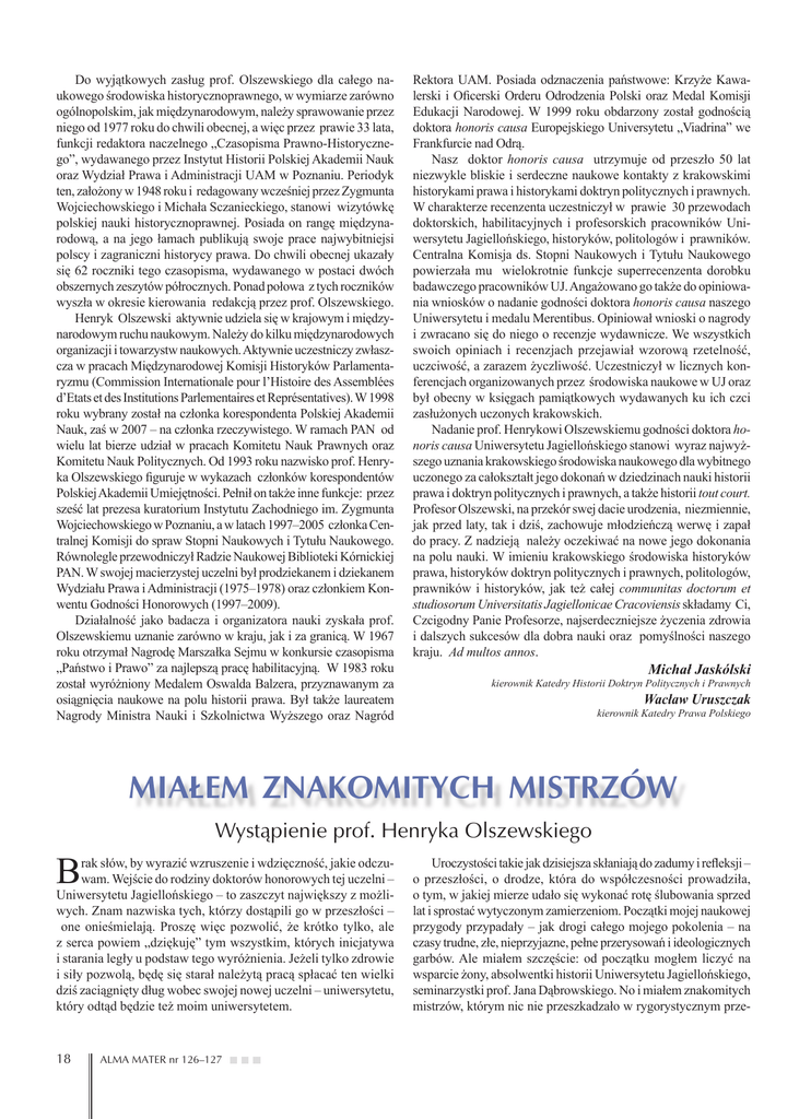 Do wyjątkowych zasług prof. Olszewskiego dla całego naukowego środowiska historycznoprawnego, w wymiarze zarówno ogólnopolskim, jak międzynarodowym, należy sprawowanie przez niego od 1977 roku do chwili obecnej, a więc przez prawie 33 lata, funkcji redaktora naczelnego „Czasopisma Prawno-Historycznego”, wydawanego przez Instytut Historii Polskiej Akademii Nauk oraz Wydział Prawa i Administracji UAM w Poznaniu. Periodyk ten, założony w 1948 roku i redagowany wcześniej przez Zygmunta Wojciechowskiego i Michała Sczanieckiego, stanowi wizytówkę polskiej nauki historycznoprawnej. Posiada on rangę międzynarodową, a na jego łamach publikują swoje prace najwybitniejsi polscy i zagraniczni historycy prawa. Do chwili obecnej ukazały się 62 roczniki tego czasopisma, wydawanego w postaci dwóch obszernych zeszytów półrocznych. Ponad połowa z tych roczników wyszła w okresie kierowania redakcją przez prof. Olszewskiego. Henryk Olszewski aktywnie udziela się w krajowym i międzynarodowym ruchu naukowym. Należy do kilku międzynarodowych organizacji i towarzystw naukowych. Aktywnie uczestniczy zwłaszcza w pracach Międzynarodowej Komisji Historyków Parlamentaryzmu (Commission Internationale pour l’Histoire des Assemblées d’Etats et des Institutions Parlementaires et Représentatives). W 1998 roku wybrany został na członka korespondenta Polskiej Akademii Nauk, zaś w 2007 – na członka rzeczywistego. W ramach PAN od wielu lat bierze udział w pracach Komitetu Nauk Prawnych oraz Komitetu Nauk Politycznych. Od 1993 roku nazwisko prof. Henryka Olszewskiego figuruje w wykazach członków korespondentów Polskiej Akademii Umiejętności. Pełnił on także inne funkcje: przez sześć lat prezesa kuratorium Instytutu Zachodniego im. Zygmunta Wojciechowskiego w Poznaniu, a w latach 1997–2005 członka Centralnej Komisji do spraw Stopni Naukowych i Tytułu Naukowego. Równolegle przewodniczył Radzie Naukowej Biblioteki Kórnickiej PAN. W swojej macierzystej uczelni był prodziekanem i dziekanem Wydziału Prawa i Administracji (1975–1978) oraz członkiem Konwentu Godności Honorowych (1997–2009). Działalność jako badacza i organizatora nauki zyskała prof. Olszewskiemu uznanie zarówno w kraju, jak i za granicą. W 1967 roku otrzymał Nagrodę Marszałka Sejmu w konkursie czasopisma „Państwo i Prawo” za najlepszą pracę habilitacyjną. W 1983 roku został wyróżniony Medalem Oswalda Balzera, przyznawanym za osiągnięcia naukowe na polu historii prawa. Był także laureatem Nagrody Ministra Nauki i Szkolnictwa Wyższego oraz Nagród Rektora UAM. Posiada odznaczenia państwowe: Krzyże Kawalerski i Oficerski Orderu Odrodzenia Polski oraz Medal Komisji Edukacji Narodowej. W 1999 roku obdarzony został godnością doktora honoris causa Europejskiego Universytetu „Viadrina” we Frankfurcie nad Odrą. Nasz doktor honoris causa utrzymuje od przeszło 50 lat niezwykle bliskie i serdeczne naukowe kontakty z krakowskimi historykami prawa i historykami doktryn politycznych i prawnych. W charakterze recenzenta uczestniczył w prawie 30 przewodach doktorskich, habilitacyjnych i profesorskich pracowników Uniwersytetu Jagiellońskiego, historyków, politologów i prawników. Centralna Komisja ds. Stopni Naukowych i Tytułu Naukowego powierzała mu wielokrotnie funkcje superrecenzenta dorobku badawczego pracowników UJ. Angażowano go także do opiniowania wniosków o nadanie godności doktora honoris causa naszego Uniwersytetu i medalu Merentibus. Opiniował wnioski o nagrody i zwracano się do niego o recenzje wydawnicze. We wszystkich swoich opiniach i recenzjach przejawiał wzorową rzetelność, uczciwość, a zarazem życzliwość. Uczestniczył w licznych konferencjach organizowanych przez środowiska naukowe w UJ oraz był obecny w księgach pamiątkowych wydawanych ku ich czci zasłużonych uczonych krakowskich. Nadanie prof. Henrykowi Olszewskiemu godności doktora honoris causa Uniwersytetu Jagiellońskiego stanowi wyraz najwyższego uznania krakowskiego środowiska naukowego dla wybitnego uczonego za całokształt jego dokonań w dziedzinach nauki historii prawa i doktryn politycznych i prawnych, a także historii tout court. Profesor Olszewski, na przekór swej dacie urodzenia, niezmiennie, jak przed laty, tak i dziś, zachowuje młodzieńczą werwę i zapał do pracy. Z nadzieją należy oczekiwać na nowe jego dokonania na polu nauki. W imieniu krakowskiego środowiska historyków prawa, historyków doktryn politycznych i prawnych, politologów, prawników i historyków, jak też całej communitas doctorum et studiosorum Universitatis Jagiellonicae Cracoviensis składamy Ci, Czcigodny Panie Profesorze, najserdeczniejsze życzenia zdrowia i dalszych sukcesów dla dobra nauki oraz pomyślności naszego kraju. Ad multos annos. Michał Jaskólski kierownik Katedry Historii Doktryn Politycznych i Prawnych Wacław Uruszczak kierownik Katedry Prawa Polskiego MIAŁEM ZNAKOMITYCH MISTRZÓW Wystąpienie prof. Henryka Olszewskiego B rak słów, by wyrazić wzruszenie i wdzięczność, jakie odczuwam. Wejście do rodziny doktorów honorowych tej uczelni – Uniwersytetu Jagiellońskiego – to zaszczyt największy z możliwych. Znam nazwiska tych, którzy dostąpili go w przeszłości – one onieśmielają. Proszę więc pozwolić, że krótko tylko, ale z serca powiem „dziękuję” tym wszystkim, których inicjatywa i starania legły u podstaw tego wyróżnienia. Jeżeli tylko zdrowie i siły pozwolą, będę się starał należytą pracą spłacać ten wielki dziś zaciągnięty dług wobec swojej nowej uczelni – uniwersytetu, który odtąd będzie też moim uniwersytetem. 18 ALMA MATER nr 126–127 Uroczystości takie jak dzisiejsza skłaniają do zadumy i refleksji – o przeszłości, o drodze, która do współczesności prowadziła, o tym, w jakiej mierze udało się wykonać rotę ślubowania sprzed lat i sprostać wytyczonym zamierzeniom. Pocz