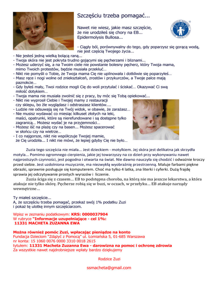 Szczęściu trzeba pomagać... Nawet nie wiesz, jakie masz szczęście, że nie urodziłeś się chory na EB... Epidermolysis Bullosa... - Ciągły ból, porównywalny do tego, gdy poparzysz się gorącą wodą, nie jest częścią Twojego życia... - Nie jesteś jedną wielką bolącą raną... - Twoja skóra nie jest pokryta trudno gojącymi się pęcherzami i bliznami... - Możesz uderzyć się, a na Twoim ciele nie powstanie bolesny pęcherz, który Twoja mama, mimo Twoich protestów, będzie musiała przekłuć… - Nikt nie pomyśli o Tobie, że Twoja mama Cię nie upilnowała i dotkliwie się poparzyłeś… - Masz ręce i nogi wolne od zniekształceń, zrostów i przykurczów, a Twoje palce mają paznokcie… - Gdy byłeś mały, Twoi rodzice mogli Cię do woli przytulać i ściskać… Okazywać Ci swą miłość dotykiem… - Twoja mama nie musiała zwolnić się z pracy, by móc się Tobą opiekować... - Nikt nie wyprosił Ciebie i Twojej mamy z restauracji czy sklepu, bo źle wyglądasz i odstraszasz klientów.... - Ludzie nie odsuwają się na Twój widok, w obawie, że zarażasz… - Nie musisz wydawać co miesiąc kilkuset złotych na leki, maści, opatrunki, które są nierefundowane i są dostępne tylko zagranicą… Możesz wydać je na przyjemności… - Możesz iść na plażę czy na basen... Możesz spacerować w słońcu czy na wietrze… - I co najgorsze, nikt nie współczuje Twojej mamie, że Cię urodziła... I nikt nie mówi, że lepiej gdyby Cię nie było… Zuzia tego szczęścia nie miała... Jest dzieckiem - motylkiem. Jej skóra jest delikatna jak skrzydła motyla... Pomimo ogromnego cierpienia, jakie jej towarzyszy na co dzień przy wykonywaniu nawet najprostszych czynności, jest pogodna i otwarta na świat. Nie dawno nauczyła się chodzić i odważnie kroczy przed siebie. Jest uzdolniona muzycznie, ma niezwykłą wyobraźnię przestrzenną. Maluje farbami piękne obrazki, sprawnie posługuje się komputerem. Choć ma tylko 4 latka, zna literki i cyferki. Dużą frajdę sprawia jej odczytywanie prostych wyrazów i liczenie. Zuzia ściga się z czasem… EB to podstępna choroba, na którą nie ma jeszcze lekarstwa, a która atakuje nie tylko skórę. Pęcherze robią się w buzi, w oczach, w przełyku… EB atakuje narządy wewnętrzne… Ty miałeś szczęście... A, że szczęściu trzeba pomagać, przekaż swój 1% podatku Zuzi i pokaż tę ulotkę innym szczęściarzom. Wpisz w zeznaniu podatkowym: KRS: 0000037904 W rubryce “Informacje uzupełniające - cel 1%: 11331 MACHETA ZUZANNA EWA Można również pomóc Zuzi, wpłacając pieniądze na konto Fundacja Dzieciom “Zdążyć z Pomocą” ul. Łomiańska 5, 01-685 Warszawa nr konta: 15 1060 0076 0000 3310 0018 2615 tytułem: 11331 Macheta Zuzanna Ewa - darowizna na pomoc i ochronę zdrowia Za wszystkie nawet najdrobniejsze wpłaty bardzo dziękujemy Rodzice Zuzi [email protected]