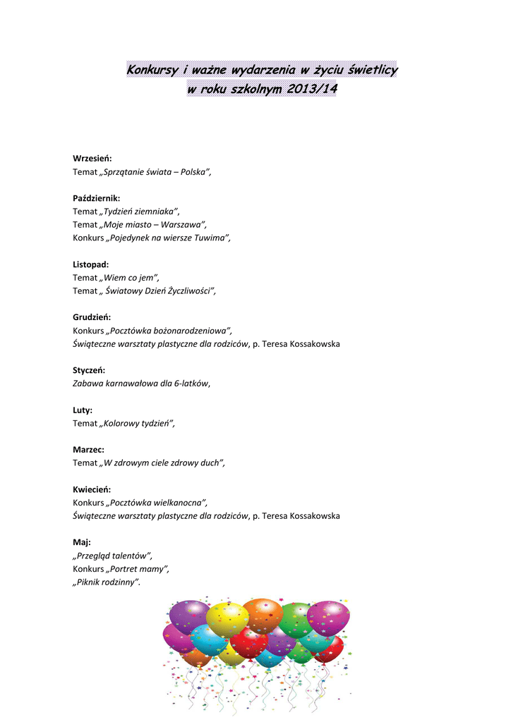 Konkursy i ważne wydarzenia w życiu świetlicy w roku szkolnym 2013/14 Wrzesień: Temat „Sprzątanie świata – Polska”, Październik: Temat „Tydzień ziemniaka”, Temat „Moje miasto – Warszawa”, Konkurs „Pojedynek na wiersze Tuwima”, Listopad: Temat „Wiem co jem”, Temat „ Światowy Dzień Życzliwości”, Grudzień: Konkurs „Pocztówka bożonarodzeniowa”, Świąteczne warsztaty plastyczne dla rodziców, p. Teresa Kossakowska Styczeń: Zabawa karnawałowa dla 6-latków, Luty: Temat „Kolorowy tydzień”, Marzec: Temat „W zdrowym ciele zdrowy duch”, Kwiecień: Konkurs „Pocztówka wielkanocna”, Świąteczne warsztaty plastyczne dla rodziców, p. Teresa Kossakowska Maj: „Przegląd talentów”, Konkurs „Portret mamy”, „Piknik rodzinny”.