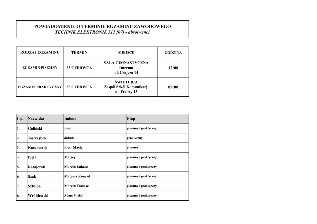 POWIADOMIENIE O TERMINIE EGZAMINU ZAWODOWEGO TECHNIK ELEKTRONIK 311 [07] - absolwenci RODZAJ EGZAMINU TERMIN MIEJSCE GODZINA EGZAMIN PISEMNY 23 CZERWCA SALA GIMNASTYCZNA Internat ul. Czajcza 14 12:00 EGZAMIN PRAKTYCZNY 25 CZERWCA ŚWIETLICA Zespół Szkół Komunikacji ul. Fredry 13 09:00 Lp. Nazwisko Imiona Etap 1. Goliński Piotr pisemny i praktyczny 2. Jastrząbek Jakub praktyczny 3. Kaczmarek Piotr Maciej pisemny 4. Pięta Maciej pisemny i praktyczny 5. Ratajczak Marcin Łukasz pisemny i praktyczny 6. Szak Mateusz Konrad pisemny i praktyczny 7. Sztulpa Marcin Tomasz pisemny i praktyczny 8. Wróblewski Adam Michał pisemny i praktyczny
