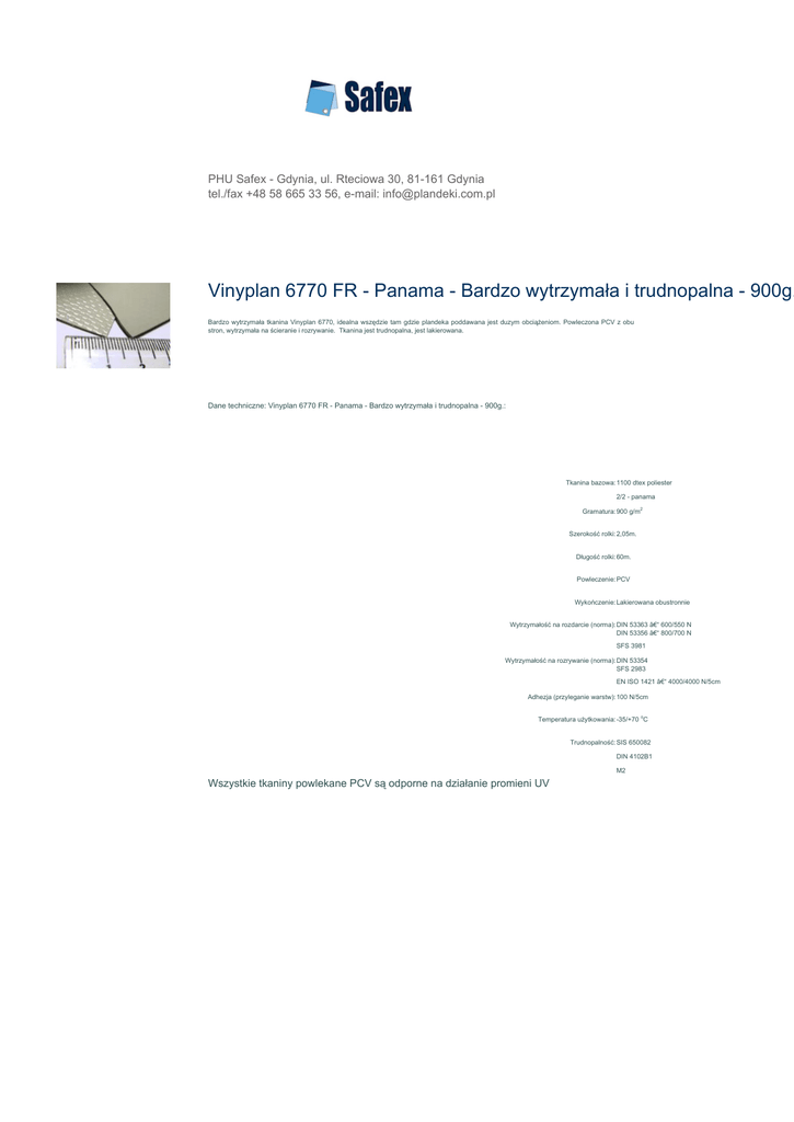 PHU Safex - Gdynia, ul. Rteciowa 30, 81-161 Gdynia tel./fax +48 58 665 33 56, e-mail: [email protected] Vinyplan 6770 FR - Panama - Bardzo wytrzymała i trudnopalna - 900g. Bardzo wytrzymała tkanina Vinyplan 6770, idealna wszędzie tam gdzie plandeka poddawana jest duzym obciążeniom. Powleczona PCV z obu stron, wytrzymała na ścieranie i rozrywanie. Tkanina jest trudnopalna, jest lakierowana. Dane techniczne: Vinyplan 6770 FR - Panama - Bardzo wytrzymała i trudnopalna - 900g.: Tkanina bazowa: 1100 dtex poliester 2/2 - panama Gramatura: 900 g/m2 Szerokość rolki: 2,05m. Długość rolki: 60m. Powleczenie: PCV Wykończenie: Lakierowana obustronnie Wytrzymałość na rozdarcie (norma): DIN 53363 – 600/550 N DIN 53356 – 800/700 N SFS 3981 Wytrzymałość na rozrywanie (norma): DIN 53354 SFS 2983 EN ISO 1421 – 4000/4000 N/5cm Adhezja (przyleganie warstw): 100 N/5cm Temperatura użytkowania: -35/+70 oC Trudnopalność: SIS 650082 DIN 4102B1 M2 Wszystkie tkaniny powlekane PCV są odporne na działanie promieni UV