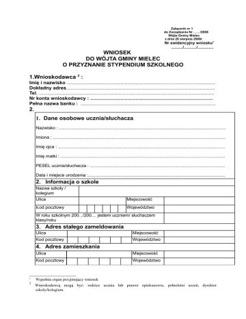 Załącznik nr 1 do Zarządzenia Nr ……/2008 Wójta Gminy Mielec z dnia 26 sierpnia 2008r Nr ewidencyjny wniosku1 ........../.........../.............. WNIOSEK DO WÓJTA GMINY MIELEC O PRZYZNANIE STYPENDIUM SZKOLNEGO 1.Wnioskodawca 2 : Imię i nazwisko ............................................................................................................ Dokładny adres............................................................................................................ Tel. ............................................................................................................................................ Nr konta wnioskodawcy : ......................................................................................... Pełna nazwa banku : .................................................................................................. 2. 1. Dane osobowe ucznia/słuchacza. Nazwisko : ................................................................................................................................................... Imiona : ............................................................................................................................................. Imię ojca : .................................................................................................................................... Imię matki : ................................................................................................................................ PESEL ucznia/słuchacza : ....................................................................................................................... Data i miejsce urodzenia :........................................................................................................................ 2. Informacja o szkole Nazwa szkoły / kolegium Ulica Miejscowość Kod pocztowy Województwo W roku szkolnym 200.../200.... jestem uczniem/ słuchaczem klasy/roku 3. Adres stałego zameldowania Ulica Miejscowość Kod pocztowy Województwo 4. Adres zamieszkania 1 2 Ulica Miejscowość Kod pocztowy Województwo Wypełnia organ przyjmujący wniosek Wnioskodawcą mogą być: rodzice ucznia lub prawni opiekunowie, pełnoletni uczeń, dyrektor szkoły/kolegium. 3. Wnioskowana Lp. 1. 2. 3. 4. forma świadczenia Rodzaj formy stypendium pomocy materialnej: Opis pokrycie kosztów udziału w zajęciach edukacyjnych organizowanych w szkole (opisać rodzaj zajęć oraz wskazać szkołę, która je realizuje) pokrycie kosztów udziału w zajęciach edukacyjnych organizowanych poza szkołą (opisać rodzaj zajęć oraz wskazać ich organizatora) pomoc rzeczowa o charakterze edukacyjnym w tym w szczególności zakup podręczników oraz innych przedmiotów ściśle związanych z procesem edukacyjnym (wskazać nazwę rzeczy, będących przedmiotem pomocy) pokrycie kosztów związanych z pobieraniem nauki poza miejscem 3 zamieszkania (wskazać rodzaj kosztów oraz miejsce ich ponoszenia) 5. Innej nie wymienionej wyżej pomocy rzeczowej o charakterze edukacyjnym (wskazać rodzaj pomocy, nazwę) 4. Uzasadnienie wniosku: .................................................................................................................... .................................................................................................................... .................................................................................................................... 5. Informacja o sytuacji rodziny ucznia. W rodzinie ucznia występuje4: a) bezrobocie b) niepełnosprawność c) ciężka lub długotrwała choroba d) brak umiejętności wypełniania funkcji opiekuńczowychowawczych e) alkoholizm f) narkomania g) niepełna rodzina h) wystąpiło zdarzenie losowe 6. Informacja o pobieraniu przez ucznia innego stypendium o charakterze socjalnym ze środków publicznych 5 ………………………………………………………………………………... ………………………………………………………………………………........ 7. Oświadczenie o sytuacji rodzinnej i materialnej ucznia. 3 Dotyczy uczniów szkół ponadgimnazjalnych i kolegiów Należy podkreślić właściwe 5 Należy określić rodzaj stypendium, jego wysokość oraz okres pobierania 4 Oświadczam, że w miesiącu ...............200….r. (miesiąc kalendarzowy poprzedzający datę złożenia wniosku) dochody moje i osób zamieszkałych w moim gospodarstwie domowym przedstawiały się następująco 6 : Imię i nazwisko Lp PESEL Stopień Data Status członka Dochód i źródła pokrewieństwa urodzenia rodziny* dochodu** 1. 2. 3. 4. 5. 6. 7. 8. 9. 10. 11. Razem Ilość hektarów przeliczeniowych posiadanego przez rodzinę gospodarstwa rolnego : .......................hektara. Miesięczny dochód z gospodarstwa rolnego wynosi ...........................zł ( ilość hektarów przeliczeniowych x ……… zł) Łączny dochód miesięczny gospodarstwa domowego wynosi ...........................zł ( poz.11 z tabeli plus miesięczny dochód z gospodarstwa rolnego) Dochód na 1 osobę miesięcznie wynosi ...........................zł ( poz. 11 z tabeli dzielona przez liczbę członków rodziny lub w przypadku posiadania gospodarstwa rolnego pozycja zatytułowana łączny dochód miesięczny gospodarstwa domowego dzielona przez liczbę członków rodziny) 6 Wnioskodawca wpisuje wszystkich członków rodziny zamieszkałych we wspólnym gospodarstwie domowym niezależnie od tego czy uzyskują dochody czy nie. * Należy wpisać np. osoba pracująca, bezrobotny, rencista, emeryt, rolnik, uczeń itp. ** Należy wpisać np. wynagrodzenie, zasiłki: dla bezrobotnych, rodzinny, z pomocy społecznej, świadczenia rodzinne, otrzymywane alimenty, renta, emerytura itp. Ponadto oświadczam, że dochód obliczyłem/am sposobem wskazanym w ustawie o pomocy społecznej (Dz. U. z 2004r. Nr 64, poz. 593, Nr 99, poz.1001 i Nr 273, poz.2703) i nie osiągam dochodów z innych
