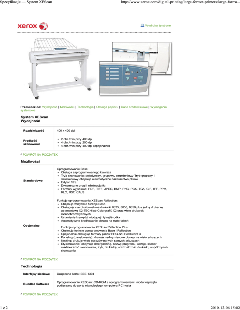 Specyfikacje — System XEScan 1z2 http://www.xerox.com/digital-printing/large-format-printers/large-forma... Wydrukuj tę stronę Przeskocz do: Wydajność | Możliwości | Technologia | Obsługa papieru | Dane środowiskowe | Wymagania systemowe System XEScan Wydajność Rozdzielczość 400 x 400 dpi 2 obr./min przy 400 dpi 4 obr./min przy 200 dpi 4 obr./min przy 400 dpi (opcjonalne) Prędkość skanowania ^ POWRÓT NA POCZĄTEK Możliwości Standardowo Oprogramowanie Base: Obsługa zaprogramowanego klawisza Tryb skanowania: pojedynczy, grupowy, strumieniowy Tryb grupowy i strumieniowy obejmuje automatyczne nazewnictwo plików Edytor filtra Dynamiczne progi i eliminacja tła Formaty wyjściowe: PDF, TIFF, JPEG, BMP, PNG, PCX, TGA, GIF, IFF, PPM, RLC, RST, CALS Funkcje oprogramowania XEScan Reflection: Obejmuje wszystkie funkcje Base Obsługuje szerokoformatowe drukarki 8825, 8830, 8850 plus jedną drukarkę atramentową X2-TECH lub ColorgrafX X2 oraz wiele drukarek monochromatycznych Ustawienie krawędzi wiodącej i tylnej/środka Automatyczne środkowanie obrazu na materiałach Opcjonalne Funkcje oprogramowania XEScan Reflection Plus: Obejmuje funkcje oprogramowania Base i Reflection Opcjonalnie obsługuje formaty plików HPGL/2 i PostScript 3 Paneling (panelowanie): drukuje nadwymiarowe obrazy na wielu arkuszach Nesting: drukuje wiele obrazów na tych samych arkuszach Etykietowanie: obejmuje datę/godzinę, nazwę programu, wersję, skaner, rozdzielczość skanowania, tryb, drukarkę, rozdzielczość drukarki, współczynnik skalowania ^ POWRÓT NA POCZĄTEK Technologia Interfejsy sieciowe Dołączona karta IEEE 1394 Bundled Software Oprogramowanie XEScan: CD-ROM z oprogramowaniem i moduł osprzętu podłączany do portu równoległego komputera PC hosta ^ POWRÓT NA POCZĄTEK 2010-12-06 15:02 Specyfikacje — System XEScan 2z2 http://www.xerox.com/digital-printing/large-format-printers/large-forma... Obsługa papieru Wymiary nośnika minimalne 4,5 x 5,5 cala Wymiary nośnika maksymalne 42 cale x 100 stóp Grubość Dokumenty o grubości do ½" ^ POWRÓT NA POCZĄTEK Dane środowiskowe Wymagania elektryczne 115 V 60 Hz, 15 A 220 - 240 V 50 Hz, 6A ^ POWRÓT NA POCZĄTEK Wymagania systemowe Procesor programowy i szybkość Procesor Intel Pentium III, 800 MHz Wymagana ilość miejsca na dysku dysk twardy 20 GB ultra-wide SCSI lub napęd E-IDE Wymagana minimalna ilość pamięci RAM 256 MB RAM dla skanowania monochromatycznego System operacyjny Windows 98 SE/2000/NT 4.0 Software Display Resolution Required Monitor: Standardowy ekran VGA ze sterownikiem wideo kompatybilnym z Windows ^ POWRÓT NA POCZĄTEK © 1999-2010 XEROX CORPORATION Wszystkie prawa zastrzeżone 2010-12-06 15:02