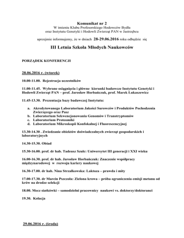 Komunikat nr 2 W imieniu Klubu Profesorskiego Hodowców Bydła oraz Instytutu Genetyki i Hodowli Zwierząt PAN w Jastrzębcu uprzejmie informujemy, że w dniach 28-29.06.2016 roku odbędzie się III Letnia Szkoła Młodych Naukowców PORZĄDEK KONFERENCJI 28.06.2016 r. (wtorek) 10.00-11.00. Rejestracja uczestników 11.00-11.45. Wybrane osiągnięcia i główne kierunki badawcze Instytutu Genetyki i Hodowli Zwierząt PAN – prof. Jarosław Horbańczuk, prof. Marek Łukaszewicz 11.45-13.30. Prezentacja bazy badawczej Instytutu: a. Akredytowanego Laboratorium Jakości Surowców i Produktów Pochodzenia Zwierzęcego oraz Pasz b. Laboratorium Sekwencjonowania Genomów i Transtryptomów c. Laboratorium Proteomiki d. Laboratorium Mikroskopii Konfokalnej i Fluorescencyjnej 13.30-14.30 . Zwiedzanie obiektów doświadczalnych zwierząt gospodarskich i laboratoryjnych 14.30-15.30. Obiad 15.30-16.00. prof. dr hab. Tadeusz Szulc: Uniwersytet III generacji i XXI wieku 16.00-16.30. prof. dr hab. Jarosław Horbańczuk: Znaczenie współpracy międzynarodowej w rozwoju kariery naukowej 16.30-17.00. dr hab. Nina Strzałkowska: Laktoza – prawda i mity 17.00-17.30. dr Marcin Pszczoła: Zielona krowa – próba ograniczenia emisji metanu od krów na drodze selekcji 18.00. Mecz siatkówki – samodzielni pracownicy naukowi vs. doktorzy/doktoranci 19.30. Kolacja 29.06.2016 r. (środa) 900 I Sesja plenarna 1100 Przerwa 1115 II Sesja plenarna 1300 Dyskusja i podsumowanie obrad 1330 Obiad . Koszty uczestnictwa: 300 PLN – opłata normalna, 250 PLN – opłata ulgowa (studenci, doktoranci, pracownicy emerytowani); wpłaty prosimy dokonać do dnia 24.06.2016 roku, z adnotacją: III letnia szkoła młodych naukowców oraz nazwisko osoby za która dokonywana jest wpłata. Konto BGK: 05 1130 1017 0020 1469 8820 0001 Uczestnictwo jednego doktoranta i jednego doktora, z każdej jednostki naukowej, czynnie biorącego udział w konferencji jest bezpłatne. Przewodniczący Komitetu Organizacyjnego dr hab. Jolanta Oprządek prof. IGHZ