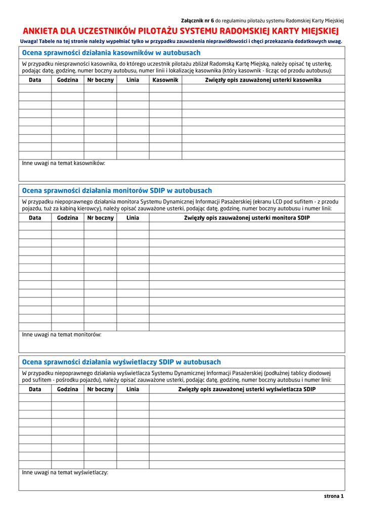 Załącznik nr 6 do regulaminu pilotażu systemu Radomskiej Karty Miejskiej ANKIETA DLA UCZESTNIKÓW PILOTAŻU SYSTEMU RADOMSKIEJ KARTY MIEJSKIEJ Uwaga! Tabele na tej stronie należy wypełniać tylko w przypadku zauważenia nieprawidłowości i chęci przekazania dodatkowych uwag. Ocena sprawności działania kasowników w autobusach W przypadku niesprawności kasownika, do którego uczestnik pilotażu zbliżał Radomską Kartę Miejską, należy opisać tę usterkę, podając datę, godzinę, numer boczny autobusu, numer linii i lokalizację kasownika (który kasownik - licząc od przodu autobusu): Data Godzina Nr boczny Linia Kasownik Zwięzły opis zauważonej usterki kasownika Inne uwagi na temat kasowników: Ocena sprawności działania monitorów SDIP w autobusach W przypadku niepoprawnego działania monitora Systemu Dynamicznej Informacji Pasażerskiej (ekranu LCD pod sufitem - z przodu pojazdu, tuż za kabiną kierowcy), należy opisać zauważone usterki, podając datę, godzinę, numer boczny autobusu i numer linii: Data Godzina Nr boczny Linia Zwięzły opis zauważonej usterki monitora SDIP Inne uwagi na temat monitorów: Ocena sprawności działania wyświetlaczy SDIP w autobusach W przypadku niepoprawnego działania wyświetlacza Systemu Dynamicznej Informacji Pasażerskiej (podłużnej tablicy diodowej pod sufitem - pośrodku pojazdu), należy opisać zauważone usterki, podając datę, godzinę, numer boczny autobusu i numer linii: Data Godzina Nr boczny Linia Zwięzły opis zauważonej usterki wyświetlacza SDIP Inne uwagi na temat wyświetlaczy: strona 1 Uwaga! Poniższą tabelkę należy wypełniać tylko w przypadku zauważenia nieprawidłowości oraz chęci przekazania dodatkowych uwag. Ocena sprawności działania zapowiedzi głosowych w autobusach W przypadku niepoprawnego działania głosowych zapowiedzi przystanków, należy opisać te usterki, podając datę, godzinę, numer boczny autobusu i numer linii. Za niepoprawne należy uznawać zapowiedzi zbyt ciche, niezsynchronizowane z wyświetlaczami itp. Data Godzina Nr boczny Linia Zwięzły opis nieprawidłowości w działaniu zapowiedzi głosowych Inne uwagi na temat zapowiedzi głosowych: Uwaga! Poniższą tabelkę należy wypełniać w przypadku każdej kontroli biletów, podczas której sprawdzano pasażerowi Kartę Miejską. Wykaz i opis kontroli Radomskiej Karty Miejskiej w autobusach W tej tabeli należy opisać wszystkie kontrole Karty Miejskiej, podając datę, godzinę, numer boczny autobusu i numer linii: Data Godzina Nr boczny Linia Odczyt karty przez kontrolera * Opis problemu (awaria czytnika itp.) bez problemów / z problemami * bez problemów / z problemami * bez problemów / z problemami * bez problemów / z problemami * bez problemów / z problemami * bez problemów / z problemami * bez problemów / z problemami * bez problemów / z problemami * bez problemów / z problemami * Inne uwagi na temat kontroli Radomskiej Karty Miejskiej: WYCIĄG Z REGULAMINU PILOTAŻU SYSTEMU KARTY MIEJSKIEJ W RADOMIU: Po zakończeniu każdego miesiąca kalendarzowego w czasie trwania pilotażu, nie później niż do 7 dnia miesiąca następnego, uczestnicy są zobowiązani do wypełnienia ankiety dotyczącej funkcjonowania Systemu Karty Miejskiej (…). Formularze ankiet będą wydawane przy okazji kodowania na kartach biletów sieciowych. Prawidłowo wypełnione ankiety będą przyjmowane w Dziale TaryfowoBiletowym w siedzibie MZDiK w Radomiu przy ulicy Traugutta 30/30A (pokój 17) oraz w firmowych punktach MZDiK w Radomiu przy ulicach Traugutta 2 i Malczewskiego 15. (…) Uczestnicy pilotażu mogą, poza obowiązkowymi ankietami, dostarczać MZDiK w formie pisemnej dodatkowe informacje, uwagi i spostrzeżenia dotyczące funkcjonowania Systemu Karty Miejskiej i Systemu Dynamicznej Informacji Pasażerskiej. Pięciu najbardziej aktywnych uczestników zostanie przez organizatora nagrodzonych po zakończeniu pilotażu. Informację o nagrodach dla najbardziej aktywnych uczestników pilotażu MZDiK poda w informacji opublikowanej na głównej stronie serwisu internetowego pod adresem www.mzdik.pl. UWAGI DLA UCZESTNIKÓW PILOTAŻU WYPEŁNIAJĄCYCH NINIEJSZĄ ANKIETĘ: Ankiety należy wypełniać w miarę czytelnie i starannie! Prosimy o nieskładanie kartki więcej razy niż na pół i o niewypełnianie jej podczas jazdy autobusu - nieczytelnie wypełniona ankieta może być później trudna do odczytania i właściwego przeanalizowania. Uwaga! W przypadku wyczerpania się miejsca w którejkolwiek tabeli ankiety, należy zakończyć wypełnianie danego egzemplarza (nawet wtedy, jeżeli w pozostałych tabelach zostały jeszcze wolne miejsca), wpisać poniżej datę zakończenia i rozpocząć wypełnianie następnego egzemplarza ankiety, wpisując na nim nową datę rozpoczęcia, będącą kontynuacją wcześniej zakończonego okresu. DANE DO OBOWIĄZKOWEGO WYPEŁNIENIA PRZED ODDANIEM ANKIETY DO ORGANIZATORA PILOTAŻU (MZDiK) IMIĘ I NAZWISKO UCZESTNIKA PILOTAŻU Numer Radomskiej Karty Miejskiej uczestnika Okres, którego dotyczy ten egzemplarz ankiety od dnia: do dnia: strona 2