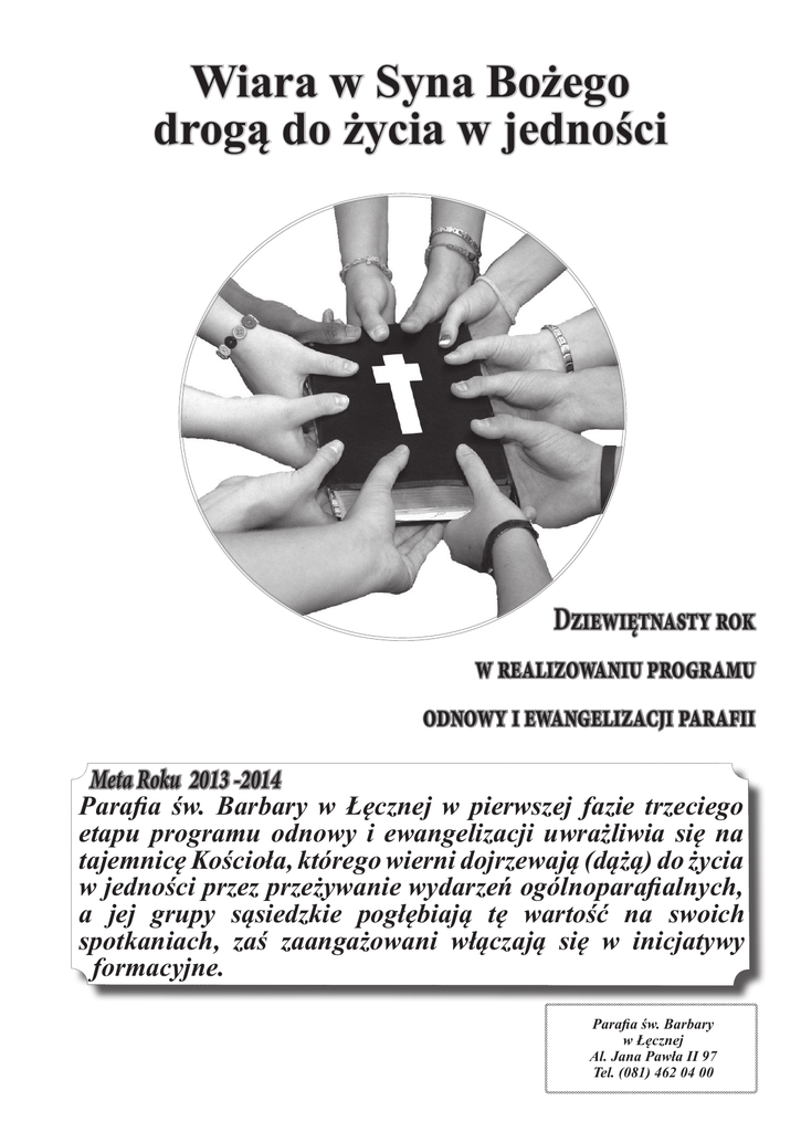 Wiara w Syna Bożego drogą do życia w jedności Dziewiętnasty rok w realizowaniu programu odnowy i ewangelizacji parafii Meta Roku 2013 -2014 Parafia św. Barbary w Łęcznej w pierwszej fazie trzeciego etapu programu odnowy i ewangelizacji uwrażliwia się na tajemnicę Kościoła, którego wierni dojrzewają (dążą) do życia w jedności przez przeżywanie wydarzeń ogólnoparafialnych, a jej grupy sąsiedzkie pogłębiają tę wartość na swoich spotkaniach, zaś zaangażowani włączają się w inicjatywy formacyjne. Parafia św. Barbary w Łęcznej Al. Jana Pawła II 97 Tel. (081) 462 04 00 Program Duszpasterski Słowo Ks. Proboszcza Rozpoczynamy kolejny Rok Duszpasterski w naszej Parafii. Lata realizacji Parafialnego Programu Odnowy i Ewangelizacji (PPOE) ukazują nam jak żmudne jest budowanie Kościoła, którego wierni żyją w jedności i stają się świadkami prawdziwej wiary wobec świata. Kolejny rok duszpasterski to kolejny krok w realizacji programu i zarazem kolejna okazja, aby doświadczyć jak Bóg pragnie utworzyć z nas swój Kościół. Chcemy odkryć, Kościół, którego wierni dążą do jedności. Naszym krokiem będzie zrozumienie, przyjęcie i wyrażenie chęci budowania jedności w wierze z innymi. Widzimy jak świat pragnie nas dzielić na Kościół toruński i Kościół łagiewnicki, Kościół ks. Lemańskiegio i ks. bp. Hozera, Kościół papieża Franciszka i ks. Kurii Rzymskiej, Kościół duchowieństwa i Kościół świeckich i wiele tym podobnych podziałów. A Jezus mówi: Oby byli jedno. Nich słowa Chrystusa stają się dla nas wezwaniem i zaproszeniem do budowania takiej Parafii, w której żyjemy w jedności. Budowanie tej jedności i dążenie do niej jest wyznacznikiem naszej wiary – na ile my wierzymy w Syna Bożego i Jego słowom. Poziom 0 O C E N A R O K U D U S Z PA S T E R S K I E G O 2012/2013 OCENA DUSZPASTERSTWA GRUP SĄSIEDZKICH Znaki wzrostu • W parafii istnieje ok. 80 grup sąsiedzkich, animowanych przez doświadczonych Posłańców. Znaki wzrostu z kilku lat Słowo ks. Proboszcza OCENA DUSZPASTERSTWA OGÓLNEGO Znaki wzrostu • Większa precyzja w programowaniu i realizacji wydarzeń: jasne określenie gestu wydarzenia, aby był możliwy do wykonania przez wszystkich parafian. • Wydarzenia dawały szczególną okazję wyjścia do nowych rodzin w parafii, podzielenia się wartością wspólnej drogi ewangelizacji i zaproszenia do udziału w niej. Znaki wzrostu z kilku lat • Precyzyjna i skuteczna praca PZK: wzrost we wzajemnej komunikacji, organizowaniu wydarzeń i dzieleniu odpowiedzialności. • Liturgia przygotowywana na wydarzenia parafialne jest na wysokim poziomie, te same teksty na wszystkich Mszach św., co umacnia jedność wspólnoty parafialnej. • Wzrosła świadomość odpowiedzialności osobistej i wspólnotowej za realizowany program odnowy wśród zaangażowanych. Wykaz problemów • Część parafian nie angażuje się w propozycje ewangelizacyjne: nowe rodziny, które nie znają jeszcze lub nie chcą znać z wyboru drogi odnowy i budowania wspólnoty w parafii. • Trudność uzyskania rzetelnej informacji zwrotnej od wspólnot sąsiedzkich. Miejsca rodzące najistotniejsze problemy • Rodzina: Emigracja zarobkowa, której skutkiem często jest rozbicie rodzin; rodzice często nie biorą odpowiedzialności za wychowanie dzieci w duchu wiary i wprowadzenia do wspólnoty Kościoła, tendencje indywidualistyczne: Nie potrzebuję wspólnoty. • Przepływ komunikacji o wydarzeniach: Podrejonowi - Posłańcy: część rodzin nie otrzymuje na czas lub wcale listu do parafian. • Społeczeństwo: pogłębiająca się sekularyzacja, wyśmiewanie Kościoła i wartości ewangelicznych. Ocena stopnia osiągnięcia mety • Wspólnota parafialna realizując wszystkie wydarzenia została uwrażliwiona na wartości roku: Odkrycie na nowo, że przez wspólne wyznanie wiary parafianie tworzą jedną rodzinę dzieci Bożych; pozdrowienie w sąsiedztwie podczas Adwentu, znaczące zaangażowanie się parafian w przeprowadzenie wyborów do Rady Duszpasterskiej: na 108 radnych tylko w kilkunastu miejscach potrzeba było pomocy duszpasterzy; uwrażliwienie na potrzebę darowania urazów i nieustannego poprawiania relacji w rodzinie i sąsiedztwie. 3 Ocena roku 2012/2013 Książka Roku 2013/2014 • Znaczna część Posłańców od wielu już lat prowadzi systematyczne spotkania wspólnot sąsiedzkich. Wykaz problemów • Wielu Posłańców nie podejmuje proponowanej formacji duchowo - duszpasterskiej podczas rekolekcji rocznych. Miejsca rodzące najistotniejsze problemy • Zmniejsza się ilość rodzin uczestniczących w spotkaniach biblijnych – niechęć do włączenia się w ten rodzaj formacji osób nowych, zdarza się, że grupy kończą formację z powodu odchodzenia kolejno poszczególnych jej ich członków. Ocena stopnia osiągnięcia mety • Na wszystkie spotkania sąsiedzkie przygotowane zostały konspekty, odbyły się również spotkania formacyjne i rekolekcje roczne jako pomoc dla animatorów grup w ich służbie duszpasterskiej. • Wartość roku duszpasterskiego została pogłębiona przez grupy sąsiedzkie: pogłębienie tajemnicy Kościoła jako znaku zjednoczenia, który potrafi zaciekawić się innymi ludźmi przez dzielenie się życiem, rozważanie słowa Bożego, umocnienie przez wspólne porównanie życia z proponowaną wartością oraz systematyczne podejmowanie drogi formacji według tej wartości w codziennym życiu i zdawanie sprawy z niej we wspólnocie sąsiedzkiej. OCENA DUSZPASTERSTW ŚRODOWISKOWYCH Znaki wzrostu • Duszpasterstwa środowiskowe, zgodnie z celem roku, doświadczyły, że dzieląc się swoimi charyzmatami mogą budować jedność między sobą i w całej wspólnocie parafialnej. • Programowanie inicjatyw w czerwcu 2012 pozwoliło na określenie sposobów i rodzaju współpracy między poszczególnymi wspólnotami formacyjnymi (poziom II) i wspólnot ze służb