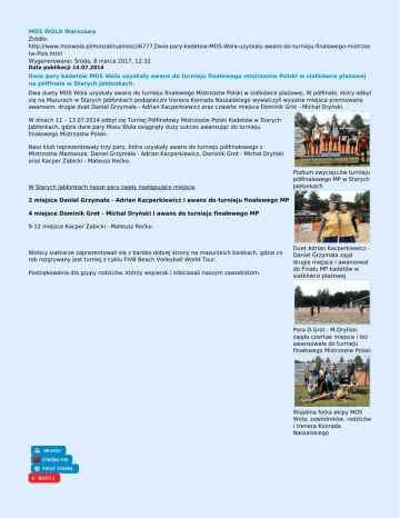 MOS WOLA Warszawa Źródło: http://www.moswola.pl/mos/aktualnosci/6777,Dwie-pary-kadetow-MOS-Wola-uzyskaly-awans-do-turnieju-finalowego-mistrzos tw-Pols.html Wygenerowano: Środa, 8 marca 2017, 12:32 Data publikacji 14.07.2014 Dwie pary kadetów MOS Wola uzyskały awans do turnieju finałowego mistrzostw Polski w siatkówce plażowej na półfinale w Starych Jabłonkach. Dwa duety MOS Wola uzyskały awans do turnieju finałowego Mistrzostw Polski w siatkówce plażowej. W półfinale, który odbył się na Mazurach w Starych Jabłonkach podopieczni trenera Konrada Nassalskiego wywalczyli wysokie miejsca premiowane awansem: drugie duet Daniel Grzymała - Adrian Kacperkiewicz oraz czwarte miejsce Dominik Grot - Michał Dryński. W dniach 11 – 13.07.2014 odbył się Turniej Półfinałowy Mistrzostw Polski Kadetów w Starych Jabłonkach, gdzie dwie pary Mosu Wola osiągnęły duży sukces awansując do turnieju finałowego Mistrzostw Polski. Nasz klub reprezentowały trzy pary, które uzyskały awans do turnieju półfinałowego z Mistrzostw Mazowsza: Daniel Grzymała - Adrian Kacperkiewicz, Dominik Grot - Michał Dryński oraz Kacper Żabicki - Mateusz Rećko. W Starych Jabłonkach nasze pary zajęły następujące miejsca: Podium zwycięzców turnieju półfinałowego MP w Starych Jabłonkach 2 miejsce Daniel Grzymała - Adrian Kacperkiewicz i awans do turnieju finałowego MP 4 miejsce Dominik Grot - Michał Dryński i awans do turnieju finałowego MP 9-12 miejsce Kacper Żabicki - Mateusz Rećko. Wolscy siatkarze zaprezentowali się z bardzo dobrej strony na mazurskich boiskach, gdzie co rok rozgrywany jest turniej z cyklu FIVB Beach Volleyball World Tour. Podziękowania dla grupy rodziców, którzy wspierali i kibicowali naszym zawodnikom. Duet Adrian Kacperkiewicz Daniel Grzymała zajął drugie miejsce i awansował do Finału MP kadetów w siatkówce plażowej Para D.Grot - M.Dryński zajęła czwrtae miejsce i też awansowała do turnieju finałowego Mistrzostw Polski Wspólna fotka ekipy MOS Wola: zawodników, rodziców i trenera Konrada Nassalskiego Komentarz (0) dodaj komentarz Brak komentarzy dodaj komentarz