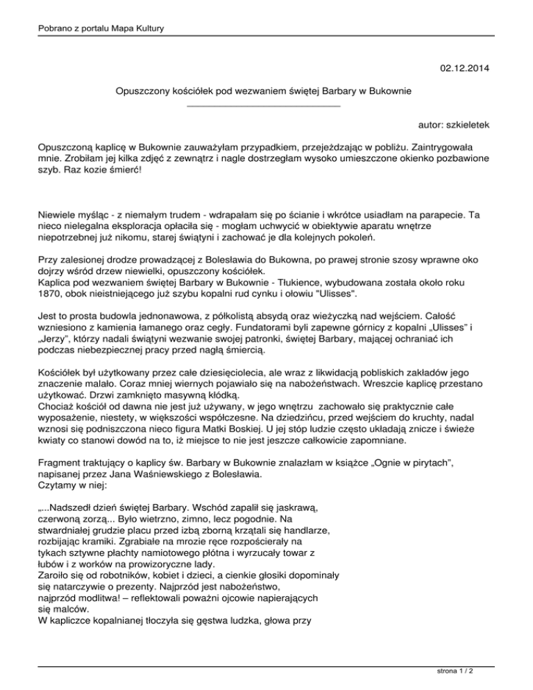 Pobrano z portalu Mapa Kultury 02.12.2014 Opuszczony kościółek pod wezwaniem świętej Barbary w Bukownie ____________________________ autor: szkieletek Opuszczoną kaplicę w Bukownie zauważyłam przypadkiem, przejeżdzając w pobliżu. Zaintrygowała mnie. Zrobiłam jej kilka zdjęć z zewnątrz i nagle dostrzegłam wysoko umieszczone okienko pozbawione szyb. Raz kozie śmierć! Niewiele myśląc - z niemałym trudem - wdrapałam się po ścianie i wkrótce usiadłam na parapecie. Ta nieco nielegalna eksploracja opłaciła się - mogłam uchwycić w obiektywie aparatu wnętrze niepotrzebnej już nikomu, starej świątyni i zachować je dla kolejnych pokoleń. Przy zalesionej drodze prowadzącej z Bolesławia do Bukowna, po prawej stronie szosy wprawne oko dojrzy wśród drzew niewielki, opuszczony kościółek. Kaplica pod wezwaniem świętej Barbary w Bukownie - Tłukience, wybudowana została około roku 1870, obok nieistniejącego już szybu kopalni rud cynku i ołowiu "Ulisses". Jest to prosta budowla jednonawowa, z półkolistą absydą oraz wieżyczką nad wejściem. Całość wzniesiono z kamienia łamanego oraz cegły. Fundatorami byli zapewne górnicy z kopalni „Ulisses” i „Jerzy”, którzy nadali świątyni wezwanie swojej patronki, świętej Barbary, mającej ochraniać ich podczas niebezpiecznej pracy przed nagłą śmiercią. Kościółek był użytkowany przez całe dziesięciolecia, ale wraz z likwidacją pobliskich zakładów jego znaczenie malało. Coraz mniej wiernych pojawiało się na nabożeństwach. Wreszcie kaplicę przestano użytkować. Drzwi zamknięto masywną kłódką. Chociaż kościół od dawna nie jest już używany, w jego wnętrzu zachowało się praktycznie całe wyposażenie, niestety, w większości współczesne. Na dziedzińcu, przed wejściem do kruchty, nadal wznosi się podniszczona nieco figura Matki Boskiej. U jej stóp ludzie często układają znicze i świeże kwiaty co stanowi dowód na to, iż miejsce to nie jest jeszcze całkowicie zapomniane. Fragment traktujący o kaplicy św. Barbary w Bukownie znalazłam w książce „Ognie w pirytach”, napisanej przez Jana Waśniewskiego z Bolesławia. Czytamy w niej: „...Nadszedł dzień świętej Barbary. Wschód zapalił się jaskrawą, czerwoną zorzą... Było wietrzno, zimno, lecz pogodnie. Na stwardniałej grudzie placu przed izbą zborną krzątali się handlarze, rozbijając kramiki. Zgrabiałe na mrozie ręce rozpościerały na tykach sztywne płachty namiotowego płótna i wyrzucały towar z łubów i z worków na prowizoryczne lady. Zaroiło się od robotników, kobiet i dzieci, a cienkie głosiki dopominały się natarczywie o prezenty. Najprzód jest nabożeństwo, najprzód modlitwa! – reflektowali poważni ojcowie napierających się malców. W kapliczce kopalnianej tłoczyła się gęstwa ludzka, głowa przy strona 1 / 2 Pobrano z portalu Mapa Kultury głowie. Buchnęła długa tradycyjna pieśń do Świętej Barbary. Nieuczony chór huczał modlitwą, w której prężyło się dostojeństwo twardej jak granit pracy, przewijała prośba o odwrócenie nieszczęścia, dźwięczała silna wiara ludzi, co od pokoleń dzień po dniu schodzili w podziemia grążyć twarde skaliska wśród mroku, w trudzie i pod grozą śmierci... (...) Między czarnym mrowiem ludzkim snuło się kilkunastu górników w paradnych czarnych uniformach. Złote guziki biegły im dwoma skośnymi rzędami od piersi ku klamrze pasa. Lśniące pióropusze ich małych okrągłych czapeczek trzęsły się na wietrze...” Kościółek świętej Barbary, chociaż jest jednym z ostatnich górniczych symboli w okolicy, znajduje się dziś w nie najlepszym stanie. Nie wiadomo, jak długo jeszcze przetrwa bez remontu... strona 2 / 2