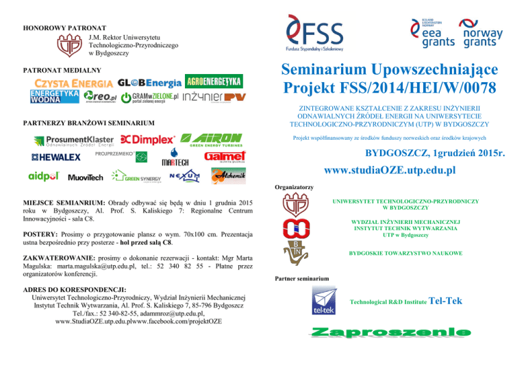 HONOROWY PATRONAT J.M. Rektor Uniwersytetu Technologiczno-Przyrodniczego w Bydgoszczy PATRONAT MEDIALNY PARTNERZY BRANŻOWI SEMINARIUM Seminarium Upowszechniające Projekt FSS/2014/HEI/W/0078 ZINTEGROWANE KSZTAŁCENIE Z ZAKRESU INŻYNIERII ODNAWIALNYCH ŹRÓDEŁ ENERGII NA UNIWERSYTECIE TECHNOLOGICZNO-PRZYRODNICZYM (UTP) W BYDGOSZCZY Projekt współfinansowany ze środków funduszy norweskich oraz środków krajowych BYDGOSZCZ, 1grudzień 2015r. www.studiaOZE.utp.edu.pl Organizatorzy MIEJSCE SEMIANRIUM: Obrady odbywać się będą w dniu 1 grudnia 2015 roku w Bydgoszczy, Al. Prof. S. Kaliskiego 7: Regionalne Centrum Innowacyjności - sala C8. UNIWERSYTET TECHNOLOGICZNO-PRZYRODNICZY W BYDGOSZCZY WYDZIAŁ INŻYNIERII MECHANICZNEJ INSTYTUT TECHNIK WYTWARZANIA UTP w Bydgoszczy POSTERY: Prosimy o przygotowanie plansz o wym. 70x100 cm. Prezentacja ustna bezpośrednio przy posterze - hol przed salą C8. ZAKWATEROWANIE: prosimy o dokonanie rezerwacji - kontakt: Mgr Marta Magulska: [email protected], tel.: 52 340 82 55 - Płatne przez organizatorów konferencji. ADRES DO KORESPONDENCJI: Uniwersytet Technologiczno-Przyrodniczy, Wydział Inżynierii Mechanicznej Instytut Technik Wytwarzania, Al. Prof. S. Kaliskiego 7, 85-796 Bydgoszcz Tel./fax.: 52 340-82-55, [email protected], www.StudiaOZE.utp.edu.plwww.facebook.com/projektOZE BYDGOSKIE TOWARZYSTWO NAUKOWE Partner seminarium Technological R&D Institute Tel-Tek Szanowni Państwo! Mamy zaszczyt zaprosić do uczestnictwa w Seminarium Upowszechniającym Projekt nr FSS/2014/HEI/W/0078 pt.: „Zintegrowane kształcenie z zakresu Inżynierii Odnawialnych Źródeł Energii na Uniwersytecie Technologiczno-Przyrodniczym (UTP) w Bydgoszczy”, który jest realizowany na WIM UTP w Bydgoszczy. Seminarium odbędzie się w dniu 1 grudnia 2015 roku. Podstawowym założeniem przyjętym przez organizatorów Seminarium jest prezentacja celów projektu, jego rezultatów oraz przykładów dobrych praktyk wdrażania instalacji OZE w Polsce i w Norwegii. Wśród prelegentów będą osoby zaangażowane w projekt ze strony polskiej i norweskiej oraz specjaliści z zakresu wybranych instalacji OZE. Celem nadrzędnym jest kontynuacja dotychczasowych działań z zakresu OZE, wymiana doświadczeń, a także dalsza integracja środowiska specjalistów świata nauki i przemysłu, związanych z Odnawialnymi Źródłami Energii. Treść i poziom naukowy Seminarium będą kształtowane poprzez udział Państwa w obradach. Przekonanie to jest zobowiązaniem dla zapewnienia Państwu interesującego programu merytorycznego podczas pobytu w Bydgoszczy. PROGRAM SEMINARIUM Sesja I - sala C8 830-900 Rejestracja uczestników 900-915 Dr hab. inż. Dariusz Boroński - Prorektor ds. Nauki - UTP - Otwarcie Seminarium 915-945 Dr inż. Adam Mroziński Zintegrowane kształcenie z zakresu Inżynierii Odnawialnych Źródeł Energii na UTP w Bydgoszczy 945-1015 Prof. Rune Bakke Good practices in renewable energy sources education 1015-1145 MSc Jon Hovland Biomass engineering - Norwegian perspective MSc Anne Marie Fatnes Project Sustainable Use of Energy Carriers in the KASK Region 45 11 -12 15 1215-1230 Dyskusja 1230-1245 Przerwa kawowa - hol budynku RCI przy sali C8 Sesja II - sala C8 Analiza zmian w programie studiów inżynierskich pn. Inżynieria Doc. dr inż. Franciszek 1245-1310 OZE oraz możliwości zastosowania innowacyjnych narzędzi Bromberek i metod dydaktycznych Ekologiczne systemy grzewcze i grzewczo - chłodnicze 10 35 13 -13 Mgr inż. Adam Koniszewski w budownictwie oparte na pompach ciepła Rola trafności i skuteczności programowych działań projektu Mgr inż. Grażyna Filipczuk1335-1400 w kontekście oczekiwań otoczenia gospodarczego i możliwości Szester ich zaspokojenia Przykłady dobrych praktyk wdrażania instalacji OZE w Polsce 1400-1425 Mgr inż. Tomasz Mania projekt Renewx Wsparcie odbiorcy wrażliwego w aspekcie bezpieczeństwa 1425-1450 Mgr Joanna Kawa energetycznego 1450-1500 Dyskusja 1500-1600 Obiad - Restauracja Akademicka - ul. gen. W. Andersa 1 Sesja III- sala C8 1600-1515 Mgr inż. Michał Szczepański Klaster OZE w województwie kujawsko-pomorskim 1515-1530 Dr inż. Izabela Piasecka 1530-1545 Mgr inż. Łukasz Trzeciak 1545-1600 15 30 16 -16 1615-1630 Dr hab. inż. Dariusz Sykutera Analiza wpływu na środowisko elektrowni wiatrowych Systemy efektywnego magazynowania energii elektrycznej dla mikroinstalacji PV Nowoczesne kompozyty polimerowe w budowie łopat siłowni wiatrowych. Dyskusja Przerwa kawowa - hol budynku RCI przy sali C8 Sesja IV: 1630-1715 - Sesja posterowa - Moderator: Dr inż. Izabela Piasecka (hol przed salą C8) P1 KN Studentów IOZE Prezentacja posterowa na temat działalności Koła P2 KN Studentów TOPgran Prezentacja posterowa na temat działalności Koła Interdyscyplinarne Centrum P3 Prezentacja posterowa na temat działalności ICOZE Odnawialnych Źródeł Energii P4 Projekt norweski Prezentacja posterowa projekt FSS/2014/HEI/W/0078 P5 Studia podyplomowe Prezentacja posterowa na temat SP PCiMEC Weronika Kruszelnicka, Ola Madej, Badanie i ocena środowiskowego oddziaływania elektrowni P6 Dr inż. Izabela Piasecka wiatrowych Weronika Kruszelnicka, Ola Madej, Hybrydowy układ: fotowoltaika - elektrownia wiatrowa jako P7 Dr hab. inż. Andrzej Tomporowski stabilny układ zasilania Dr inż. Izabela Piasecka, Mgr inż. Analiza możliwości wykorzystania nowoczesnego Paulina Ropińska, Weronika P8 instrumentarium badawczego ośrodków sypkich w badaniu Kruszelnicka, Mgr inż. Rafał biomasy Śpiewak Marcin Mądro, Weronika Możliwości magazynowania energii pochodzącej z instalacji P9 Kruszelnicka odnawialnych źródeł energii Mgr inż. Paulina Ropińska, Mgr inż. Przegląd współczesnych rozwiązań konstrukcyjnych ogniw P10 Rafał Śpiewak, Tomasz Kamiński paliwowych Marta Heyse, Patrycja Łosoś, Przegląd najważniejszych narzędzi komputerowego wspomagania P11 Arkadiusz Glaza, Dr inż. Izabela i symulacji instalacji solarnych Piaseck