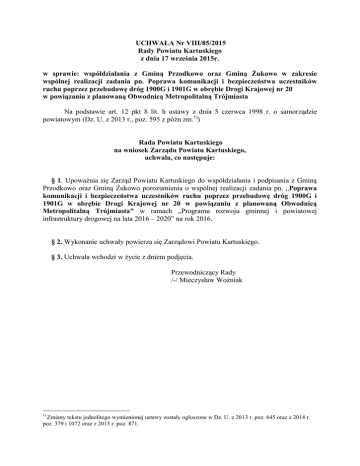 UCHWAŁA Nr VIII/85/2015 Rady Powiatu Kartuskiego z dnia 17 września 2015r. w sprawie: współdziałania z Gminą Przodkowo oraz Gminą Żukowo w zakresie wspólnej realizacji zadania pn. Poprawa komunikacji i bezpieczeństwa uczestników ruchu poprzez przebudowę dróg 1900G i 1901G w obrębie Drogi Krajowej nr 20 w powiązaniu z planowaną Obwodnicą Metropolitalną Trójmiasta Na podstawie art. 12 pkt 8 lit. h ustawy z dnia 5 czerwca 1998 r. o samorządzie powiatowym (Dz. U. z 2013 r., poz. 595 z późn zm.1)) Rada Powiatu Kartuskiego na wniosek Zarządu Powiatu Kartuskiego, uchwala, co następuje: § 1. Upoważnia się Zarząd Powiatu Kartuskiego do współdziałania i podpisania z Gminą Przodkowo oraz Gminą Żukowo porozumienia o wspólnej realizacji zadania pn. „Poprawa komunikacji i bezpieczeństwa uczestników ruchu poprzez przebudowę dróg 1900G i 1901G w obrębie Drogi Krajowej nr 20 w powiązaniu z planowaną Obwodnicą Metropolitalną Trójmiasta” w ramach „Programu rozwoju gminnej i powiatowej infrastruktury drogowej na lata 2016 – 2020” na rok 2016. § 2. Wykonanie uchwały powierza się Zarządowi Powiatu Kartuskiego. § 3. Uchwała wchodzi w życie z dniem podjęcia. Przewodniczący Rady /-/ Mieczysław Woźniak 1) Zmiany tekstu jednolitego wymienionej ustawy zostały ogłoszone w Dz. U. z 2013 r. poz. 645 oraz z 2014 r. poz. 379 i 1072 oraz z 2015 r. poz. 871. Uzasadnienie projektu uchwały w sprawie współdziałania z Gminą Przodkowo oraz Gminą Żukowo w zakresie wspólnej realizacji zadania pn. Poprawa komunikacji i bezpieczeństwa uczestników ruchu poprzez przebudowę dróg 1900G i 1901G w obrębie Drogi Krajowej nr 20 w powiązaniu z planowaną Obwodnicą Metropolitalną Trójmiasta W myśl przywołanych w projekcie przepisów ustawy o samorządzie powiatowym do wyłącznej kompetencji Rady Powiatu należy podejmowanie uchwał w sprawach majątkowych powiatu dotyczących między innymi współdziałania z innymi powiatami i gminami jeżeli związane jest to z koniecznością wydzielenia majątku. Wymienione zadanie obejmuje przebudowę drogi powiatowej 1900G i 1901G przebiegających przez obszar gmin Przodkowo i Żukowo. Celem zaprojektowanej przebudowy jest poprawa dostępności dojazdu do Drogi Krajowej nr 20 i planowanej Obwodnicy Metropolitalnej Trójmiasta, oraz poprawa bezpieczeństwa wszystkich uczestników ruchu. Zakres przedsięwzięcia obejmuje przebudowę odcinka około 2km drogi 1900G od strony Kczewa do skrzyżowania z DK 20 w Miszewie (wcześniej odcinek drogi w Kczewie został przebudowany w ramach NPPDL edycja 2013), oraz przebudowę drogi 1901G na odcinku około 900 mb. w miejscowości Banino tj. od planowanego zjazdu z OMT do skrzyżowania z ulicami Pszenną i Źródlaną gdzie powstanie rondo. Pozostały fragment drogi został przebudowany w ramach NPPDL edycja 2009. W ramach zadania przewiduje się też montaż urządzeń poprawiających bezpieczeństwo ruchu, wykonanie ciągów pieszych, oraz oznakowanie pionowe i poziome. Planowana inwestycja jest niezwykle ważna dla poprawy komunikacji w obrębie DK 20 i planowanej OMT. Z inwestycji korzystać będą na co dzień mieszkańcy Gminy Żukowo i Przodkowo, ale też stanowić ona będzie strategiczne połączenie z Portem Lotniczym i Gdańskiem dla wszystkich mieszkańców Powiatu Kartuskiego. Dzięki przebudowie polepszy się też dostępność do Kartuz. Realizacja przedsięwzięcia połączy odcinki dróg, które dotychczas udało się przebudować, dzięki czemu powstanie jednolite połączenie drogowe wysokiej jakości. Ze względu na wagę i zakres przedsięwzięcia konieczne jest podjęcie współpracy z Gminą Przodkowo i Żukowo w celu wspólnej realizacji projektu poprzez partycypację finansową w kosztach zadania i współpracę merytoryczną w zakresie przygotowania aplikacji oraz wspólną realizację projektu w zakresie uzgodnień technicznych. Opracował: Mateusz Szulc Dyrektor Wydziału Strategii i Rozwoju Powiatu