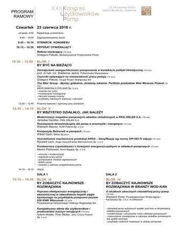 PROGRAM RAMOWY Czwartek 23 czerwca 2016 r. od godz. 8:00 Rejestracja uczestników 8:00 – 10:00 Zagospodarowanie stoisk 9.45 – 10:15 OTWARCIE KONGRESU 10.15 – 10:30 REFERAT OTWIERAJĄCY Referat otwierający (15 min) Grzegorz Pakuła, Stowarzyszenie Producentów Pomp 10:30 – 12:00 BLOK I BY BYĆ NA BIEŻĄCO Zmniejszenie energochłonności pompowania w kontekście polityki klimatycznej (15 min) prof. dr hab. inż. Waldemar Jędral, Politechnika Warszawska Czynniki wpływające na niezawodność pracy pompy (15 min) Grzegorz Pakuła, Grupa Powen-Wafapomp SA The Weir Group - Myśląc globalnie, działamy lokalnie. Portfolio produktów Weir Minerals Poland (15 min) WEIR MINERALS POLAND Sp. z o.o. - nowości na rynku - innowacyjne rozwiązania - kierunki rozwoju branży - przykłady ciekawych realizacji i wdrożeń 12:00 – 12:45 Przerwa kawowa i rozmowy przy stoiskach 12:45 – 14:15 BLOK II BY WSZYSTKO DZIAŁAŁO, JAK NALEŻY Modernizacja zespołów pompowych układów chłodniczych w PKN ORLEN S.A. (15 min) Jarosław Garstka, PKN ORLEN S.A. Rozwiązania termoizolacyjne dla pomp w przemyśle i energetyce (15 min) Wojciech Maurer, SUM Poland Sp. z o.o. Kompozyty Belzona® w pompach (15 min) Witold Gach, Belse Sp.zo.o. Uszczelnienia mechaniczne produkcji ANGA – klasyfikacja wg normy API 682 IV edycja Ryszard Lech, Anga Uszczelnienia Mechaniczne Sp. z o.o. Przetwornice częstotliwości z funkcjami energooszczędnymi w układach pompowych Marcin Piotrowski, Nord Napędy Sp. z o.o. (15 min) (15 min) - remonty i modernizacje - regulacja pracy pomp - pompowanie mediów agresywnych - dobór pomp - nowości z zakresu projektowania pomp 14:15 – 15:15 Obiad SALA 1 15:15 – 16:45 BLOK III BY ZOBACZYĆ NAJNOWSZE ROZWIĄZANIA Poprawa efektywności energetycznej i ekonomicznej w odwodnieniu kopalń węgla kamiennego na przykładzie pompowni poziom 630 KWK Wieczorek (15 min) SALA 2 BLOK IV BY ZOBACZYĆ NAJNOWSZE ROZWIĄZANIA W BRANŻY WOD-KAN O skutkach ubocznych niestabilnej pracy pomp (15 min) Wojciech Koral, Przedsiębiorstwo Wodociągów i Kanalizacji Sp. z o.o. w Gliwicach Przedstawiciel Katowickiego Holdingu Węglowego SA Kompleksowa oferta dla użytkowników i producentów maszyn wirujących (15 min) Antoni Wolski, Piotr Dłutko, John Crane Poland Sp. z o.o. - doświadczenia wybranych spółek wod-kan w eksploatacji układów pompowych - modernizacje i utrzymanie ruchu układów pompowych - nowoczesne rozwiązania w zakresie układów pompowych dla spółek wod-kan - przykłady ostatnich inwestycji w układy pompowe Możliwości zastosowania węży z tworzyw sztucznych Merlett w przykładowych aplikacjach (15 min) Krzysztof Surówka, Merlett Polska Sp. z o.o. Doświadczenia z modernizacji pompowni w Elektrociepłowni "Zielona Góra" S.A. oraz planowane prace nad dalszą jej optymalizacją (15 min) Tomasz Koziołkowski, Elektrociepłownia "Zielona Góra" S.A - modernizacje i utrzymanie ruchu układów pompowych - bieżąca eksploatacja - niezawodność systemów automatyki - optymalizacja i niezawodność - nowoczesne rozwiązania w zakresie napędów - napędy, armatura 16:45 – 17:15 Przerwa kawowa i rozmowy przy stoiskach 17:15 – 18:45 BLOK V BY MIEĆ WSZYSTKO POD KONTROLĄ Eksploatacja obiektów odwodnienia w PGE GiEK S.A. Oddział KWB Turów, a nawalne opady atmosferyczne i ich skutki (15 min) Przedstawiciel PGE GiEK S.A. Oddział Kopalnia Węgla Brunatnego Turów Ewidencja urządzeń i elementów maszyn w górnictwie Marcin Szczurkowski, ELSTA ELEKTRONIKA Sp. z o.o. S.K.A. (15 min) Zamieniamy dobre na lepsze - modernizacja uszczelnień głównych pomp wody chłodzącej na przykładzie pomp diagonalnych SIGMA 2000-BQDV eksploatowanych w Elektrowni Bełchatów (15 min) Zenon Gawronek, AESSEAL Polska Sp. z o.o. Znaczenie narzędzi informatycznych w procesie kontroli pracy układów pompowych w kontekście nowelizacji Ustawy o efektywności energetycznej (15 min) Tomasz Słupik, Energopomiar Sp. z o.o. Przykłady zastosowania systemu sterowania i monitoringu podwodnych agregatów pompowych (15 min) Paweł Lupa, Adam Zwolenik, Multivita Sp. z o.o. - systemy do sterowania i monitoringu pracy pomp - inteligentne układy pompowe - koordynacja prac pompowni - metody diagnostyczne - wykrywane uszkodzeń 18:45 – 19:00 19:00 – 24:00 Rozmowy przy stoiskach KOLACJA, SPOTKANIE INTEGRACYJNE Piątek 24 czerwca 2016 r. 8:00 – 9:00 Śniadanie w miejscu zakwaterowania 9:00 – 10:30 DEBATA BY POCZUĆ ENERGIĘ, BYĆ BARDZIEJ EFEKTYWNYM I ROZUMIEĆ TECHNIKĘ POMPOWĄ MODERATOR: dr inż. Marek Skowroński, Politechnika Wrocławska - POSZANOWANIE ENERGII HYDRAULICZNEJ - ile kosztuje transport i sterowanie? - NIEZAWODNOŚĆ POMP I UKŁADÓW POMPOWYCH - czynniki ryzyka awarii, - EFEKTYWNOŚĆ ENERGETYCZNA POMP I UKŁADÓW - wskaźniki oceny efektywności, - DYNAMIKA UKŁADÓW POMPOWYCH - badania i obliczenia stanów przejściowych, uderzenia hydrauliczne, rozruch układów, stany przejściowe, - PLANOWANIE REMONTÓW I ZAKUPÓW - kiedy wyrzucić starą pompę? optymalizacja kosztowa eksploatacji, - UKŁADY ZMIENNOPARAMETROWE - statystyczne modele pracy układów pompowych, dobór pomp dla zmiennych warunków pracy, - ZARZĄDZANIE AWARIAMI SIECI - symulacja awarii, strategie postępowania w przypadku awarii. 10:30 – 11:00 Demontaż stoisk, wykwaterowanie 11:00 – 12:00 Przejazd do zakładu we własnym zakresie 12:00 – 13:30 WYCIECZKA TECHNICZNA 14:00 – 15:00 Obiad w okolicy zakładu Galeria zdjęć, relacja oraz prezentacje Zdjęcia, relacje z konferencji oraz prezentacje będą publikowane na naszym portalu http://www.kierunekpompy.pl/ Zachęcamy do odwiedzania wersji mobilnej portalu i polubienia nas na: facebook.com / kierunekpompy twitter.com / kierunekpompy * Organizator zastrzega sobie prawo do zmian w programie