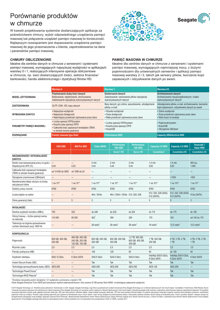 Porównanie produktów w chmurze W kwestii projektowania systemów dostarczających aplikacje za pośrednictwem chmury, wybór odpowiedniego urządzenia pamięci masowej lub połączenia urządzeń pamięci masowej to konieczność. Najlepszym rozwiązaniem jest dopasowanie urządzenia pamięci masowej do jego przeznaczenia u klienta, zapotrzebowania na dane i parametrów pamięci masowej. CHMURY OBLICZENIOWE PAMIĘĆ MASOWA W CHMURZE Idealne dla centrów danych w chmurze z serwerami i systemami pamięci masowej, wymagających najwyższej wydajności w aplikacjach warstwy 0 i 1, realizujących intensywne operacje obliczeniowe w chmurze, np. sieci dostarczających treści, sektora finansów/ bankowości, handlu elektronicznego i dystrybucji filmów HD. Idealne dla centrów danych w chmurze z serwerami i systemami pamięci masowej, wymagających najmniejszej mocy, z dużymi pojemnościami dla uniwersalnych serwerów i aplikacji pamięci masowej warstwy 2 i 3, takich jak serwery plików, tworzenie kopii zapasowych i odzyskiwanie danych po awarii. Warstwa 0 Warstwa 1 Warstwa 2/3 MODEL UŻYTKOWANIA Przetwarzanie dużej ilości danych Buforowanie, rejestrowanie, stronicowanie, indeksowanie najczęściej wykorzystywanych danych Dostarczanie danych Zastosowanie i serwowanie plików najczęściej wykorzystywanych danych Archiwizowanie danych Archiwizowanie nieuporządkowanych, rzadko wykorzystywanych danych ZASTOSOWANIA OLTP, CDN, VDI, bazy danych Bazy danych, gry online, wyszukiwanie, udostępnianie plików, e-mail Udostępnianie plików, e-mail, archiwizowanie, tworzenie kopii zapasowych, odzyskiwanie danych po awarii WYMAGANIA DANYCH • • Wysoka wydajność Duża dostępność • Mała przestrzeń zajmowana przez dane • • Najwyższa wydajność Najwyższa dostępność • Najmniejsza przestrzeń zajmowana przez dane • • • Liczba operacji IOPS/system Koszt/Liczba operacji IOPS • Koszt/GB • • • Performance HDD Capacity HDD/Archive HDD Liczba operacji IOPS/system Koszt/Liczba operacji IOPS • Całkowita ilość zapisanych terabajtów (TBW) w okresie trwania gwarancji • PARAMETRY PAMIĘCI MASOWEJ • ROZWIĄZANIE Pamięć masowa typu flash 1200 SSD 600 Pro SSD Turbo SSHD Dobra wydajność Duża przestrzeń zajmowana przez dane • Niski koszt na terabajt Pojemność/system Koszt/GB • Obciążenie GB/dzień Performance 15K HDD Performance 10K HDD Capacity 2.5 HDD Capacity 3.5 HDD Terascale™/ Value HDD Savvio 15K Savvio 10K Constellation Constellation ES Constellation CS ® ® NIEZAWODNOŚĆ I INTEGRALNOŚĆ DANYCH Średni czas bezawaryjnej pracy (w godz.) — Współczynnik AFR (%) 0,44 — 0,53 2 mln 0,44 2 mln 0,44 2 mln 0,44 1,4 mln 0,62 1,4 mln 0,63 800 tys. 1,065 Całkowita ilość zapisanych terabajtów (TBW) w okresie trwania gwarancji od 14 600 do 3650 od 1080 do 24 — — — — — — Obciążenie znamionowe (GB/dzień) — — — — — — <1500 <500 Nieodwracalne błędy odczytu na liczbę odczytanych bitów 1 na 1016 1 na 1016 1 na 1016 1 na 1016 1 na 1016 1 na 1015 1 na 1015 1 na 1014 Godziny pracy rocznie 8760 8760 8760 8760 8760 8760 8760 8760 512, 520, 528 (SAS) 512e (SATA) 512 (SATA) Liczba bajtów na sektor — — 4Kn / 5XXe 4Kn / 5XXn / 5XXe 512, 520, 528 512, 520, 528 (SAS) 512 (SATA) Okres gwarancji (lata) 5 5 5 5 5 5 5 3 750 520 do 246 do 228 do 204 do 115 do 175 do 180 390 295 170 150 od 140 do 170 28 rad/s2 16 rad/s2 12,5 rad/s2 12,5 rad/s2 1 TB, 500 GB, 250 GB 4 TB, 3 TB, 2 TB, 1 TB 4 TB, 3 TB, 2 TB, 1 TB 2,5 3,5 3,5 do 128 64 Interfejs SAS 6 Gb/s, 6 Gb/s SATA 6 Gb/s SATA Tak Tak WYDAJNOŚĆ Średnia szybkość transferu (MB/s) Odczyt losowy – liczba operacji we/wy na sekundę 110 000 85 000 562* Tolerancja na drgania spowodowane ruchem obrotowym przy 1800 Hz — — 28 rad/s2 28 rad/s2 600 GB, 450 GB, 300 GB† 600 GB, 450 GB, 300 GB KONFIGURACJA Pojemność 800 GB, 400 GB, 200 GB Rozmiar (cale) 2,5 480 GB, 400 GB, 240 GB, 200 GB, 120 GB, 100 GB 2,5 2,5 2,5 1,2 TB, 900 GB, 600 GB, 450 GB, 300 GB 2,5 Pamięć podręczna (MB) — — 128 128 64 Szybkość interfejsu SAS 12 Gb/s 6 Gb/s SATA SAS 6 Gb/s SAS 6 Gb/s SAS 6 Gb/s Instant Secure Erase (ISE) — — Tak Tak Tak 64 Interfejs SAS 6 Gb/s, 6 Gb/s SATA Tak Technologia samoszyfrowania dysku (SED) AES-256 — AES-256 AES-256 AES-256 AES-128 AES-256 — Technologia PowerChoice™ — — Tak Tak Tak Tak Tak Tak Technologia RAID Rebuild™ — — Tak Tak Tak Tak Tak Tak * Docelowy rzeczywisty poziom obciążenia = 2× wydajność w porównaniu z dyskami 15K. †Dysk Seagate Enterprise Turbo SSHD jest hybrydowym dyskiem półprzewodnikowym, który zawiera 32 GB pamięci flash NAND, umożliwiającej zwiększenie wydajności. © 2013 Seagate Technology LLC. Wszelkie prawa zastrzeżone. Wydrukowano w USA. Seagate, Seagate Technology i logo Wave są zastrzeżonymi znakami towarowymi firmy Seagate Technology LLC w Stanach Zjednoczonych i/lub innych krajach. Constellation, PowerChoice, RAID Rebuild, Savvio i Terascale są znakami towarowymi lub zastrzeżonymi znakami towarowymi firmy Seagate Technology LLC lub jednej z jej firm zależnych w Stanach Zjednoczonych i/lub innych krajach. Wszystkie pozostałe znaki towarowe i zastrzeżone znaki towarowe należą do odpowiednich właścicieli. W przypadku oznaczania pojemności dysków, jeden gigabajt (oznaczany także jako „GB”) jest równy jednemu miliardowi bajtów, a jeden terabajt (oznaczany także jako „TB”) jest równy jednemu bilionowi bajtów. W systemie operacyjnym komputera mogą być używane różne standardy pomiarowe i raportowana pojemność może być mniejsza. Ponadto, część podanej pojemności jest używana do formatowania oraz w innych celach i może nie być dostępna do przechowywania danych. Rzeczywiste szybkości transferu danych zależą od środowiska pracy i innych czynników. Eksport i reeksport sprzętu lub oprogramowania szyfrującego może podlegać regulacjom prawnym Biura Przemysłu i Bezpieczeństwa Depar