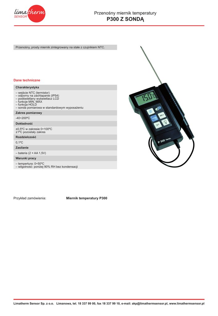 Przenośny miernik temperatury SENSOR P300 Z SONDĄ Przenośny, prosty miernik zintegrowany na stałe z czujnikiem NTC. Dane techniczne Charakterystyka – wejście NTC (termistor) – odporny na zachlapanie (IP54) – podświetlany wyświetlacz LCD – funkcje MIN, MAX – funkcja HOLD – sonda pomiarowa w standardowym wyposażeniu Zakres pomiarowy -40÷200ºC Dokładność ±0,5ºC w zakresie 0÷100ºC ±1ºC pozostały zakres Rozdzielczość 0,1ºC Zasilanie – bateria (2 × AA 1,5V) Warunki pracy – tempertura: 0÷50ºC – wilgotność: poniżej 90% RH bez kondensacji Przykład zamówienia: Miernik temperatury P300 Limatherm Sensor Sp. z o.o. Limanowa, tel. 18 337 99 00, fax 18 337 99 10, e-mail: [email protected], www.limathermsensor.pl