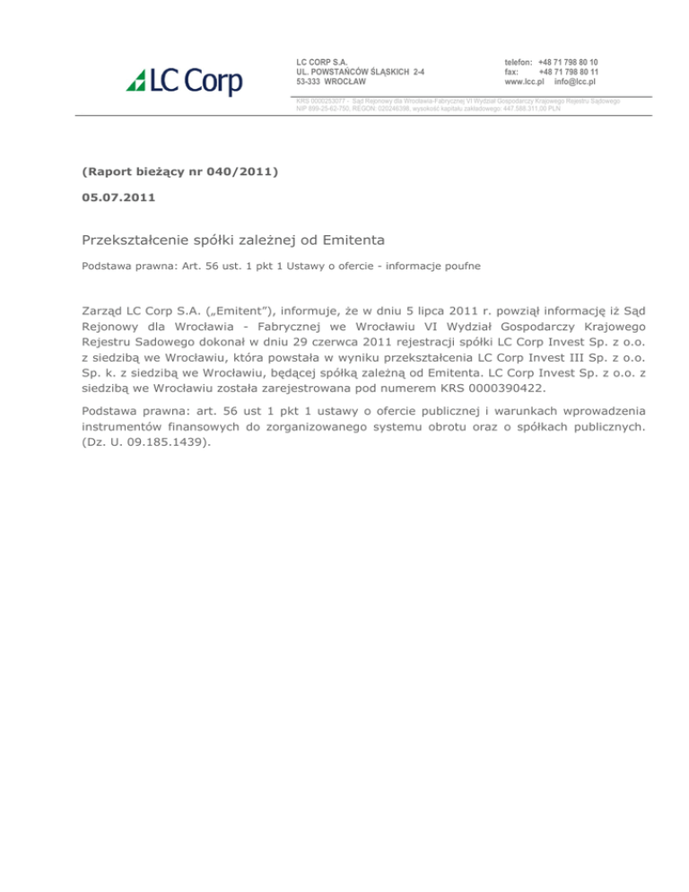 LC CORP S.A. UL. POWSTAŃCÓW ŚLĄSKICH 2-4 53-333 WROCŁAW telefon: +48 71 798 80 10 fax: +48 71 798 80 11 www.lcc.pl [email protected] KRS 0000253077 - Sąd Rejonowy dla Wrocławia-Fabrycznej VI Wydział Gospodarczy Krajowego Rejestru Sądowego NIP 899-25-62-750, REGON: 020246398, wysokość kapitału zakładowego: 447.588.311,00 PLN 1 (Raport bieżący nr 040/2011) 05.07.2011 Przekształcenie spółki zależnej od Emitenta Podstawa prawna: Art. 56 ust. 1 pkt 1 Ustawy o ofercie - informacje poufne Zarząd LC Corp S.A. („Emitent”), informuje, że w dniu 5 lipca 2011 r. powziął informację iż Sąd Rejonowy dla Wrocławia - Fabrycznej we Wrocławiu VI Wydział Gospodarczy Krajowego Rejestru Sadowego dokonał w dniu 29 czerwca 2011 rejestracji spółki LC Corp Invest Sp. z o.o. z siedzibą we Wrocławiu, która powstała w wyniku przekształcenia LC Corp Invest III Sp. z o.o. Sp. k. z siedzibą we Wrocławiu, będącej spółką zależną od Emitenta. LC Corp Invest Sp. z o.o. z siedzibą we Wrocławiu została zarejestrowana pod numerem KRS 0000390422. Podstawa prawna: art. 56 ust 1 pkt 1 ustawy o ofercie publicznej i warunkach wprowadzenia instrumentów finansowych do zorganizowanego systemu obrotu oraz o spółkach publicznych. (Dz. U. 09.185.1439).