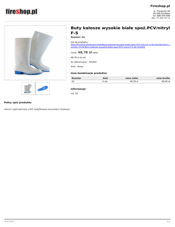 Fireshop.pl ul. Traugutta 9A 49-200 Grodków tel: 888 444 998 fax: 77 415 37 11 Buty kalosze wysokie białe spoż.PCV/nitryl F-S Rozmiar: 42, link do produktu: http://fireshop.pl/obuwie-biale/Buty-kalosze-wysokie-biale-spoz-PCV-nitryl-F-S-42.html?product_r ewrite=1576-Buty-kalosze-wysokie-biale-spoz-PCV-nitryl-F-S-42-525402 Cena: 48,78 zł netto 48,78 zł za szt. Nr referencyjny: 525402 Stan: Nowy Inne kombinacje produktu: Rozmiar ilość cena netto cena brutto 42 0 szt. 48,78 zł 60,00 zł Informacje: roz. 42 Pełny opis produktu wierzch i spód wykonany z PVC modyfikowany kauczukiem nitrylowym 8-03-2017 1/1