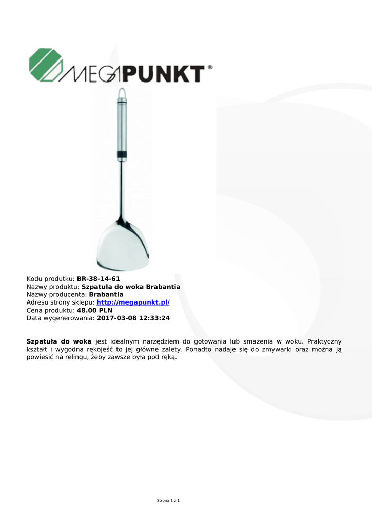 Kodu produtku: BR-38-14-61 Nazwy produktu: Szpatuła do woka Brabantia Nazwy producenta: Brabantia Adresu strony sklepu: http://megapunkt.pl/ Cena produktu: 48.00 PLN Data wygenerowania: 2017-03-08 12:33:24 Szpatuła do woka jest idealnym narzędziem do gotowania lub smażenia w woku. Praktyczny kształt i wygodna rękojeść to jej główne zalety. Ponadto nadaje się do zmywarki oraz można ją powiesić na relingu, żeby zawsze była pod ręką. Strona 1 z 1