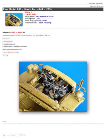 Informacje o produkcie Utworzono 08-03-2017 Plus Model 201 - Horch 1a - silnik (1/35) Cena : 79,00 PLN Producent : Plus Model (Czech) Dostępność : Jest Stan magazynowy : niski Średnia ocena : brak recenzji Plus Model 201 - Horch 1a - silnik (1/35) Wysokiej jakości żywiczne elementy do modeli plastikowych firmy Tamiya lub Italeri. Skala 1/35. Zestaw zawiera: ● 32 części z żywicy ● elementy fototrawione ● szczegółowa instrukcja ● kolorowe pudełko o wymiarach 10,5cm x 8,5cm Uwaga: zestaw nie zawiera kleju i farb. Producent: Plus Model (Czechy) Polecamy! ***** Wygenerowano w programie www.oscGold.com